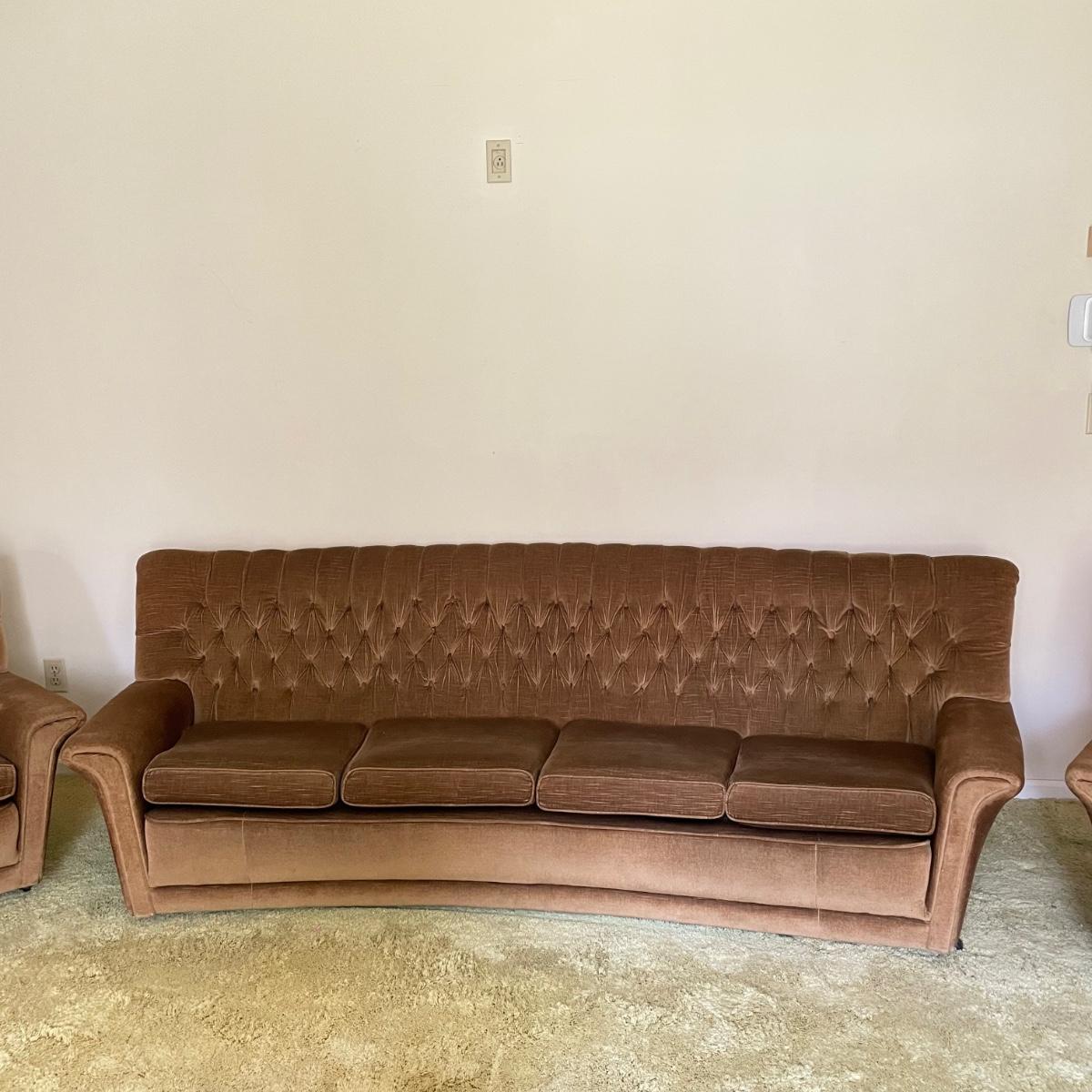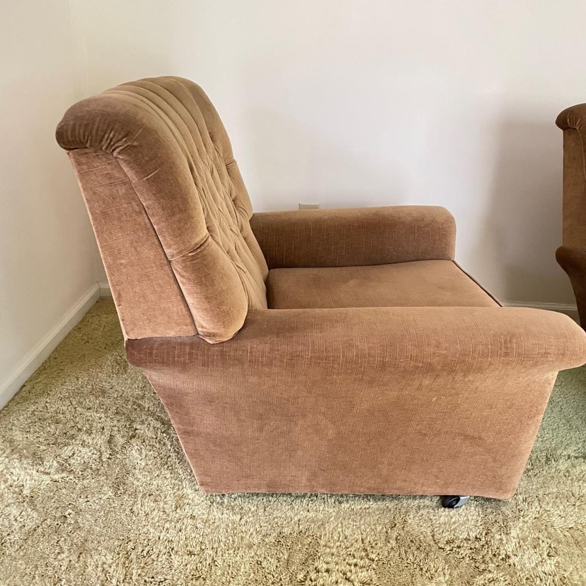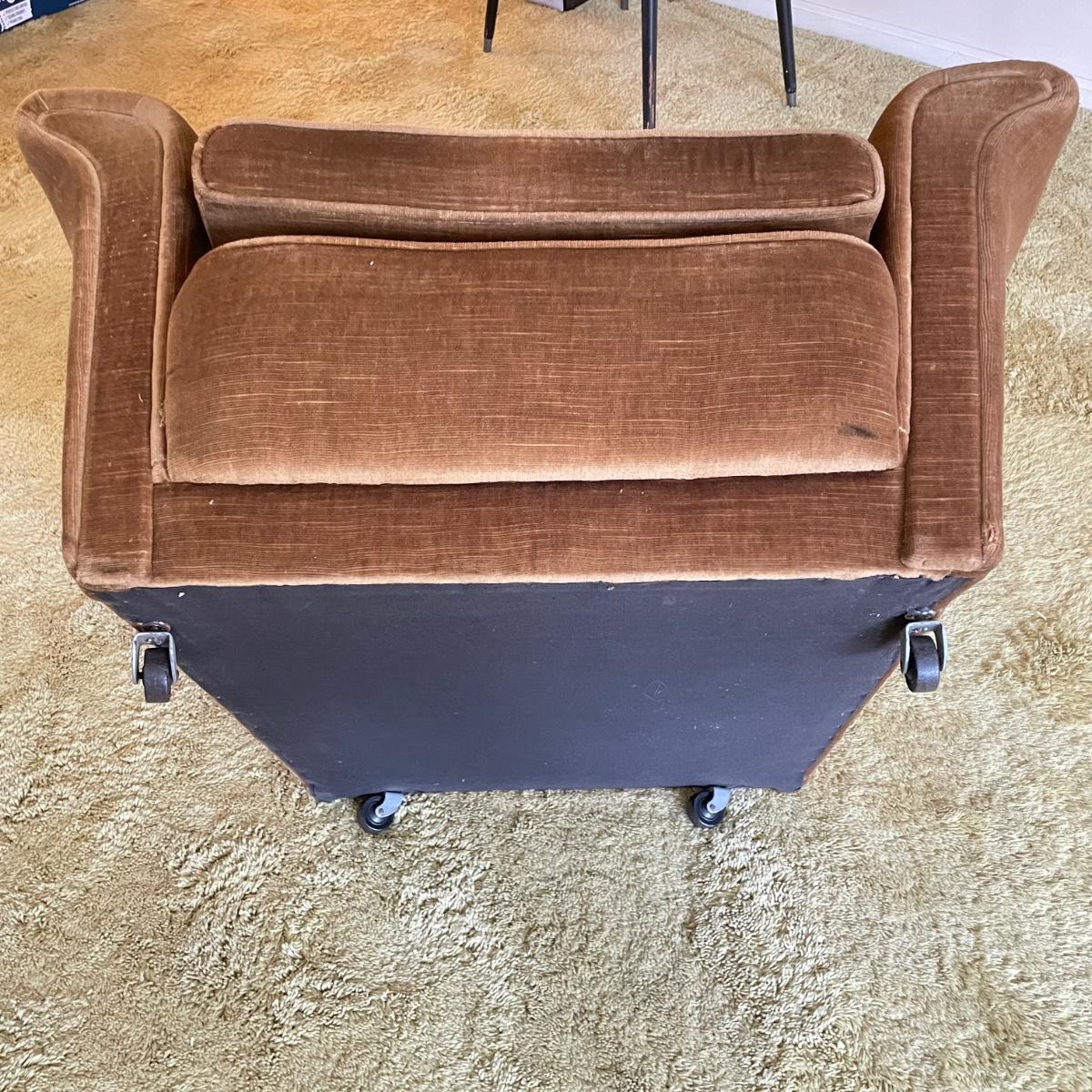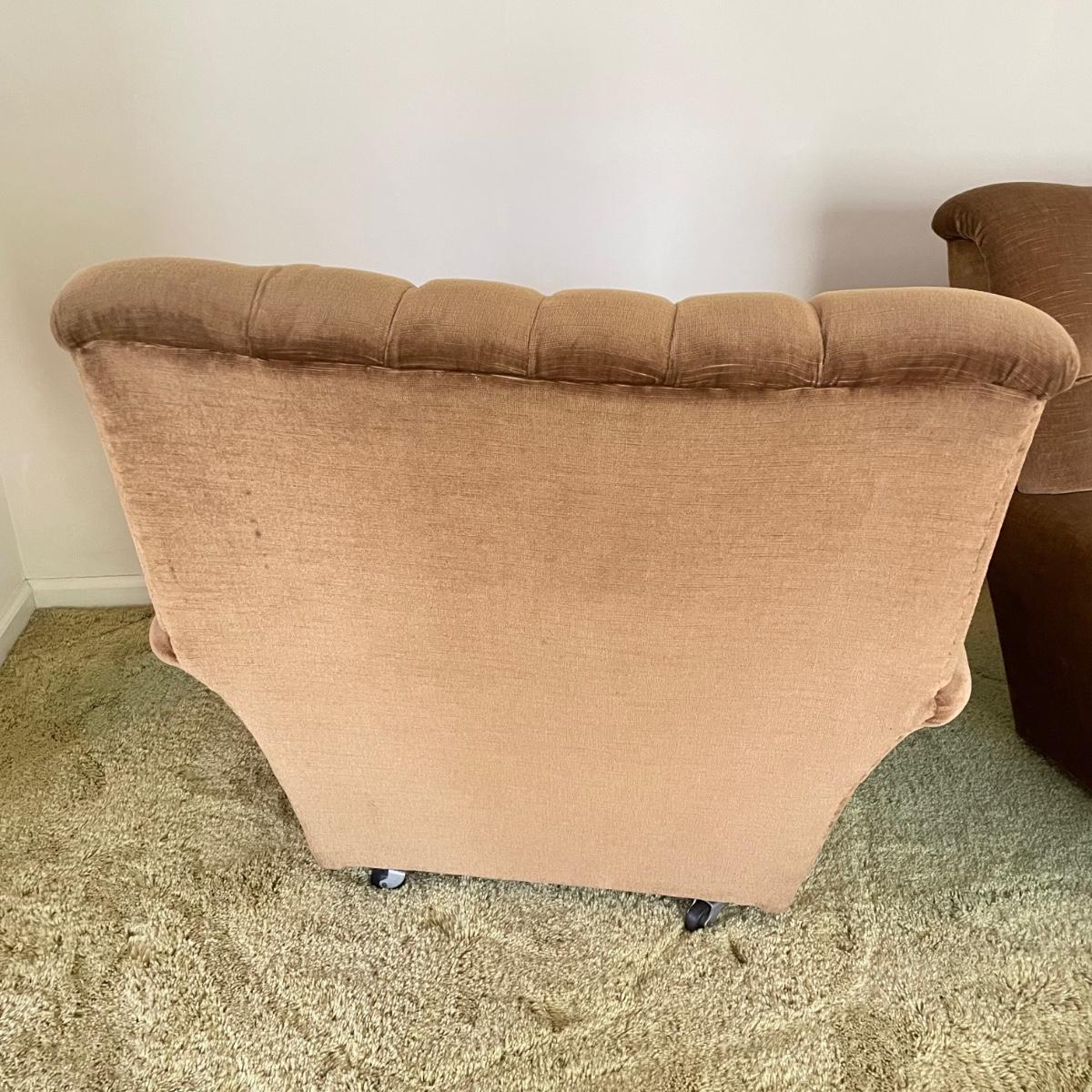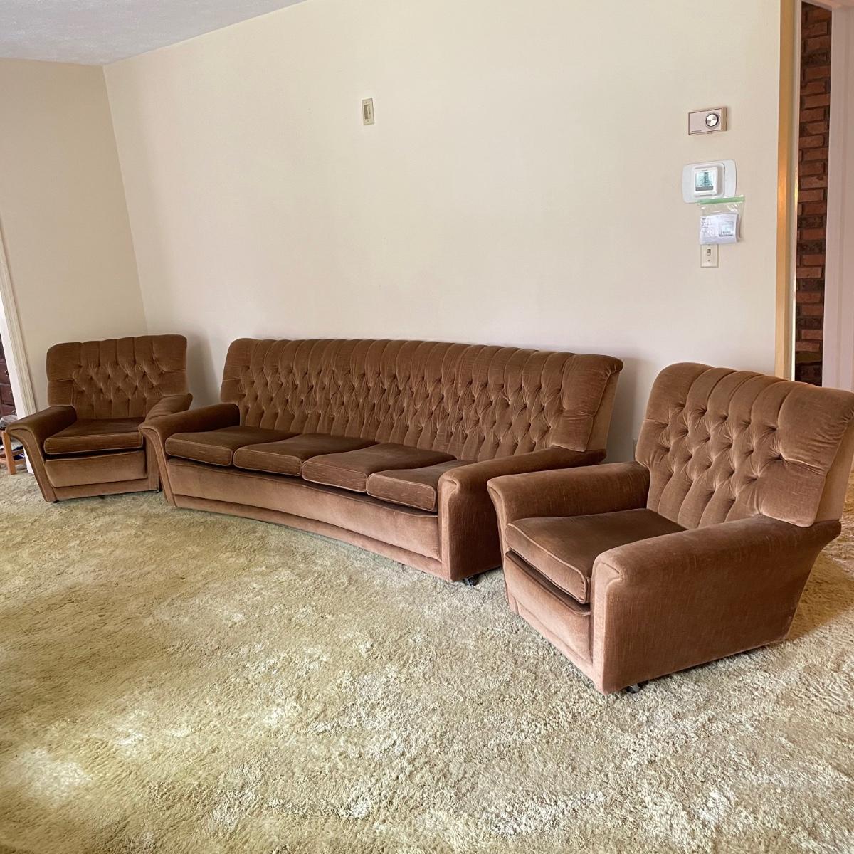 This vintage three piece set is in amazing shape for its age and also comfortable! The furniture has a soft, velvety feel, we were told it is Dralon. The shade of brown is a bit bolder than what is shown in the images. It’s that classic gold/brown or dark mustard retro color. Each piece has four wheels that work well on carpet. There are some minor blemishes here and there, see images. Couch measures 98” x 36” x 30” with a seat height at 16.5”. The chairs each measure 34” x 31” x 31” with a seat height at 16”. Please bring help to load, house is a split level and you will need to go down a half flight of stairs. Local pick up only.