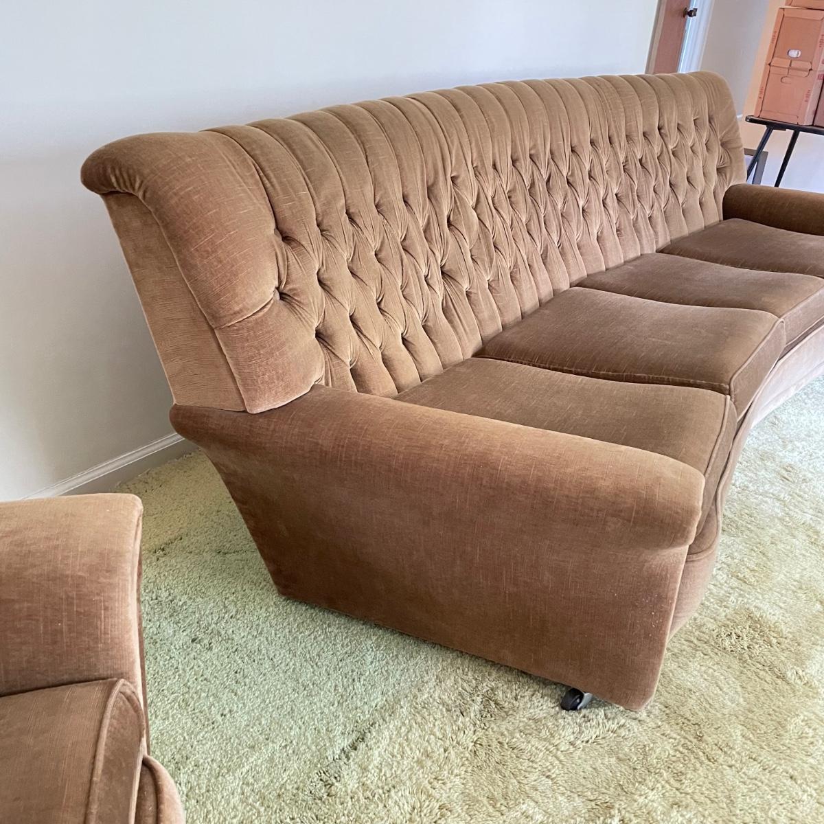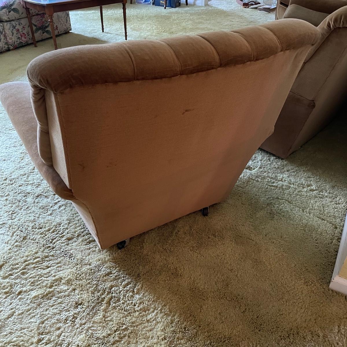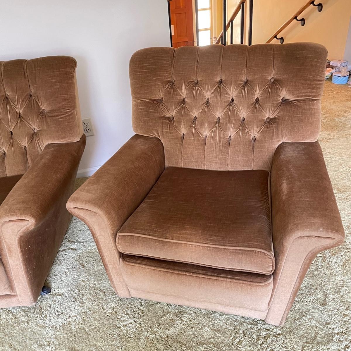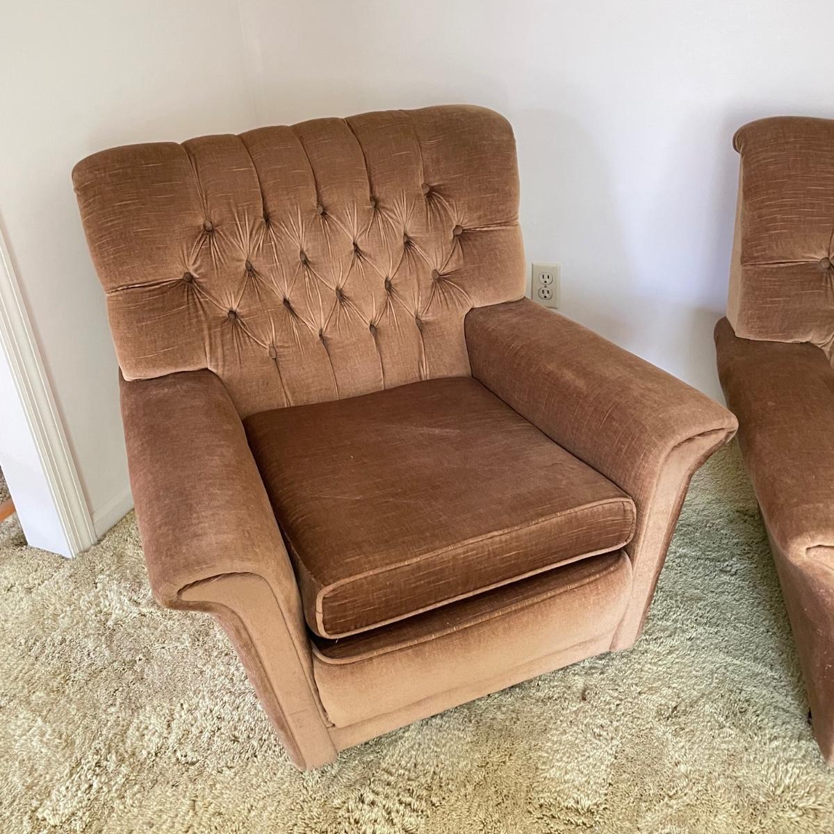 This vintage three piece set is in amazing shape for its age and also comfortable! The furniture has a soft, velvety feel, we were told it is Dralon. The shade of brown is a bit bolder than what is shown in the images. It’s that classic gold/brown or dark mustard retro color. Each piece has four wheels that work well on carpet. There are some minor blemishes here and there, see images. Couch measures 98” x 36” x 30” with a seat height at 16.5”. The chairs each measure 34” x 31” x 31” with a seat height at 16”. Please bring help to load, house is a split level and you will need to go down a half flight of stairs. Local pick up only.