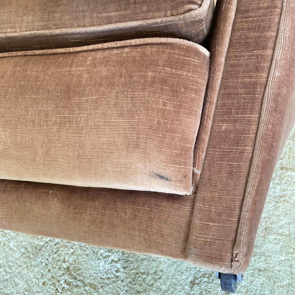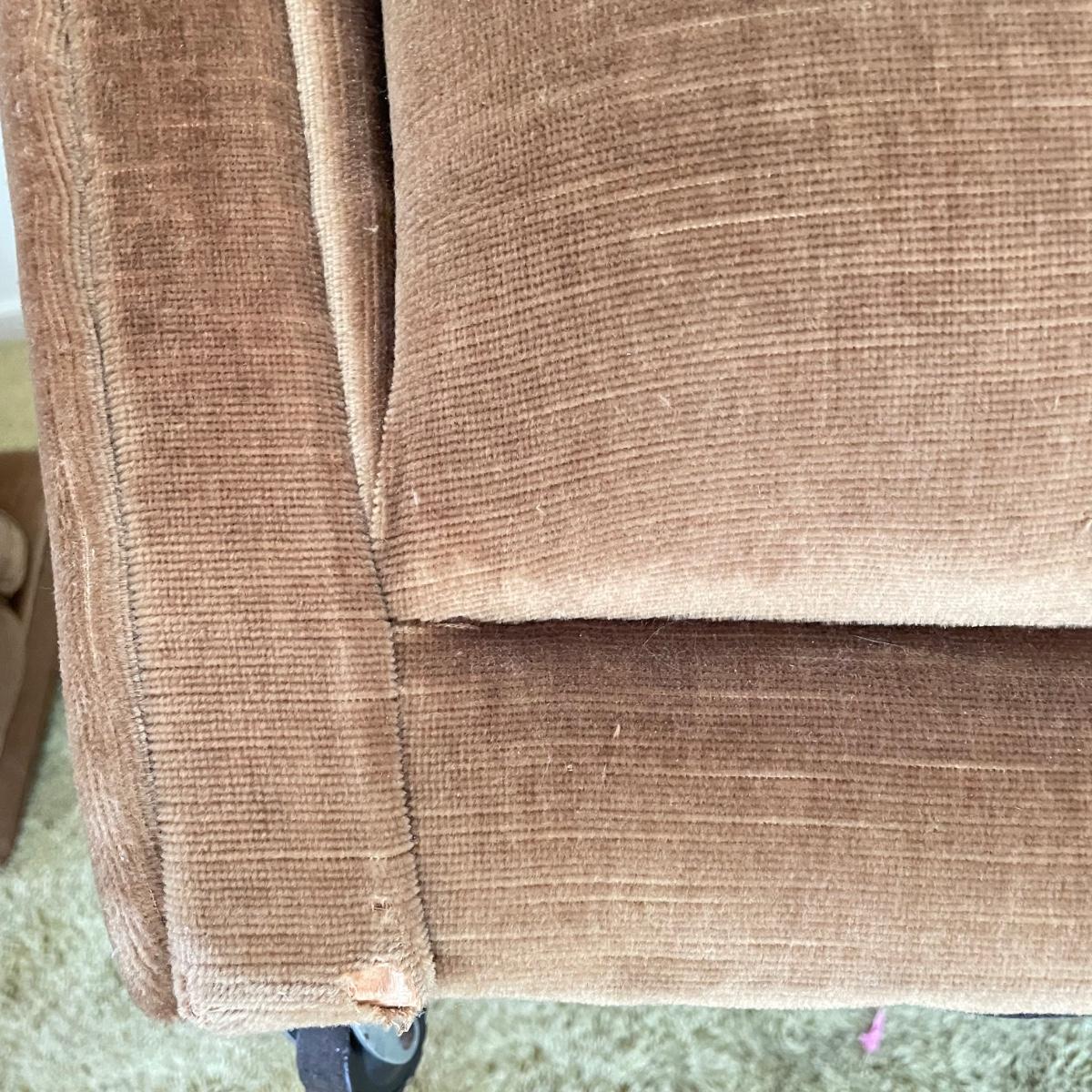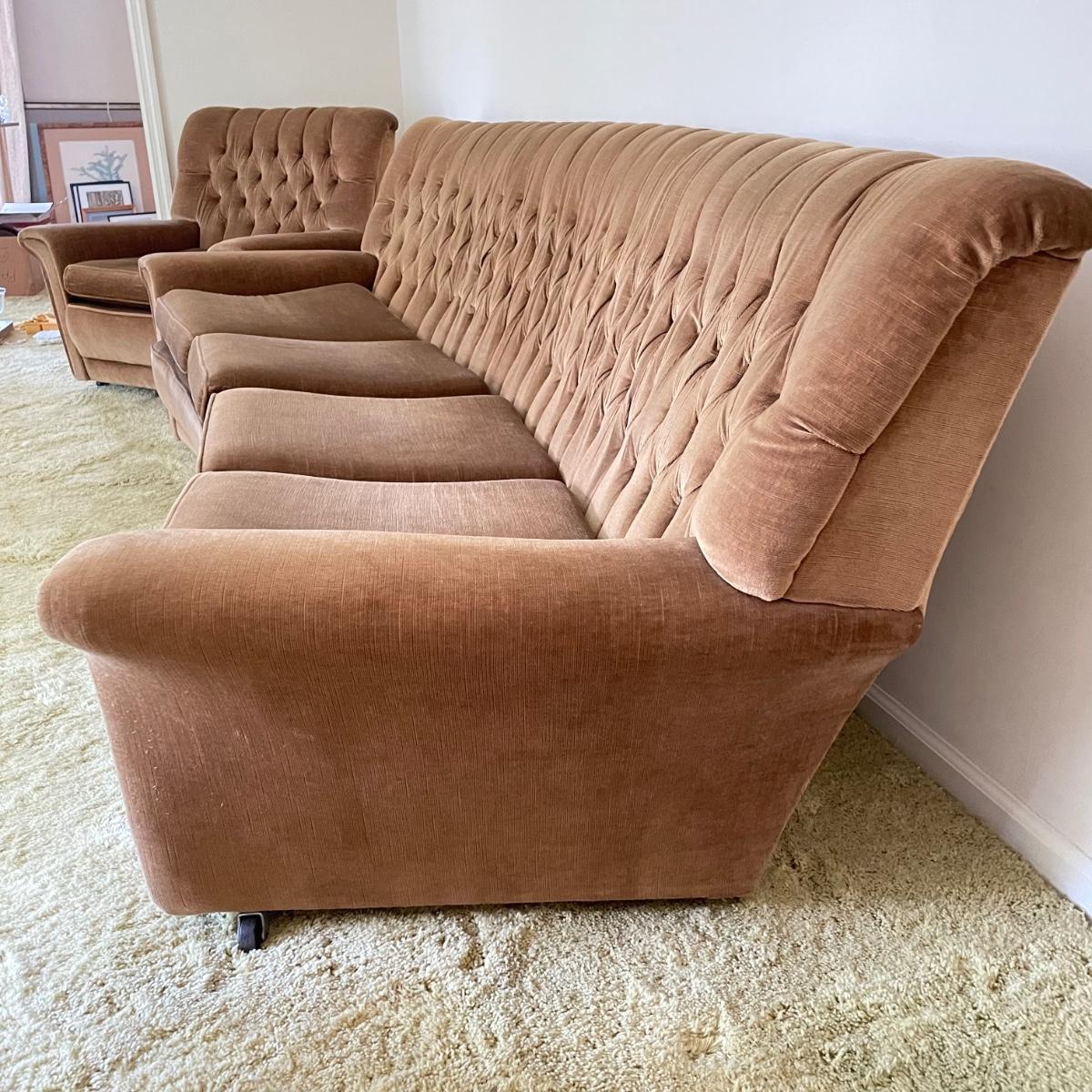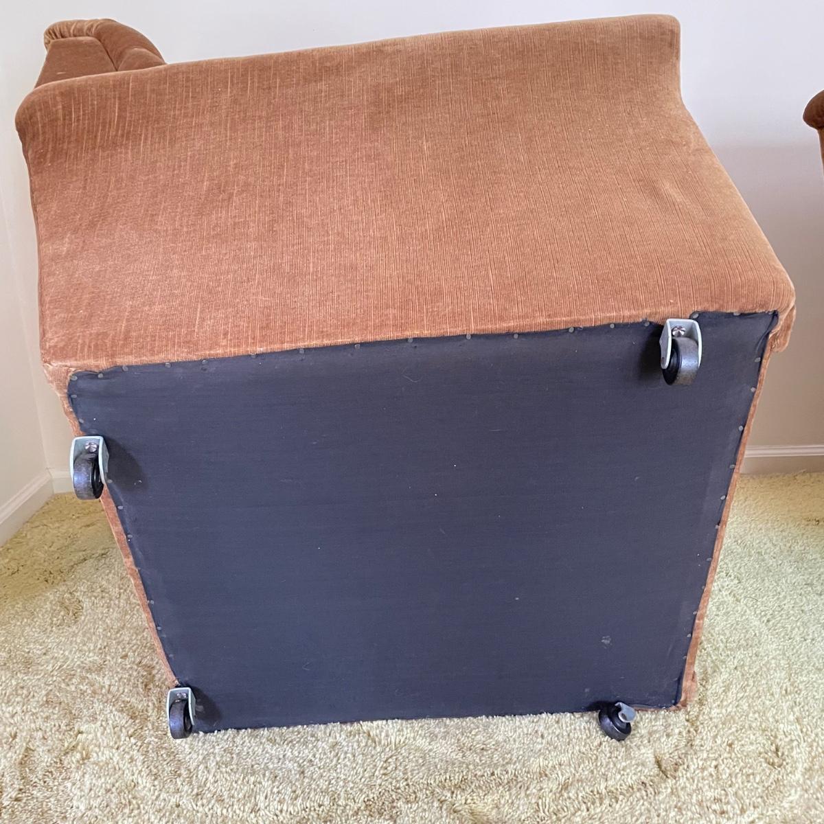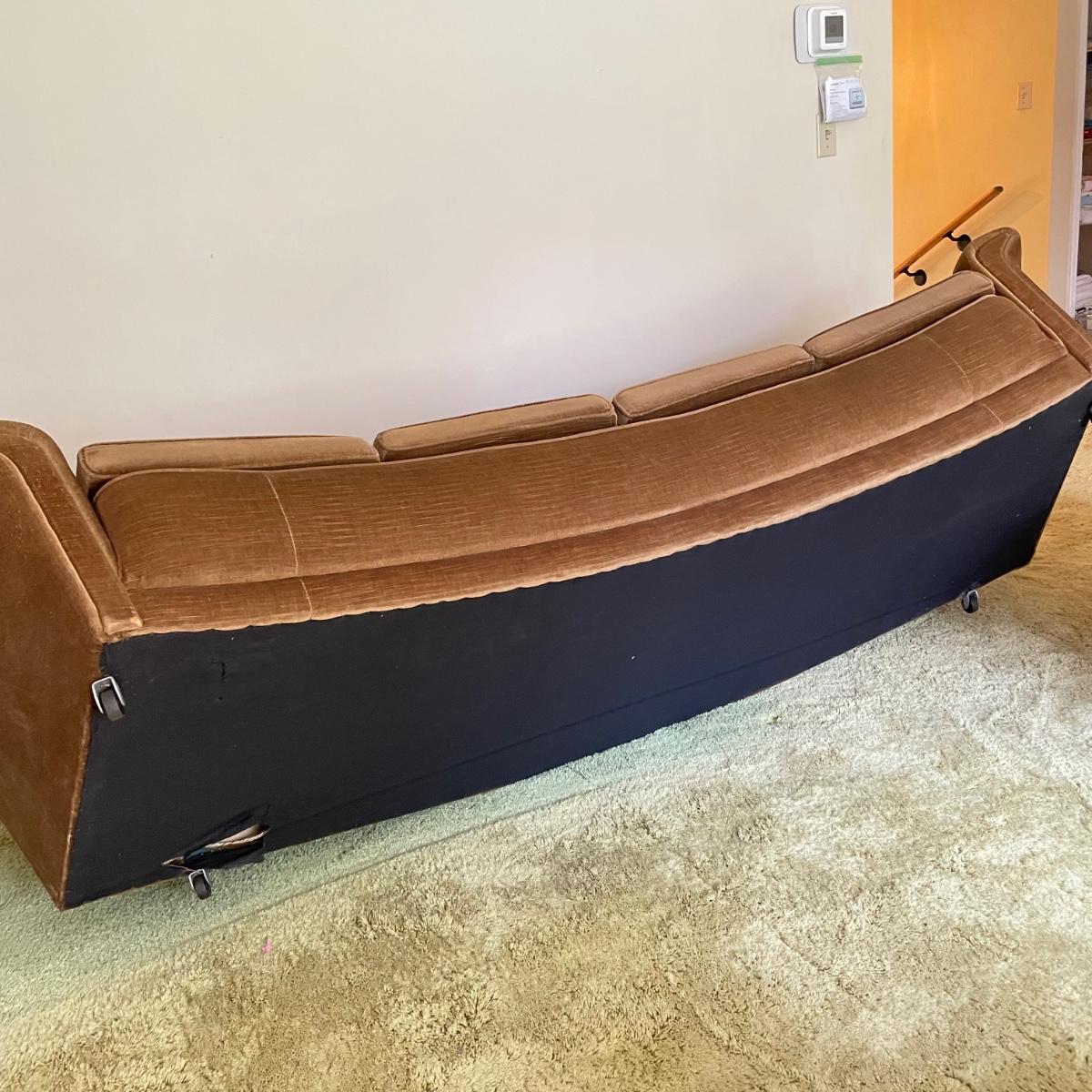 This vintage three piece set is in amazing shape for its age and also comfortable! The furniture has a soft, velvety feel, we were told it is Dralon. The shade of brown is a bit bolder than what is shown in the images. It’s that classic gold/brown or dark mustard retro color. Each piece has four wheels that work well on carpet. There are some minor blemishes here and there, see images. Couch measures 98” x 36” x 30” with a seat height at 16.5”. The chairs each measure 34” x 31” x 31” with a seat height at 16”. Please bring help to load, house is a split level and you will need to go down a half flight of stairs. Local pick up only.