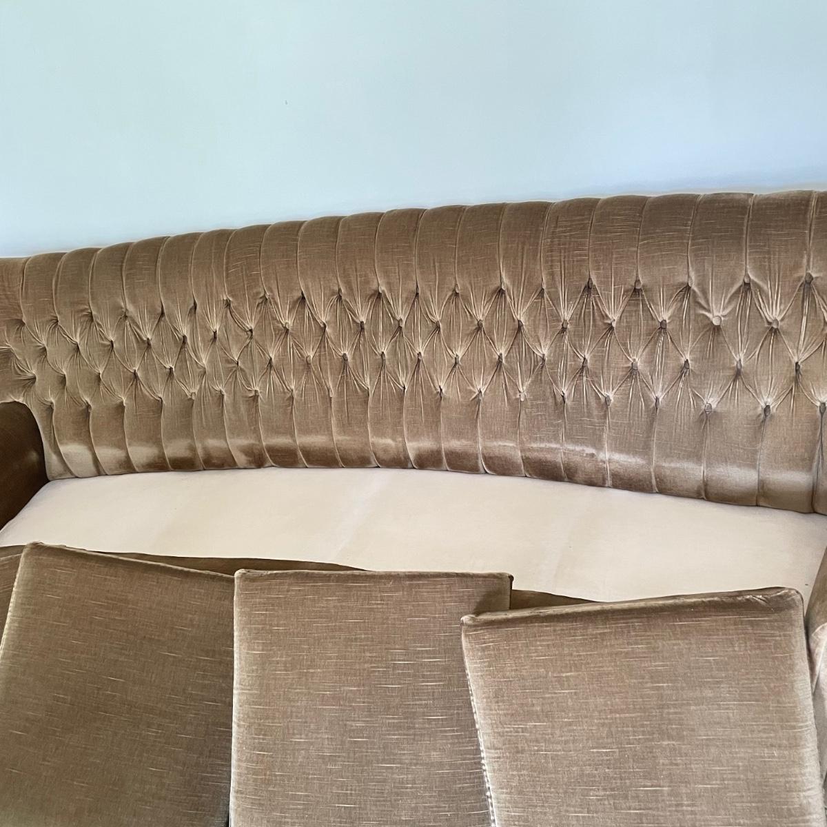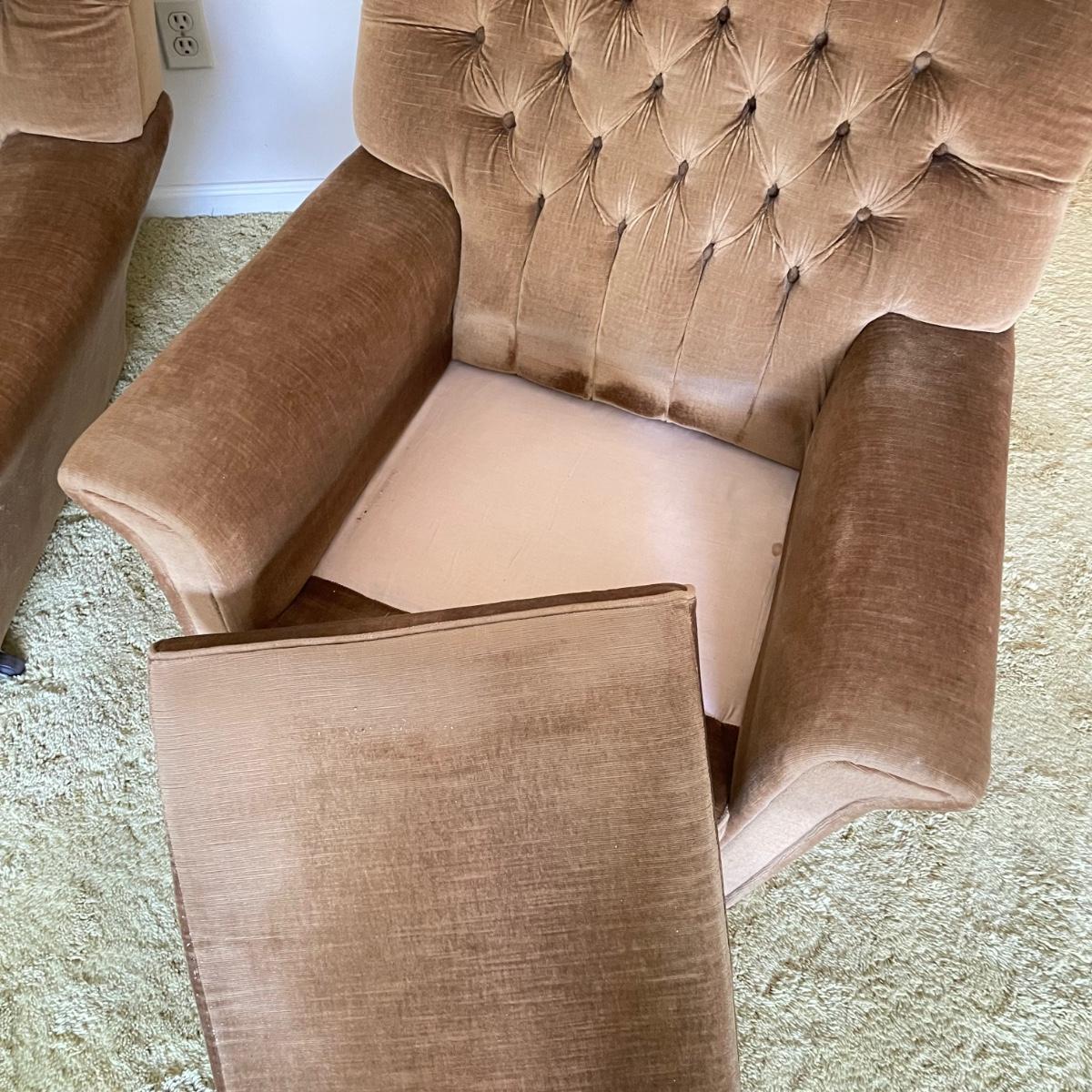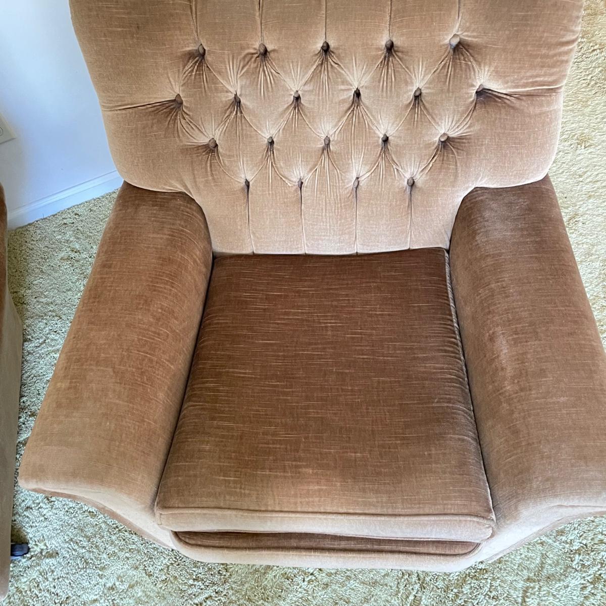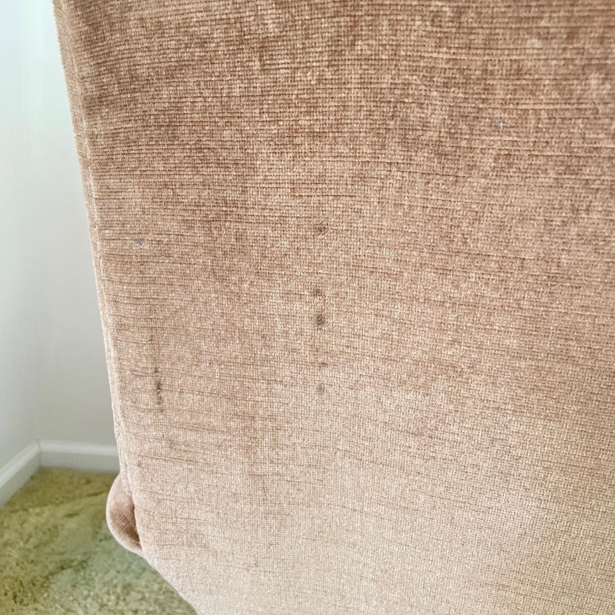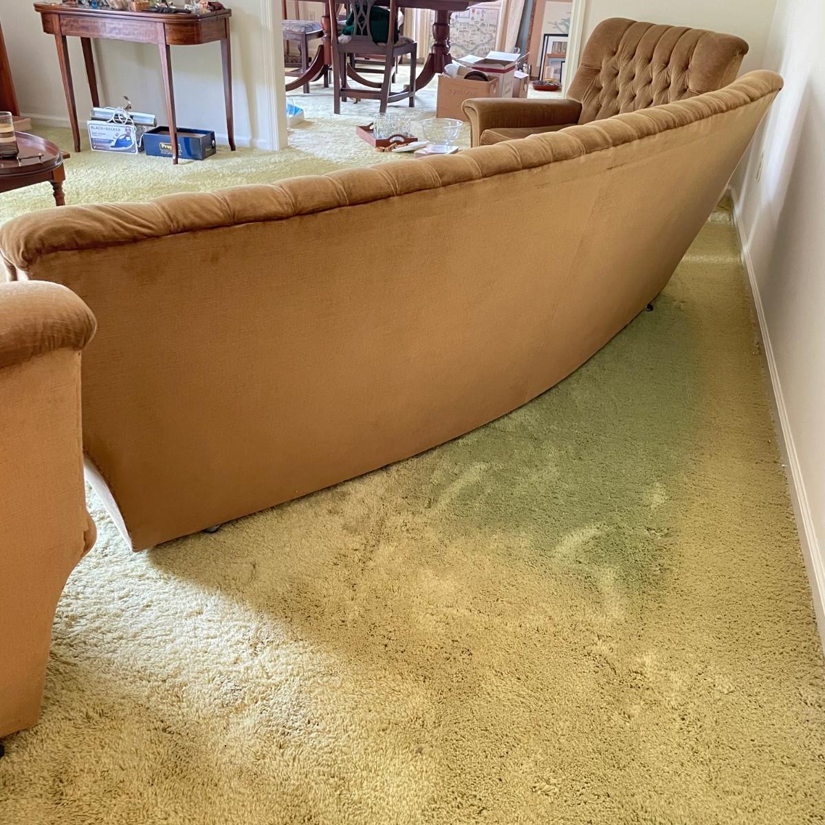 This vintage three piece set is in amazing shape for its age and also comfortable! The furniture has a soft, velvety feel, we were told it is Dralon. The shade of brown is a bit bolder than what is shown in the images. It’s that classic gold/brown or dark mustard retro color. Each piece has four wheels that work well on carpet. There are some minor blemishes here and there, see images. Couch measures 98” x 36” x 30” with a seat height at 16.5”. The chairs each measure 34” x 31” x 31” with a seat height at 16”. Please bring help to load, house is a split level and you will need to go down a half flight of stairs. Local pick up only.