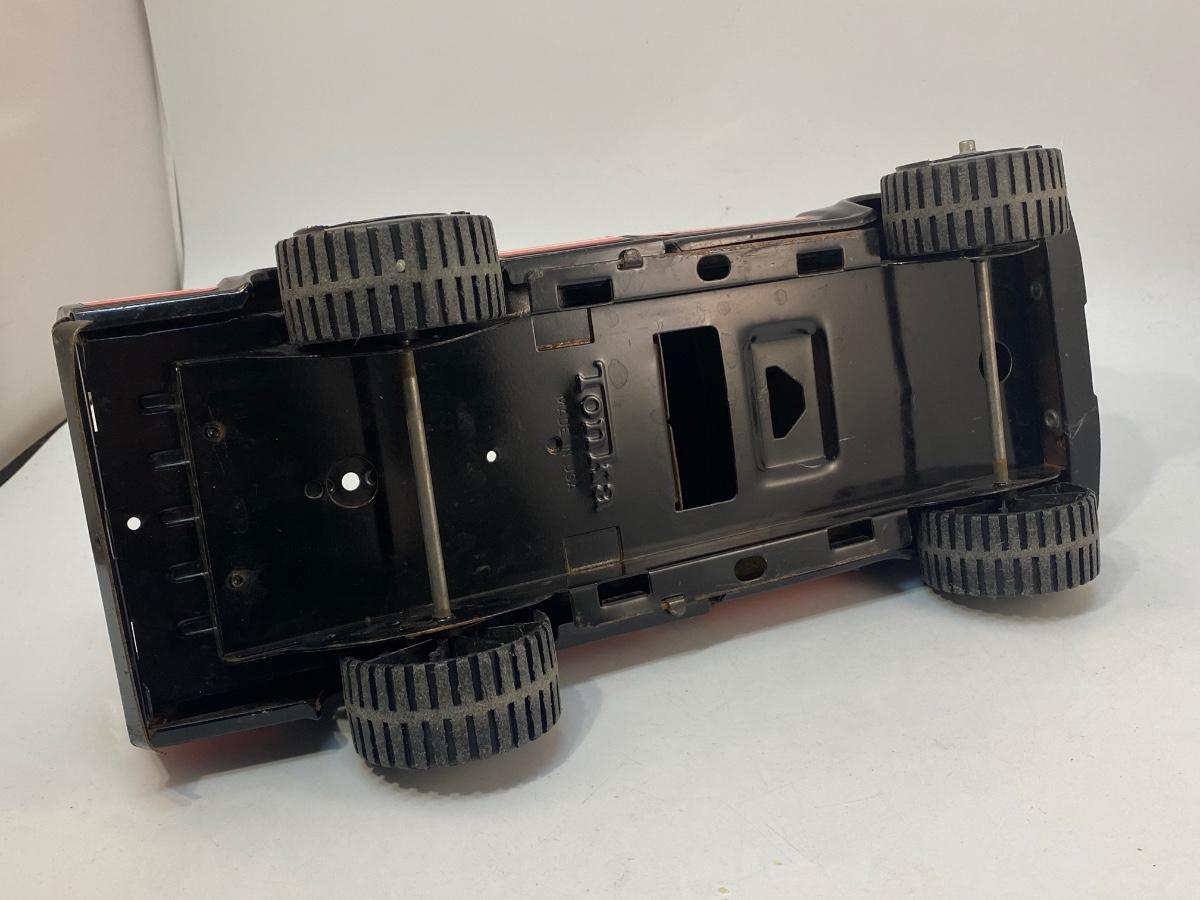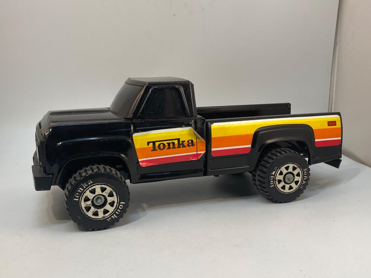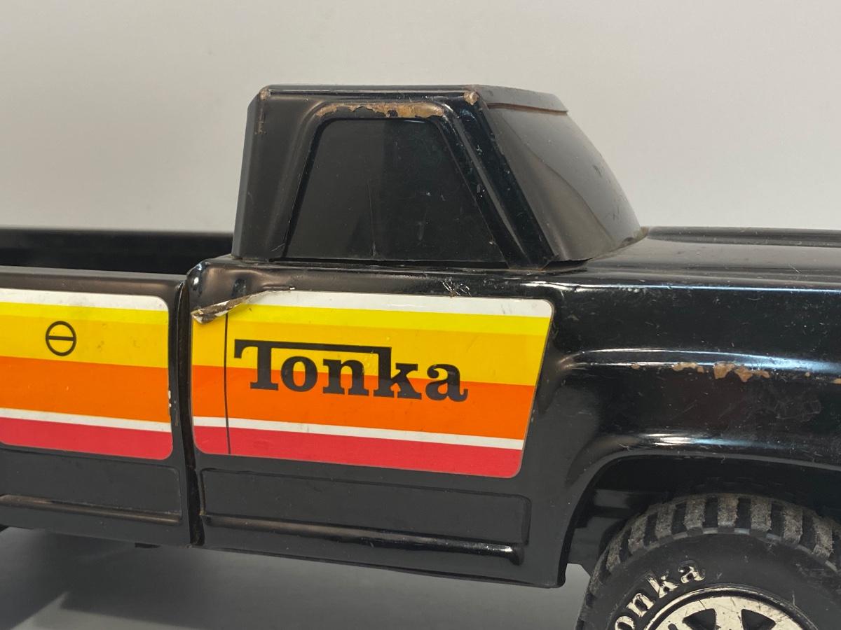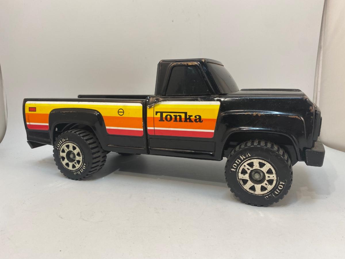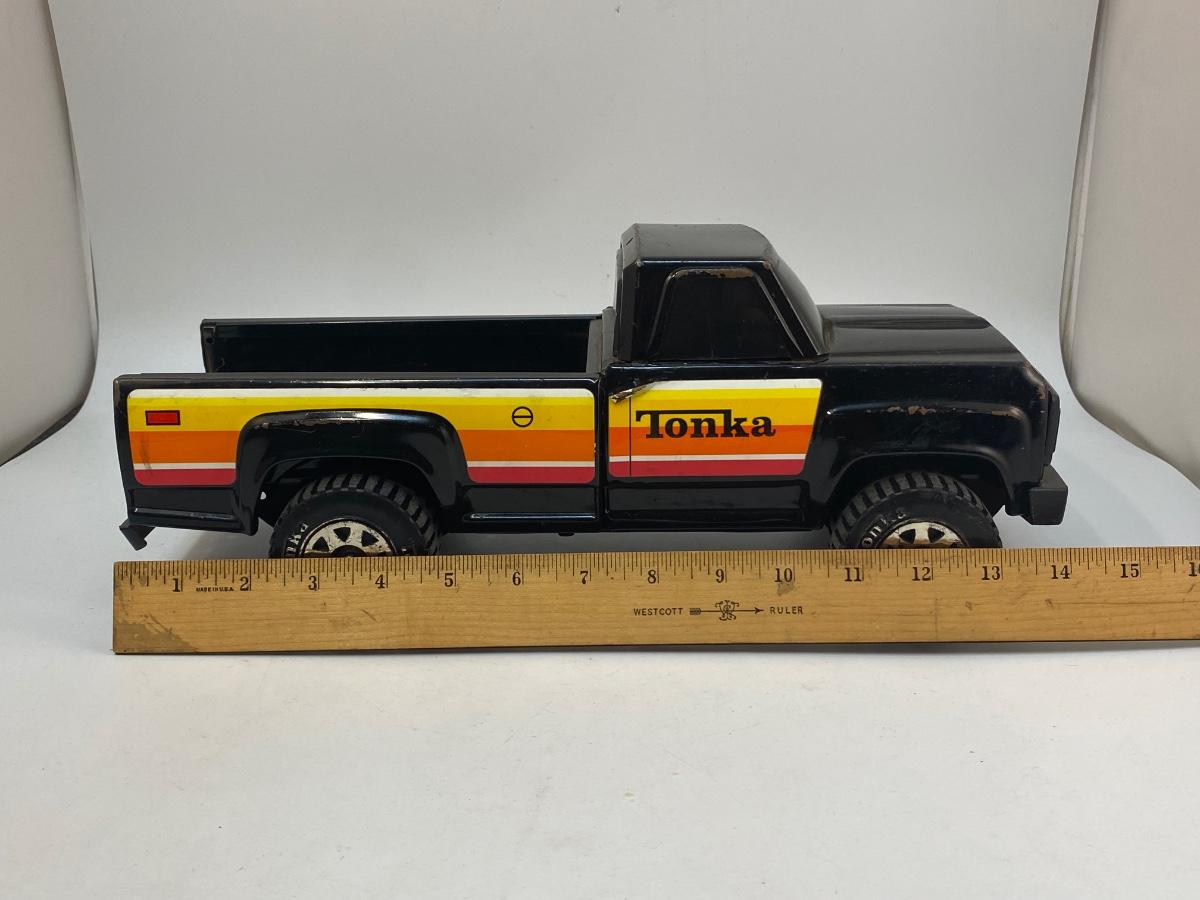 Retro Tonka Metal Pick Up 4x4 Truck Black with Yellow Orange Stripes