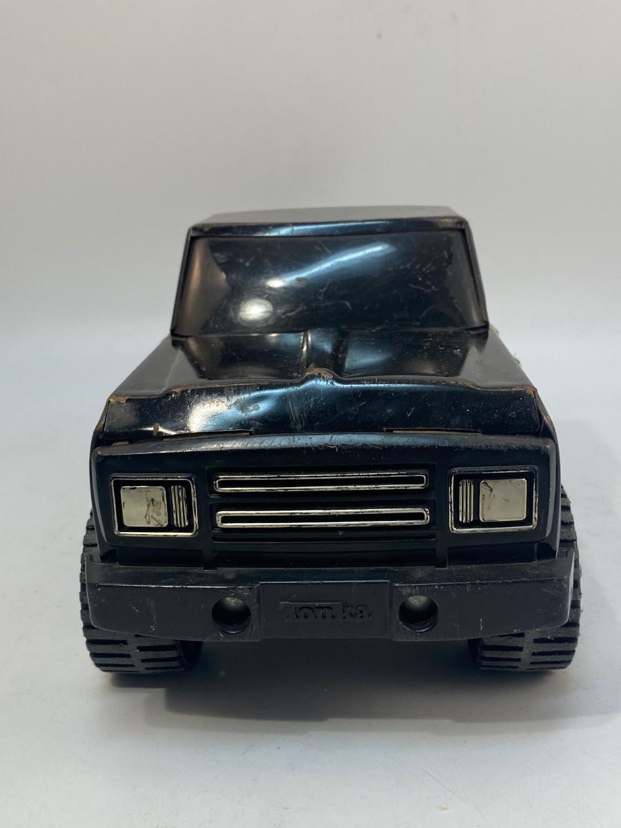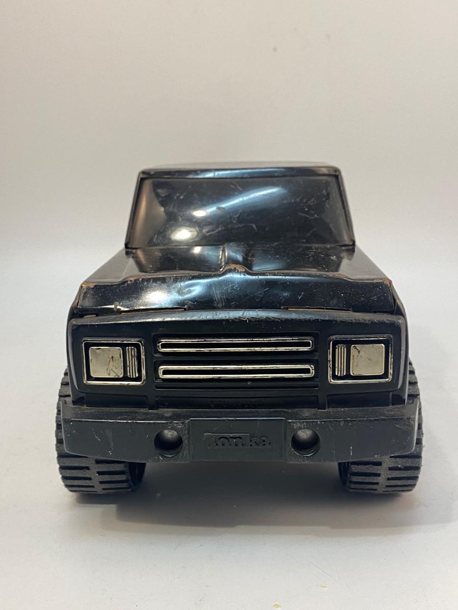 Retro Tonka Metal Pick Up 4x4 Truck Black with Yellow Orange Stripes. In played with condition.