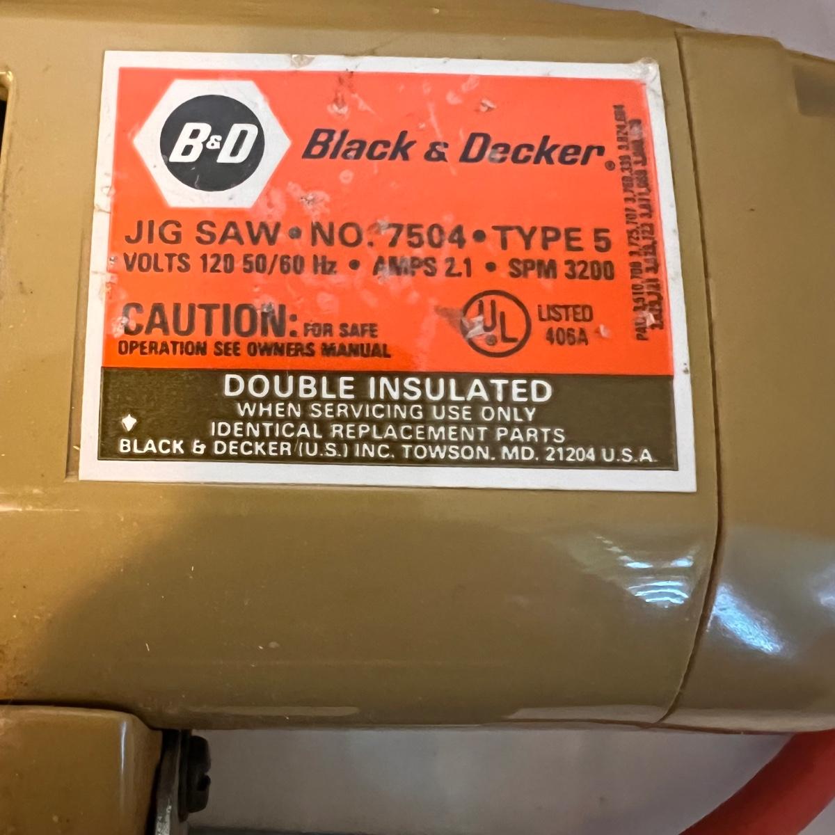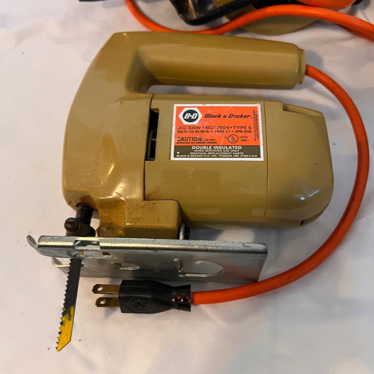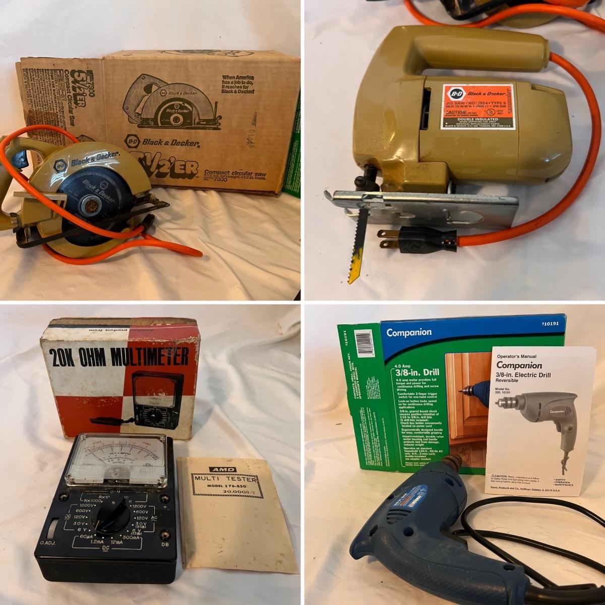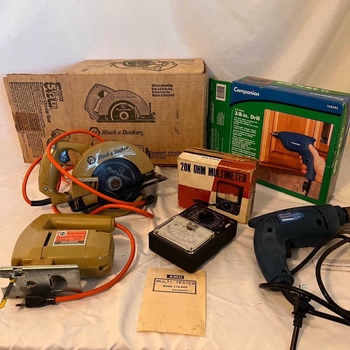 Two retro Black & Decker saws both powered on when plugged in as does the newer Companion drill. Note that the Jig Saw does not have its box. The multi tester is battery operated and untested (some corrosion in battery compartment, see pics).
