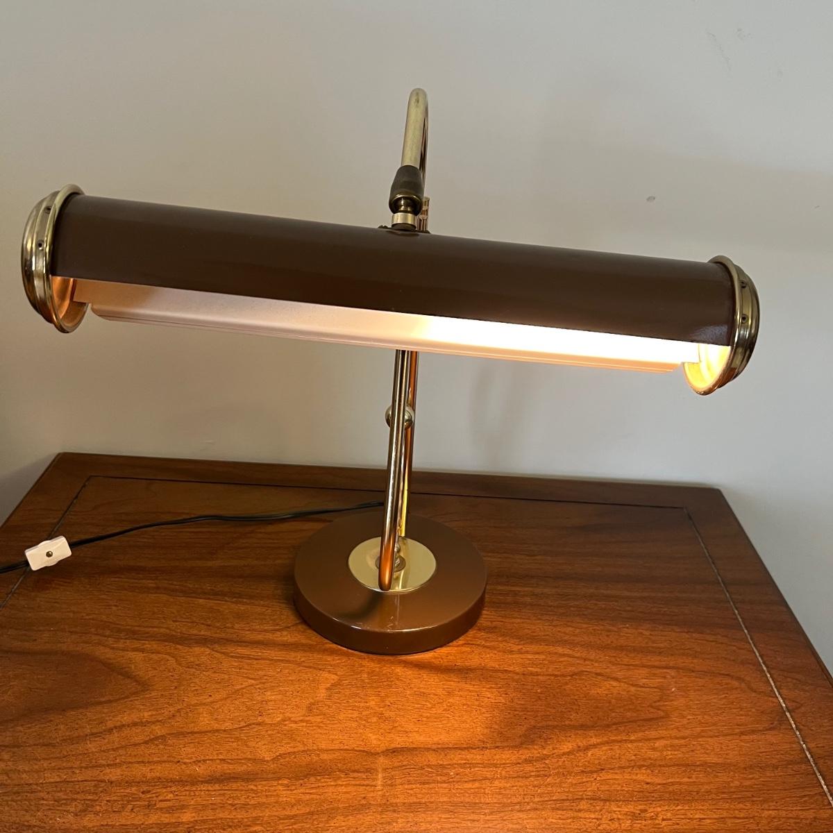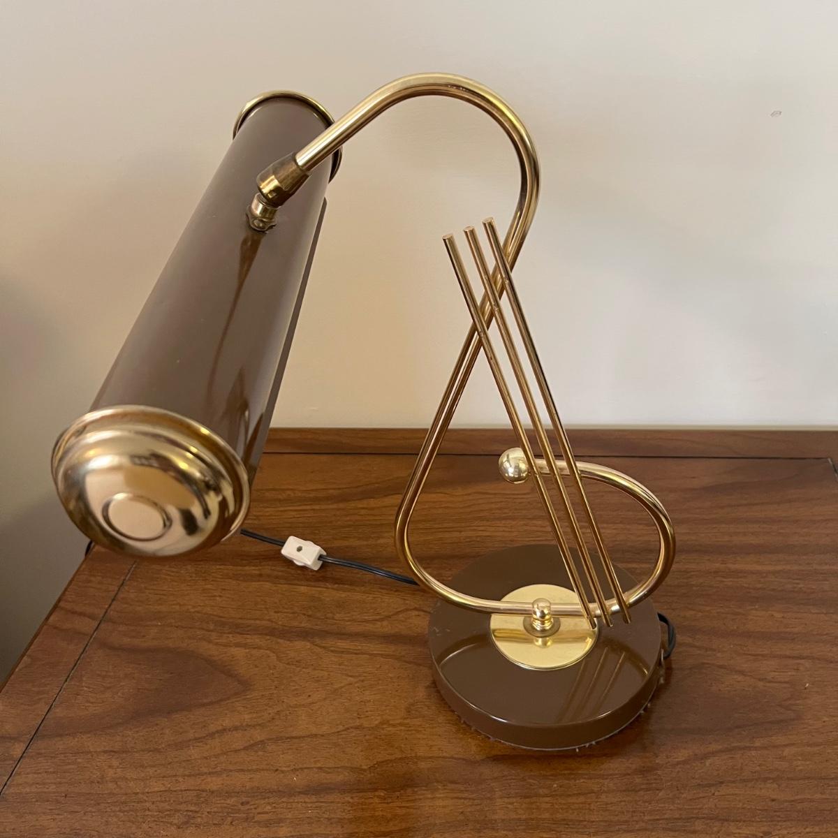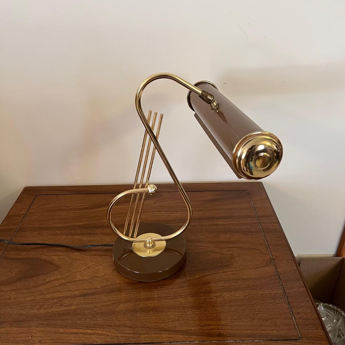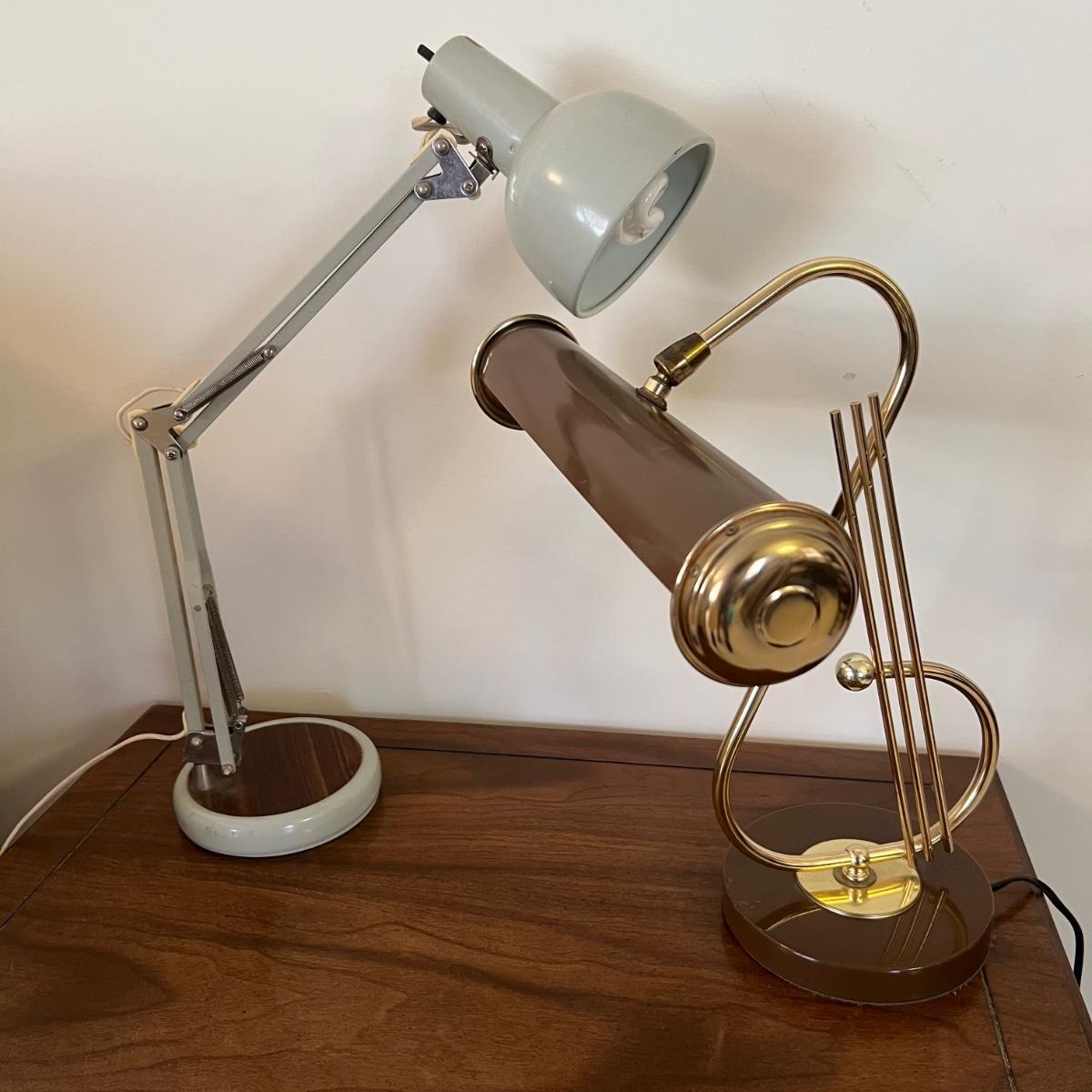 2 vintage lamps in this lot. The brown metal lamp has a brass colored stem shaped like a treble clef and has a 3 way switch; measures 7” D (base) x 6” tall, lamp head swivels up and down. The pale blue metal lamp is height adjustable and this lamp has a faux wood top on its base. Both are in good and working condition.