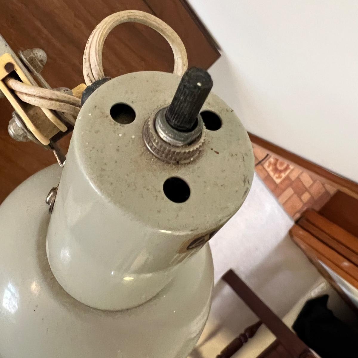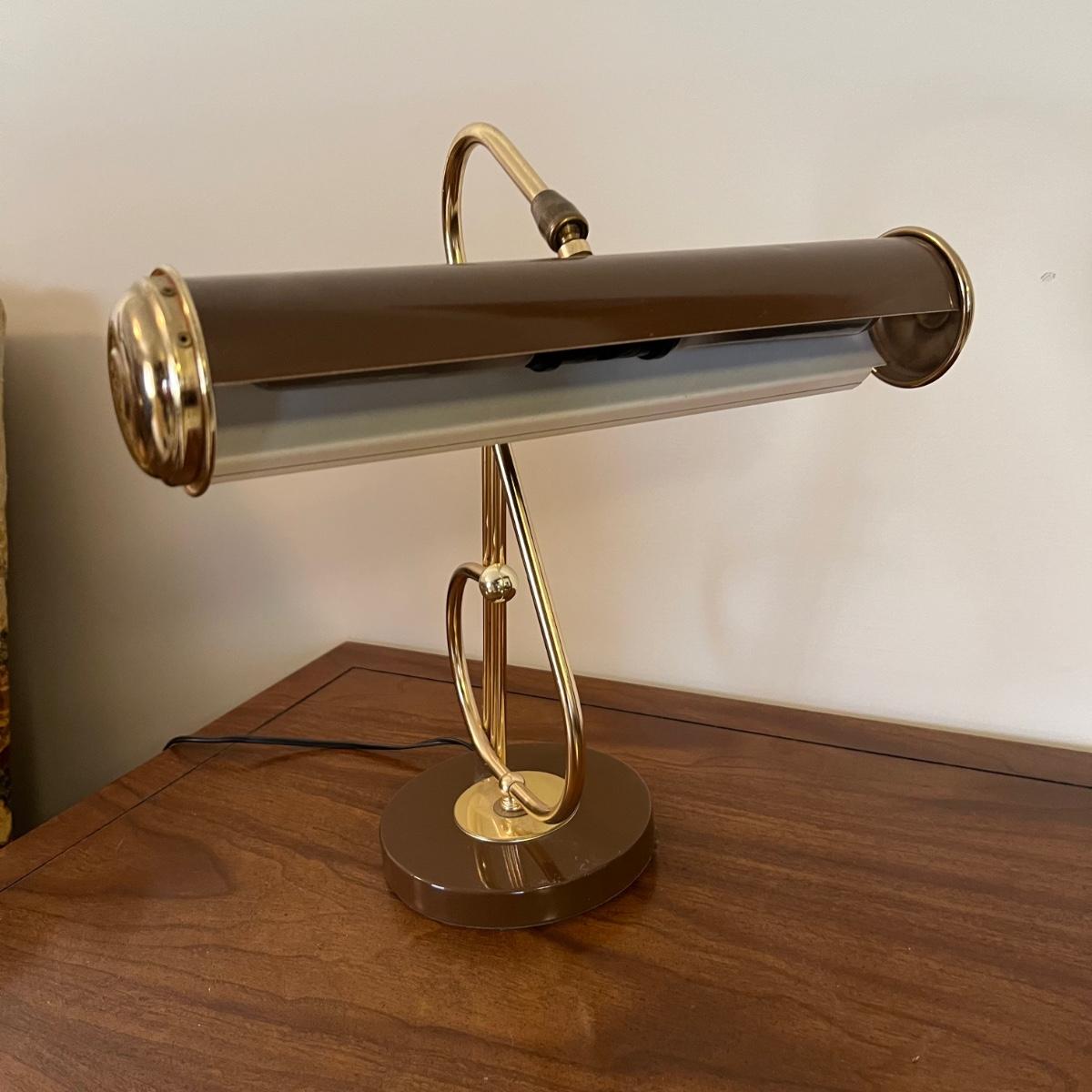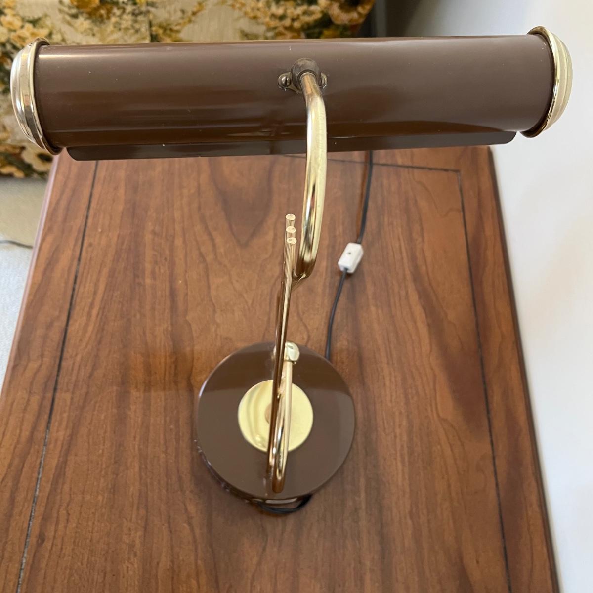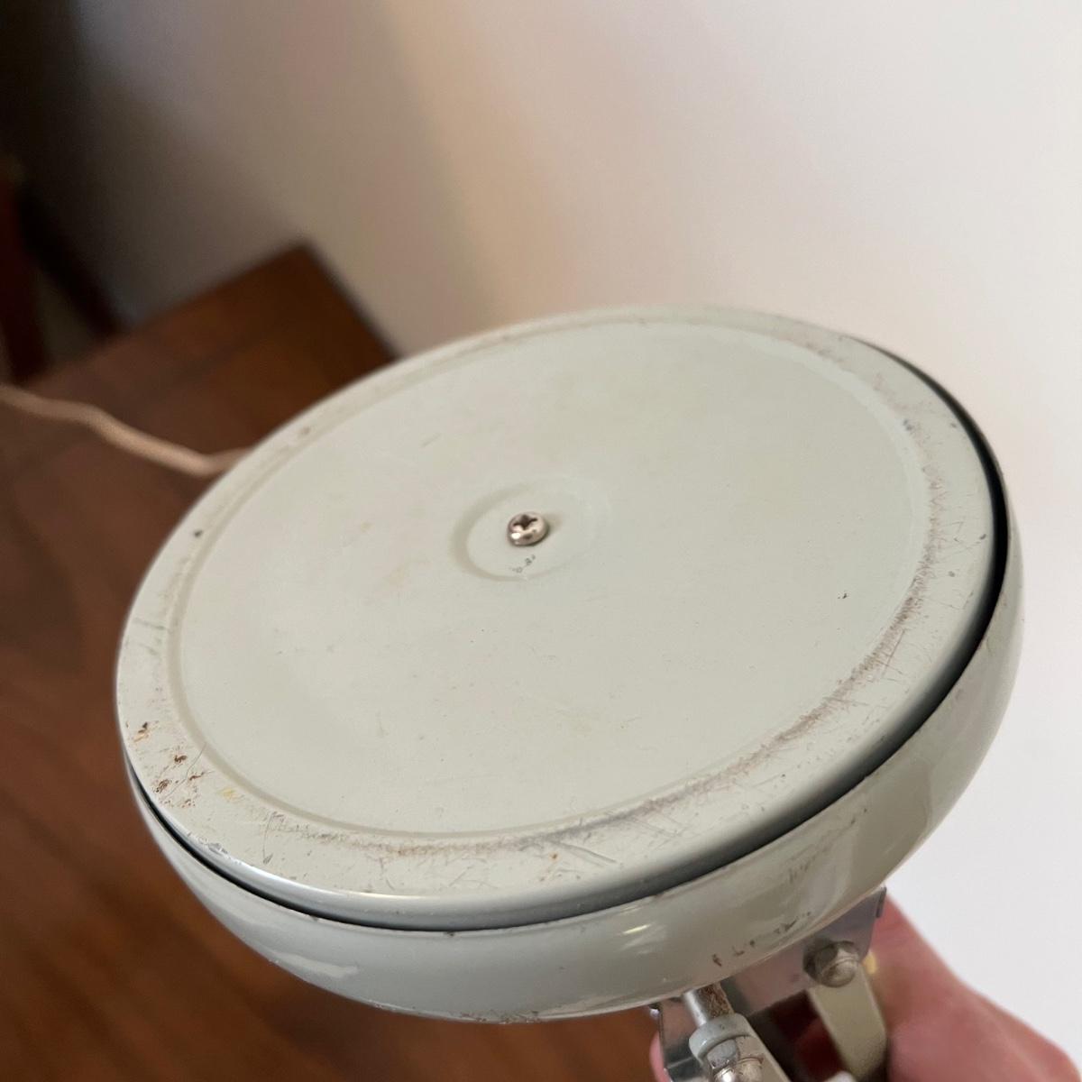 2 vintage lamps in this lot. The brown metal lamp has a brass colored stem shaped like a treble clef and has a 3 way switch; measures 7” D (base) x 6” tall, lamp head swivels up and down. The pale blue metal lamp is height adjustable and this lamp has a faux wood top on its base. Both are in good and working condition.