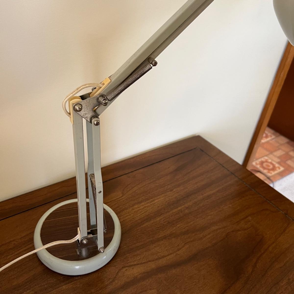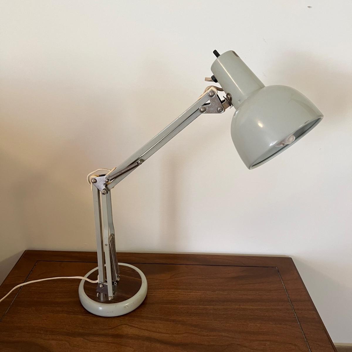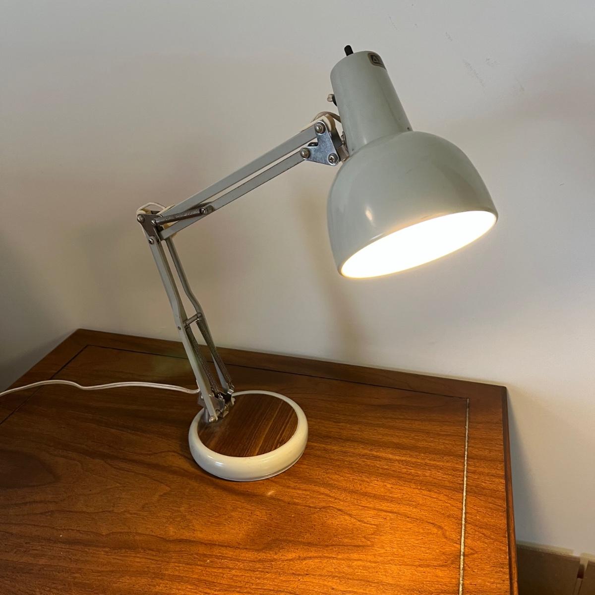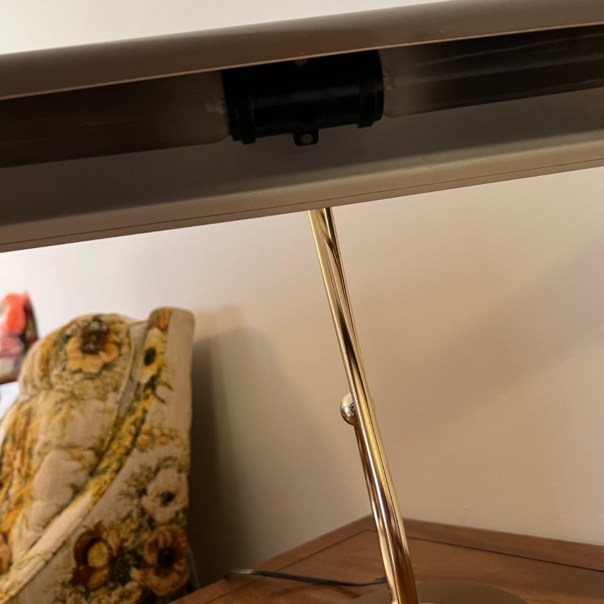 2 vintage lamps in this lot. The brown metal lamp has a brass colored stem shaped like a treble clef and has a 3 way switch; measures 7” D (base) x 6” tall, lamp head swivels up and down. The pale blue metal lamp is height adjustable and this lamp has a faux wood top on its base. Both are in good and working condition.