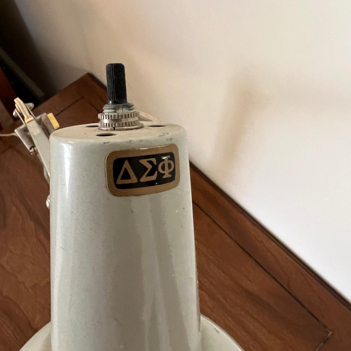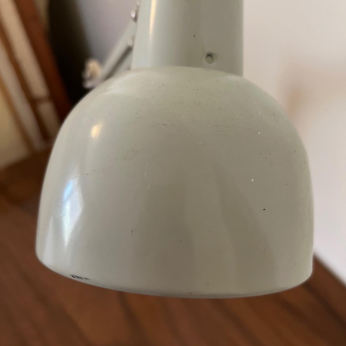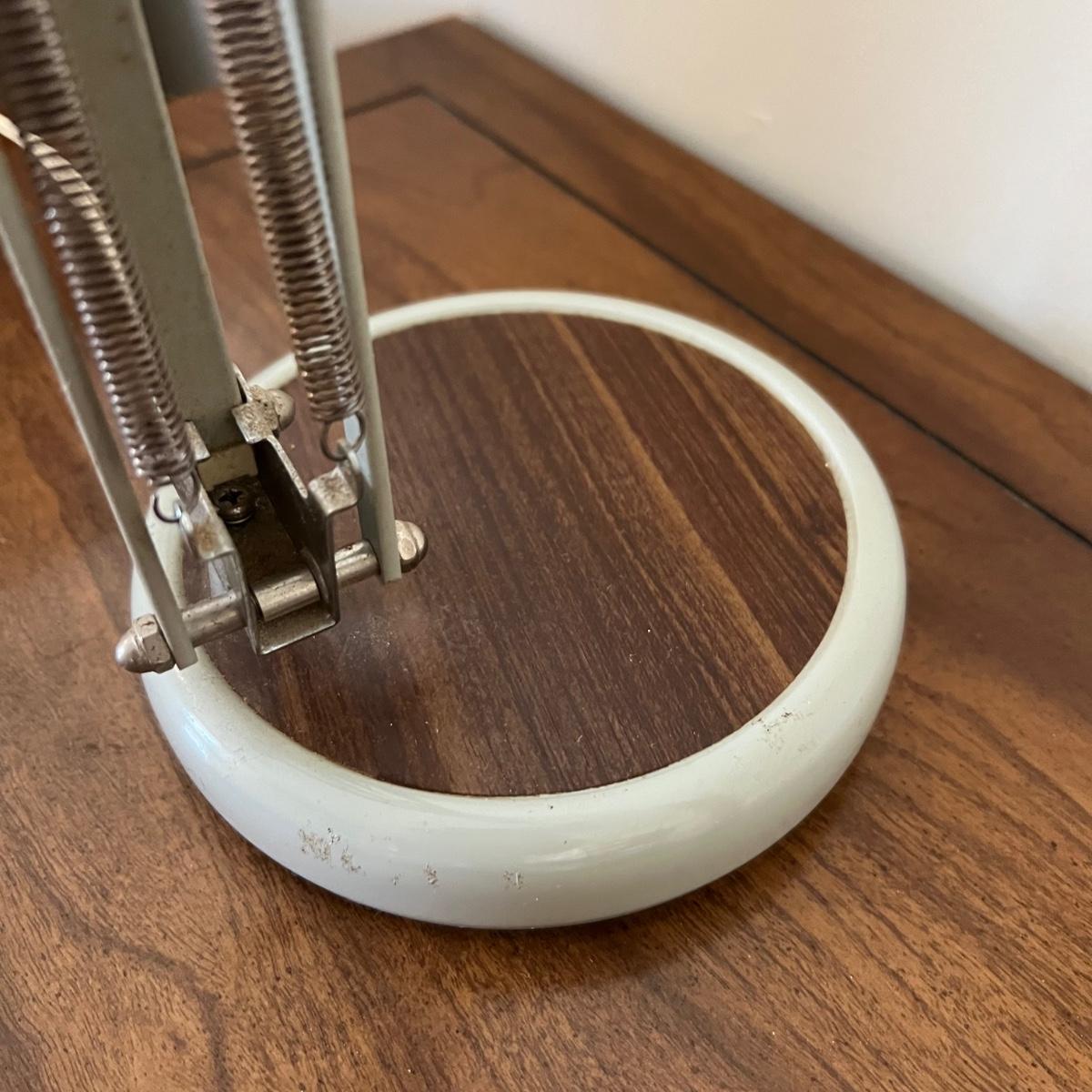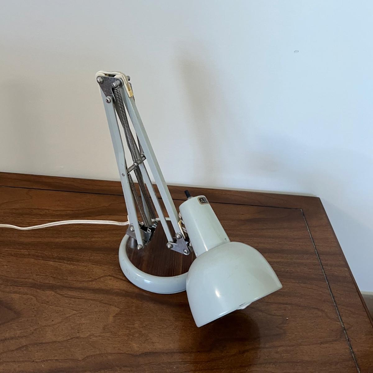 2 vintage lamps in this lot. The brown metal lamp has a brass colored stem shaped like a treble clef and has a 3 way switch; measures 7” D (base) x 6” tall, lamp head swivels up and down. The pale blue metal lamp is height adjustable and this lamp has a faux wood top on its base. Both are in good and working condition.