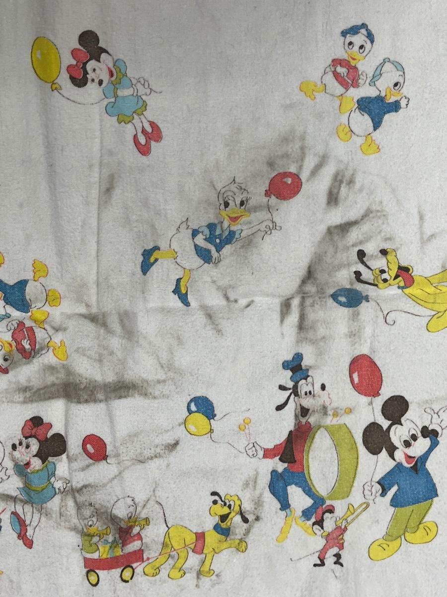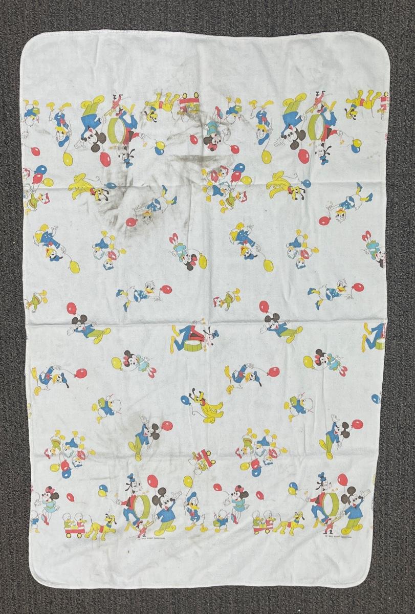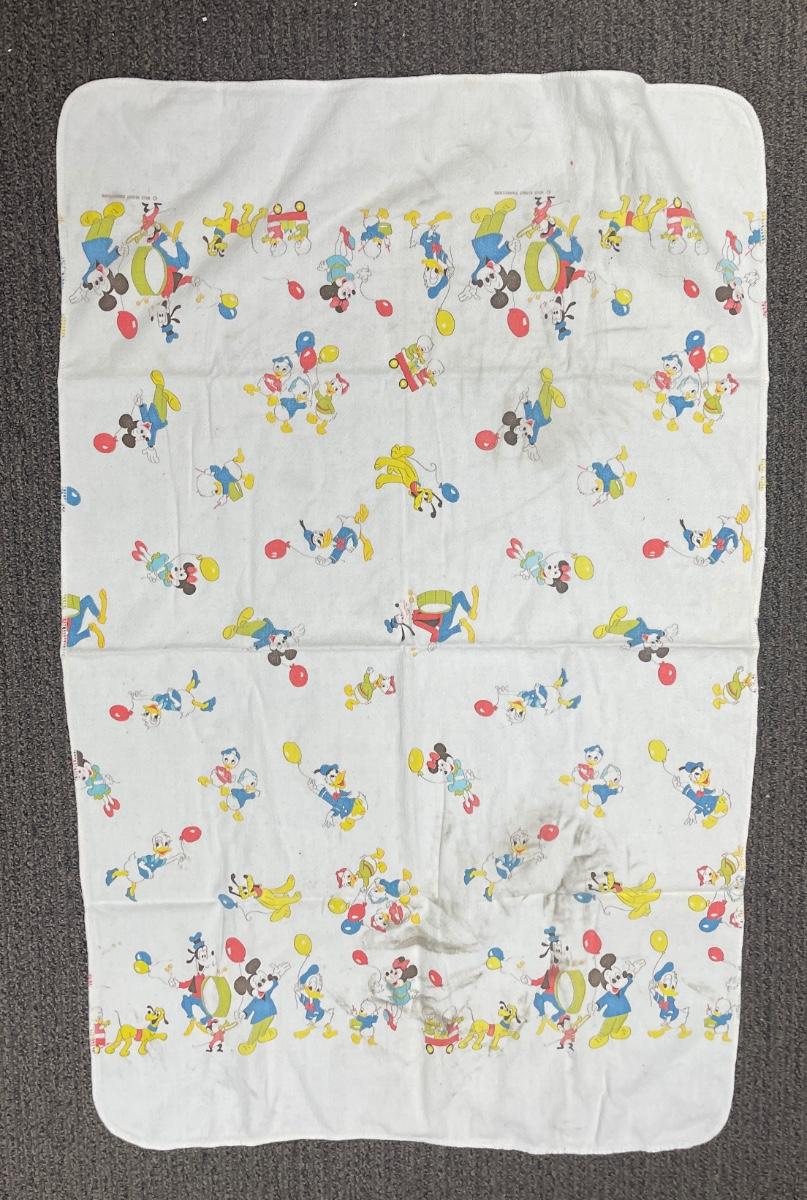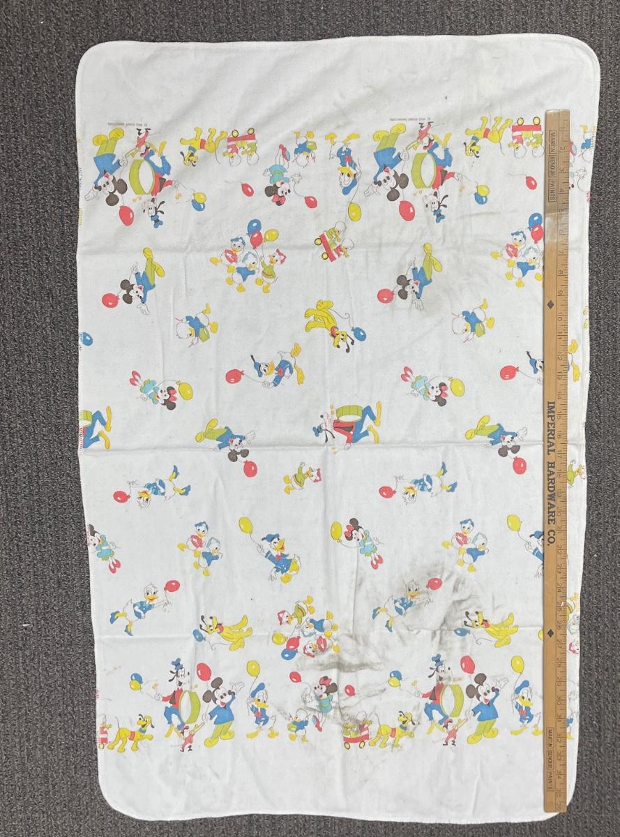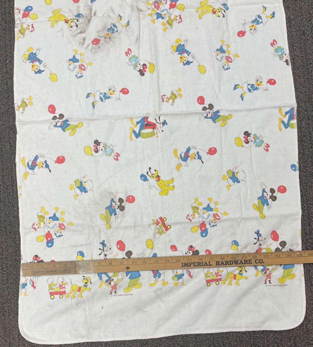 Walt Disney Production label on blanket. Very soft flannel, well loved. There is a large light colored stain on it, but we haven't attempted to clean and it may be something that will come out.