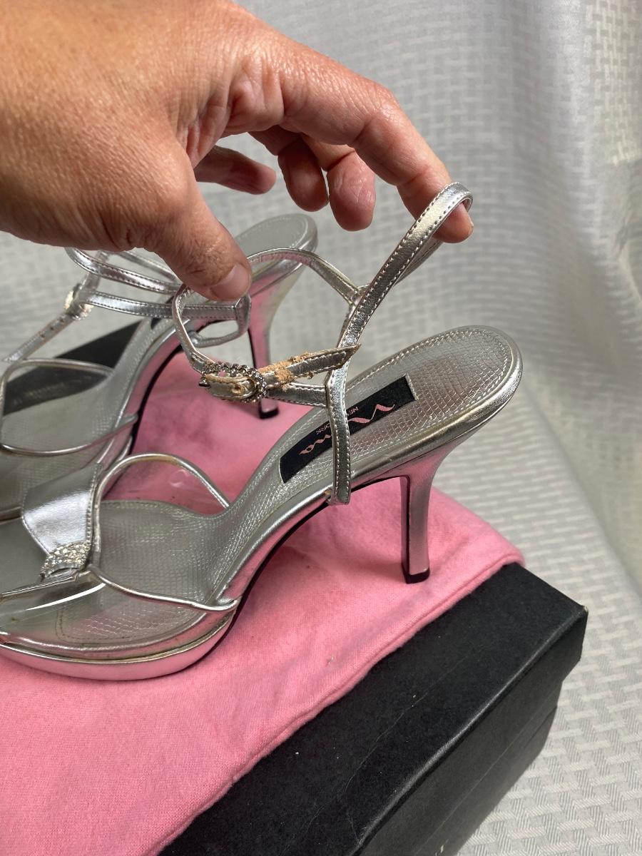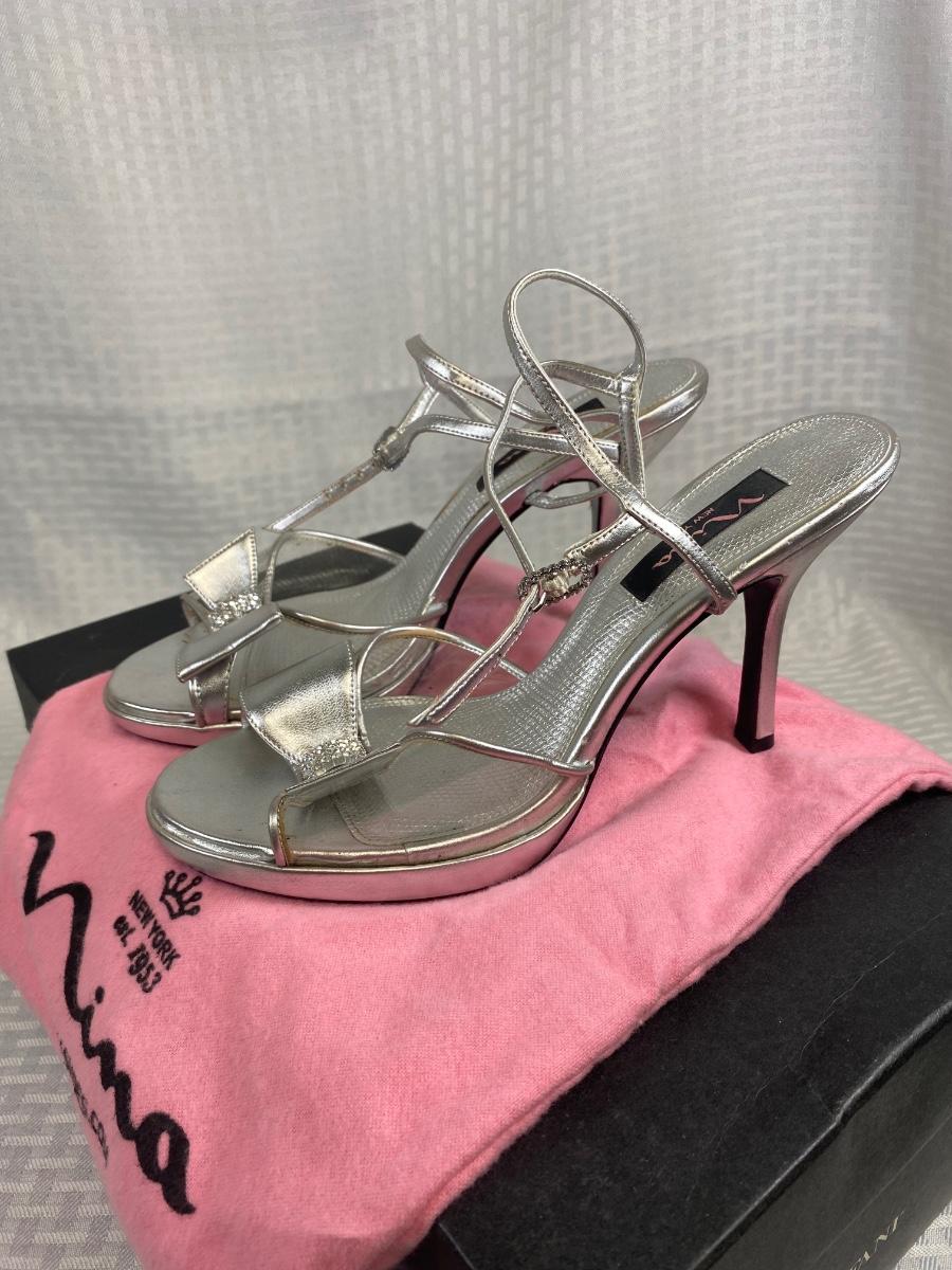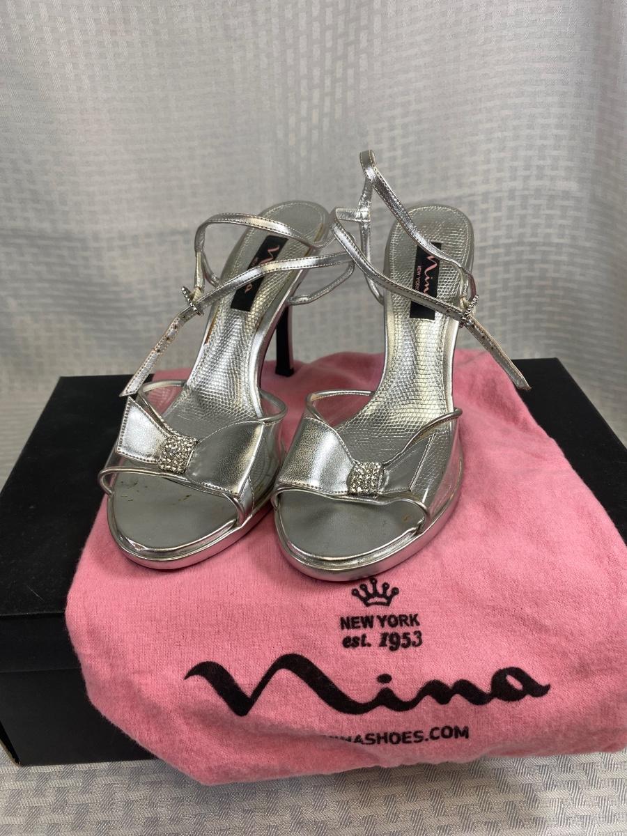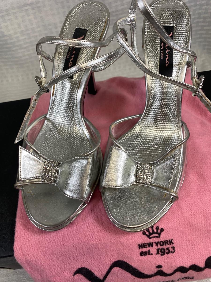 Retro Vintage Nina Strappy Silver Rhinestone Bow Heels Pumps. In good used condition. Size 8.5. Come in original felt pink bag.