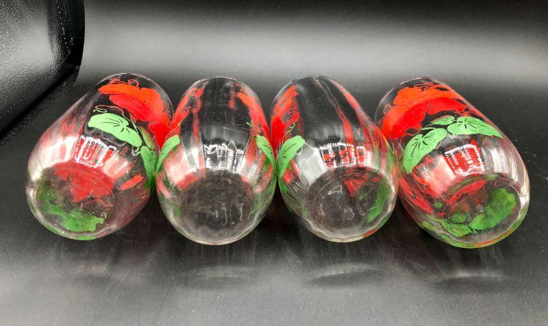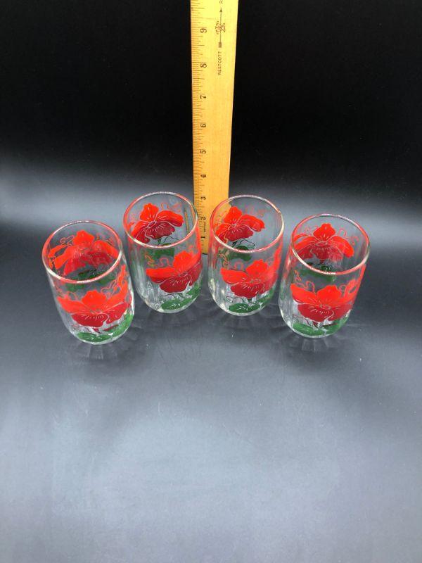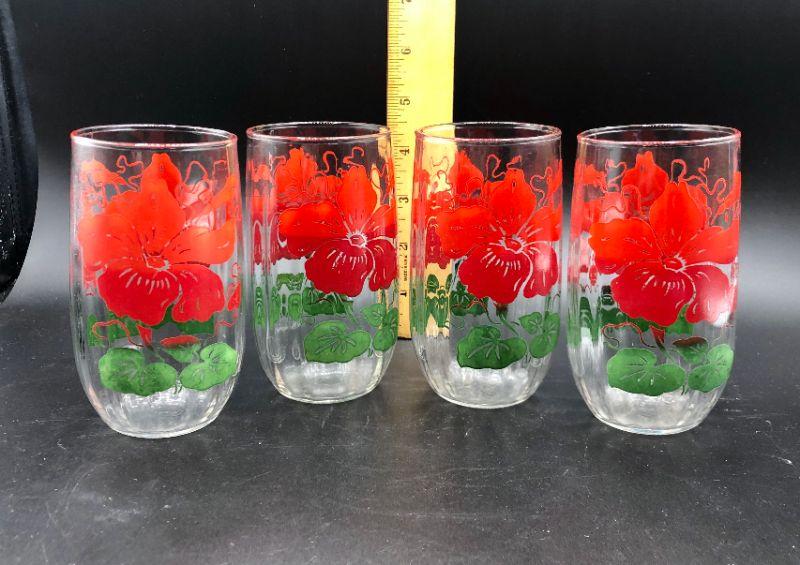 Set of 4 drinking glasses. Great retro design. Red orange hibiscus flowers with green leaves. Under 5" tall. Good Condition.