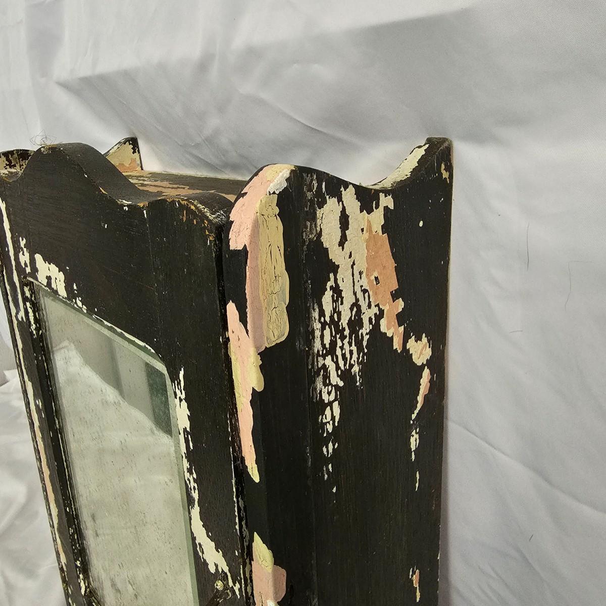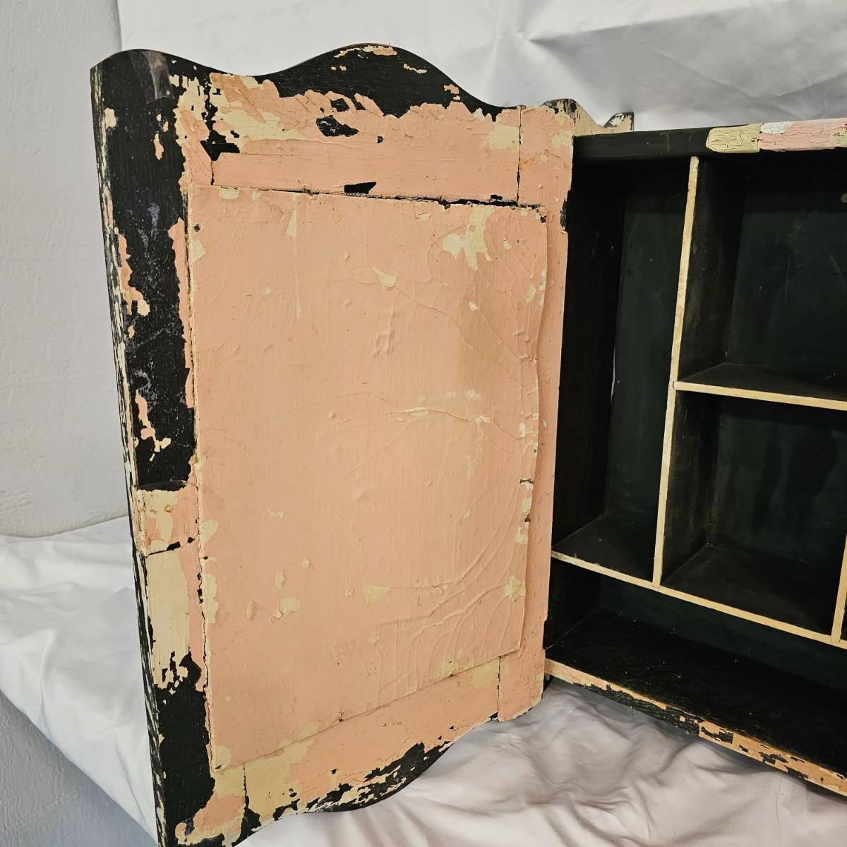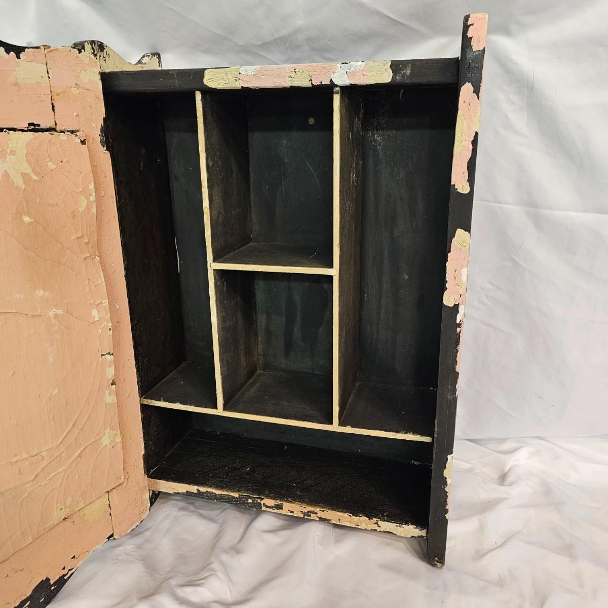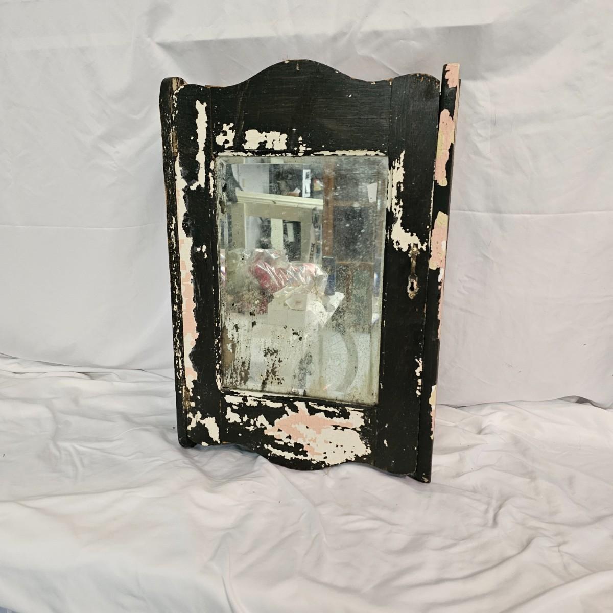 Solid wood wall cabinet with door, mirror and shelves. Several coats of paint visible. Plywood back, brass hardware. Cabinet measures 15" x 6" x 22"h. Please note that mirror coating is compromised and peeling. See photos for details. Local pickup only.