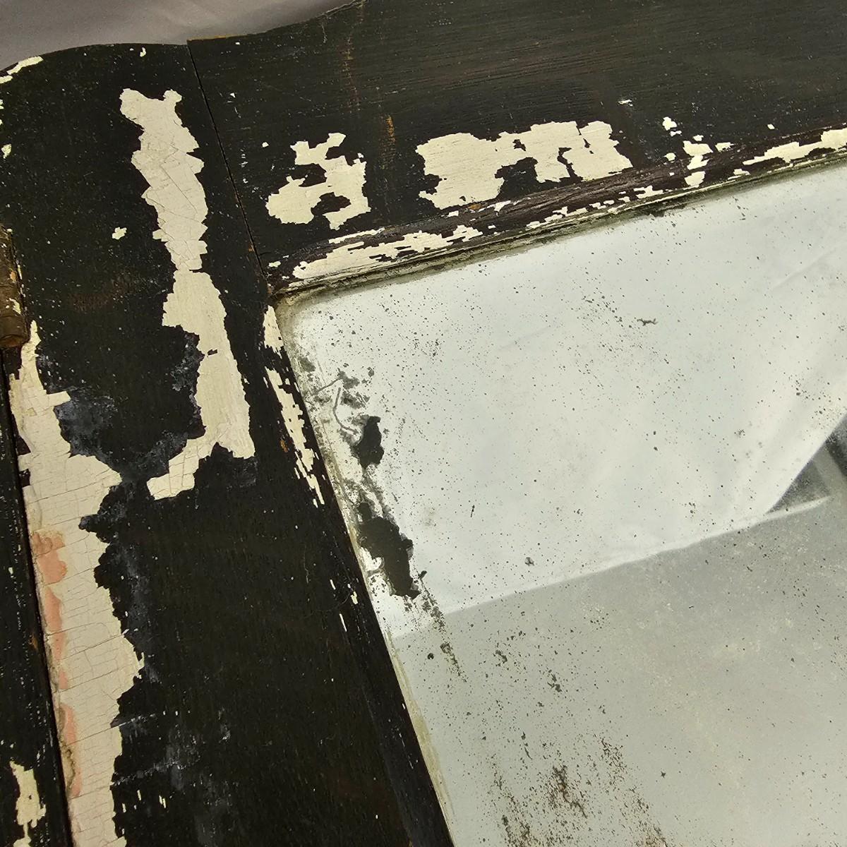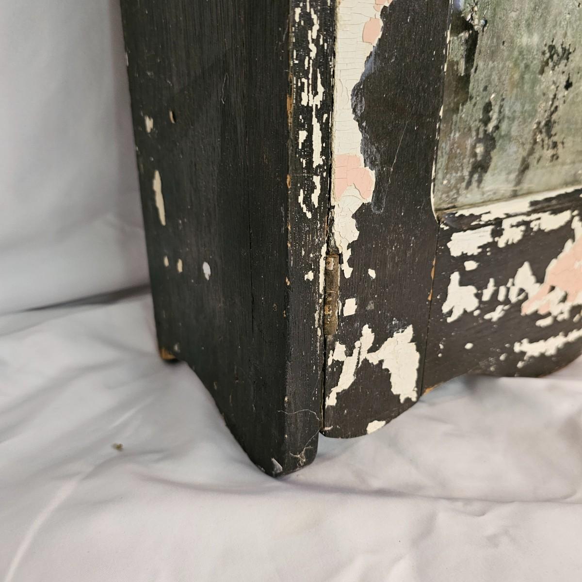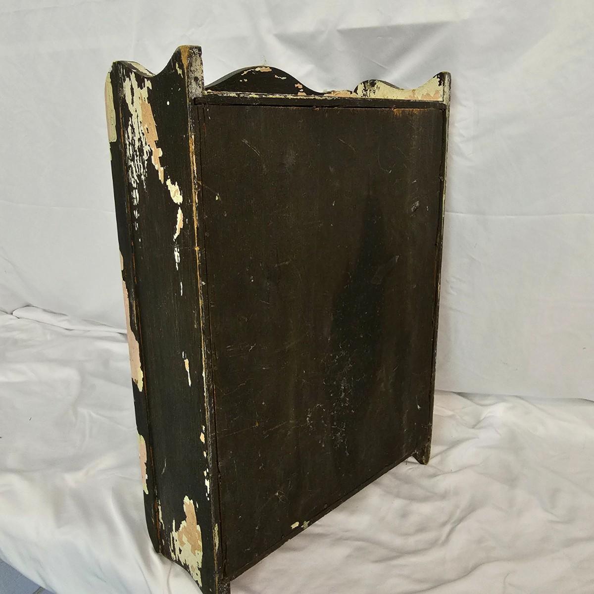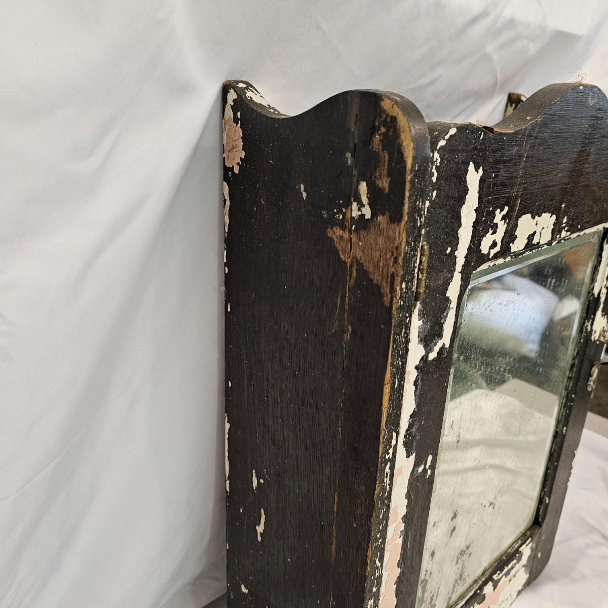 Solid wood wall cabinet with door, mirror and shelves. Several coats of paint visible. Plywood back, brass hardware. Cabinet measures 15" x 6" x 22"h. Please note that mirror coating is compromised and peeling. See photos for details. Local pickup only.