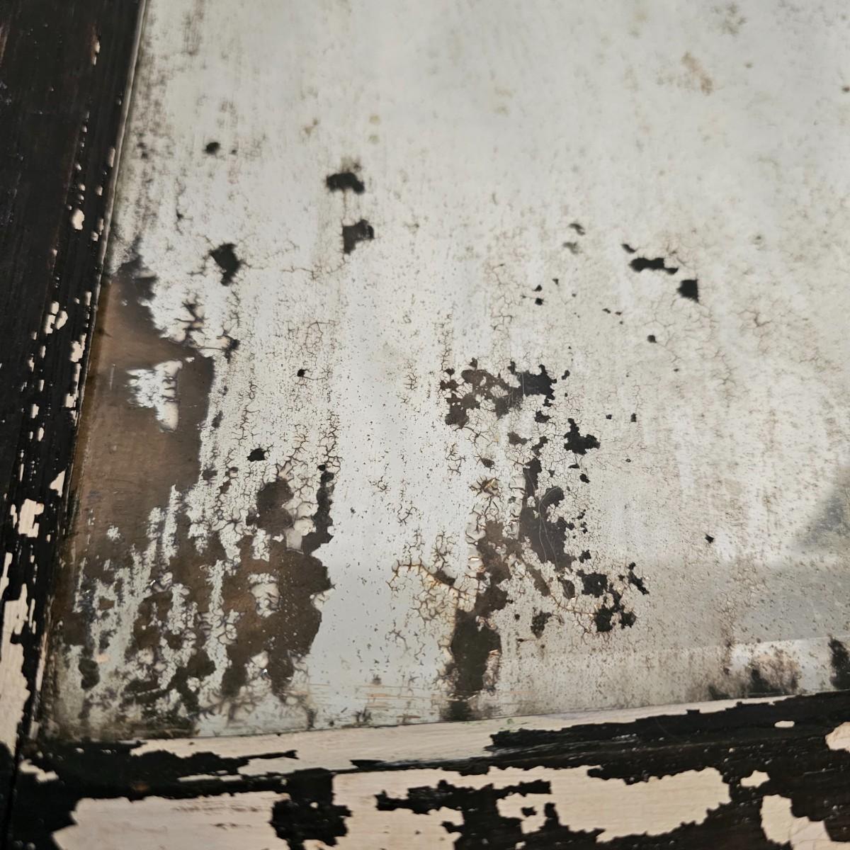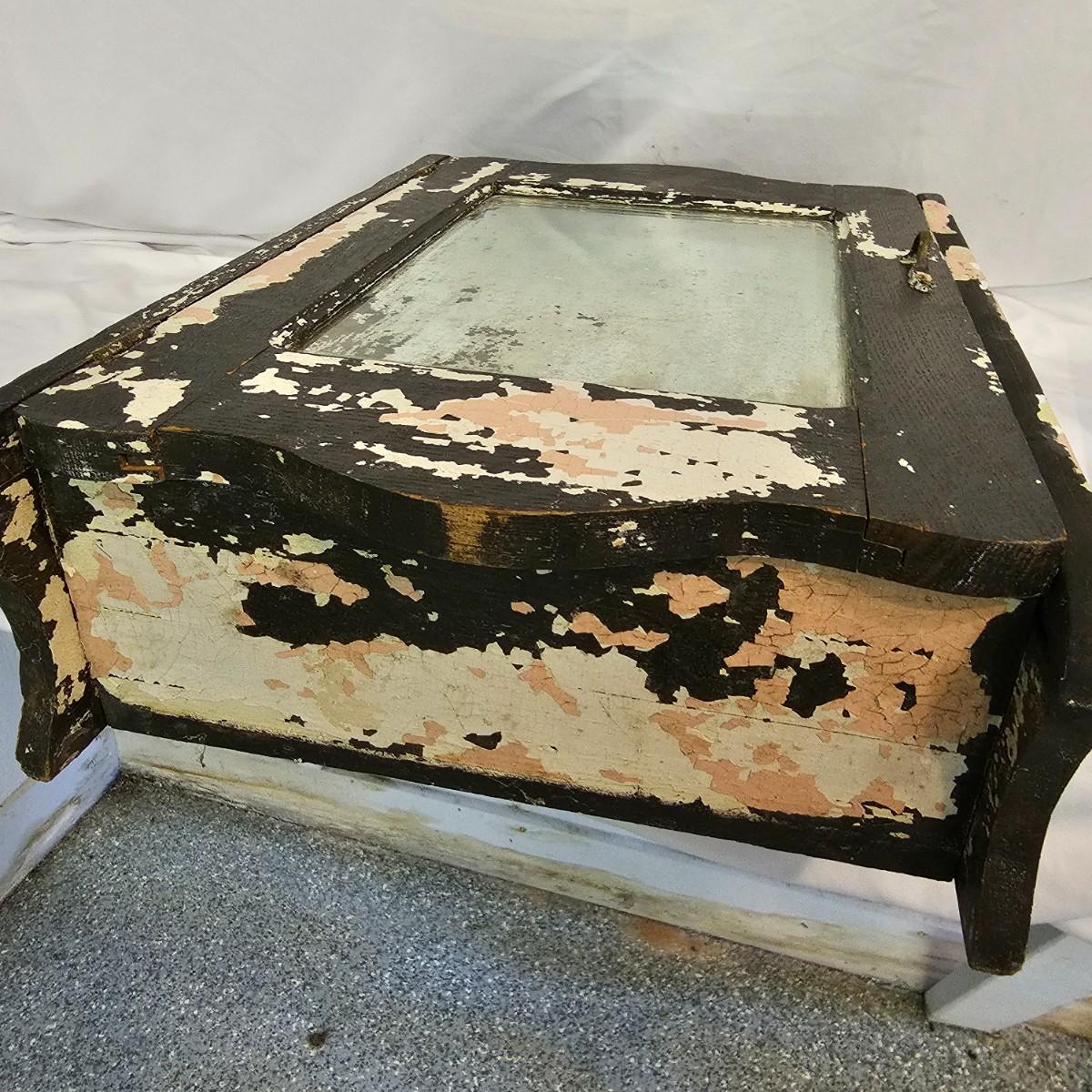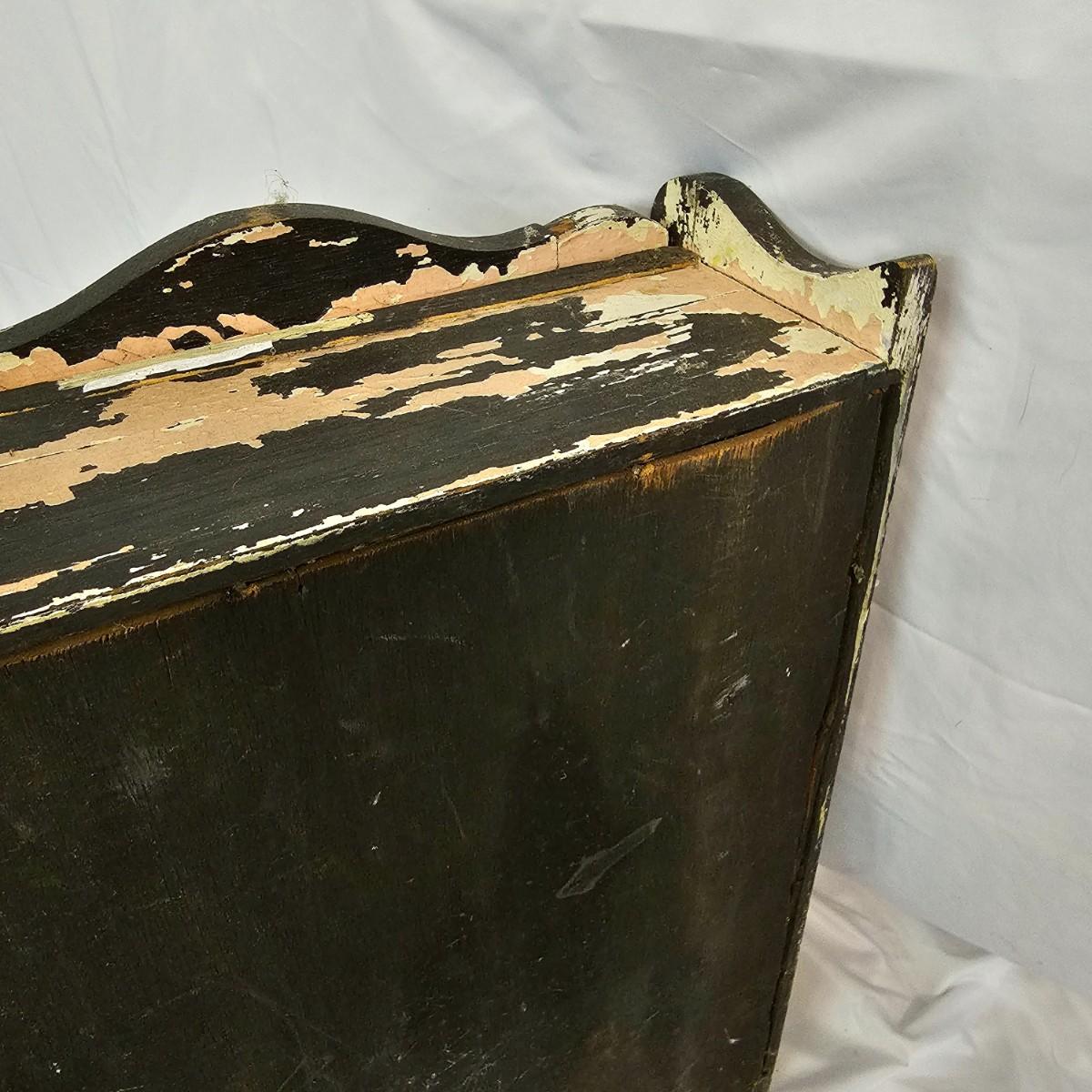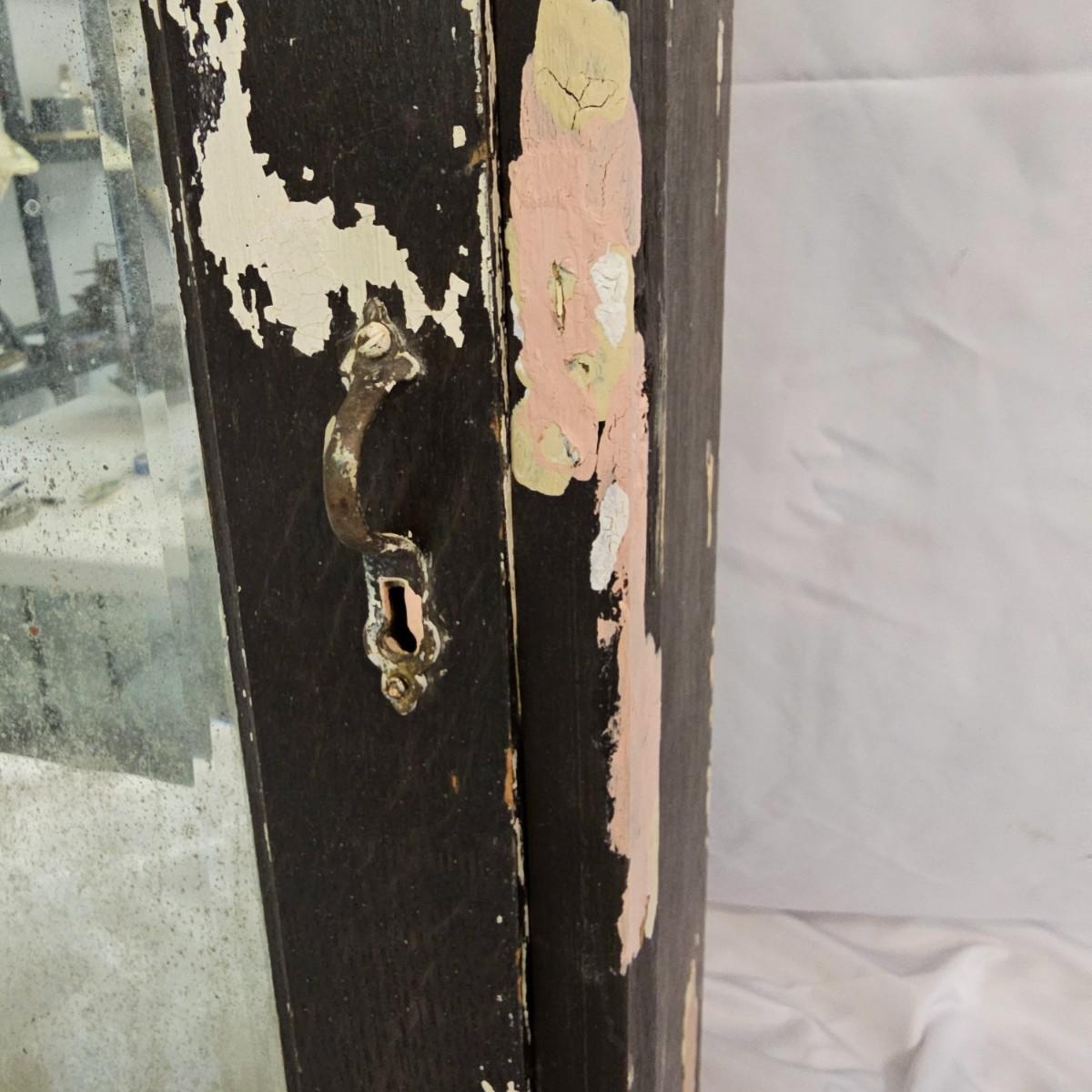 Solid wood wall cabinet with door, mirror and shelves. Several coats of paint visible. Plywood back, brass hardware. Cabinet measures 15" x 6" x 22"h. Please note that mirror coating is compromised and peeling. See photos for details. Local pickup only.