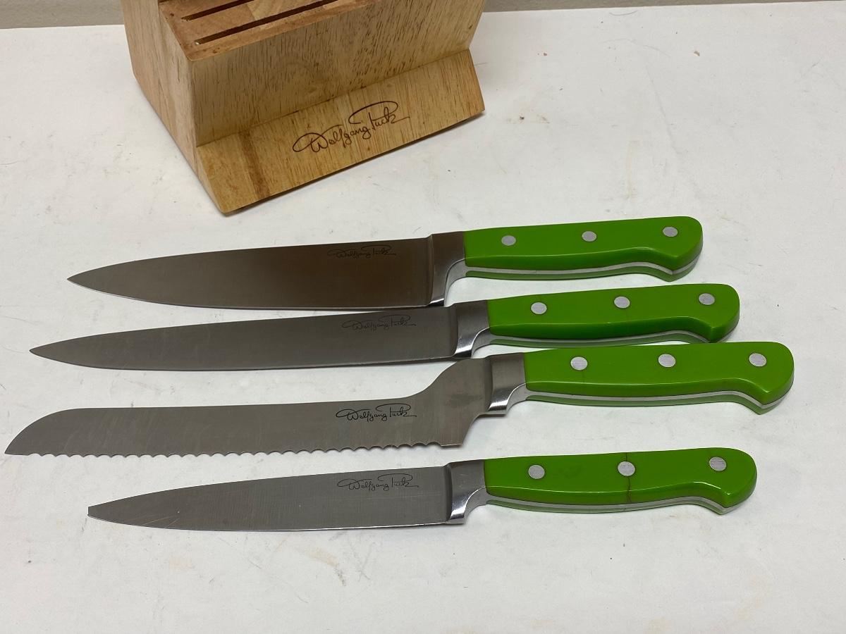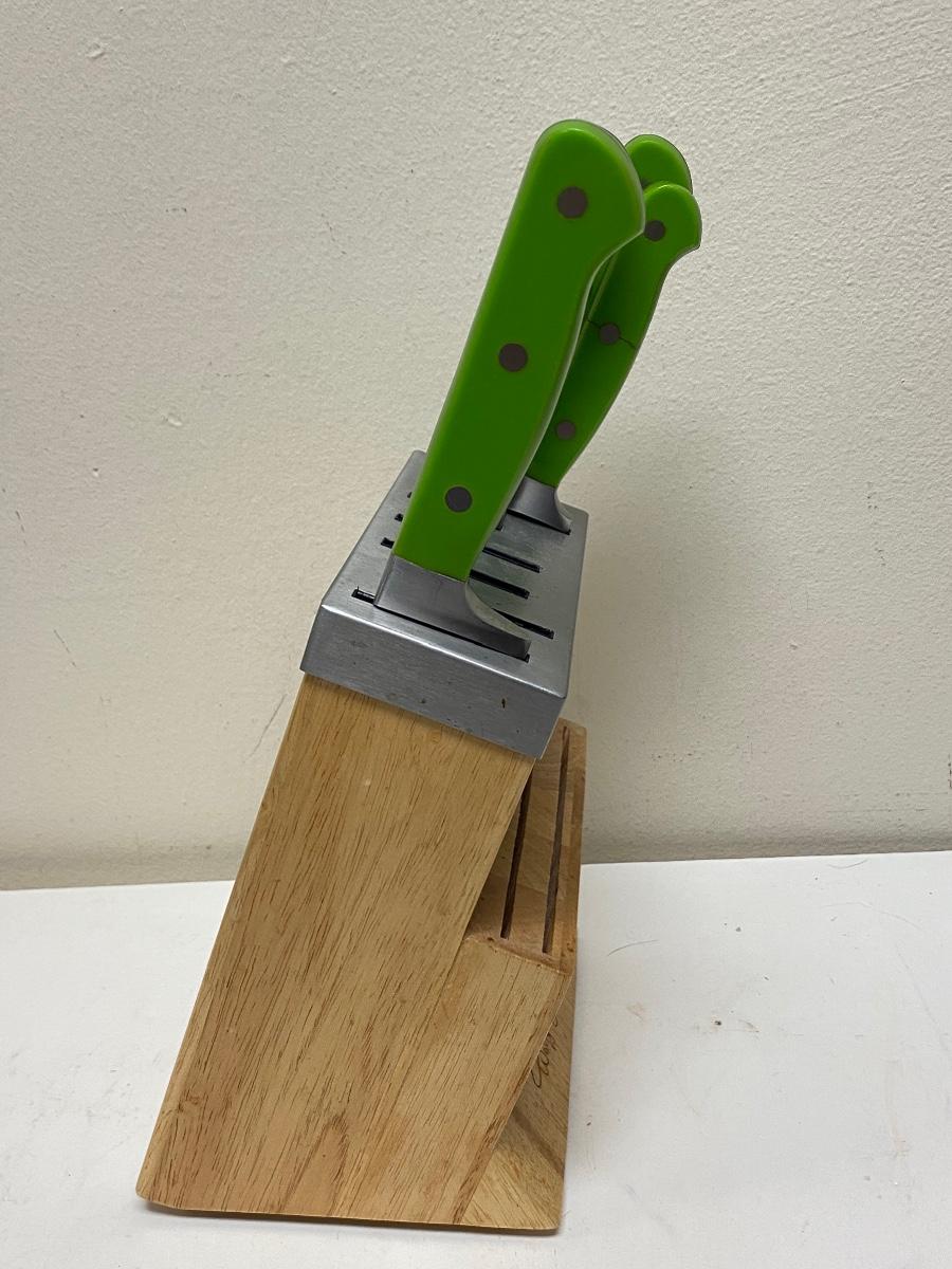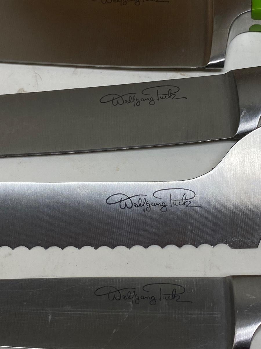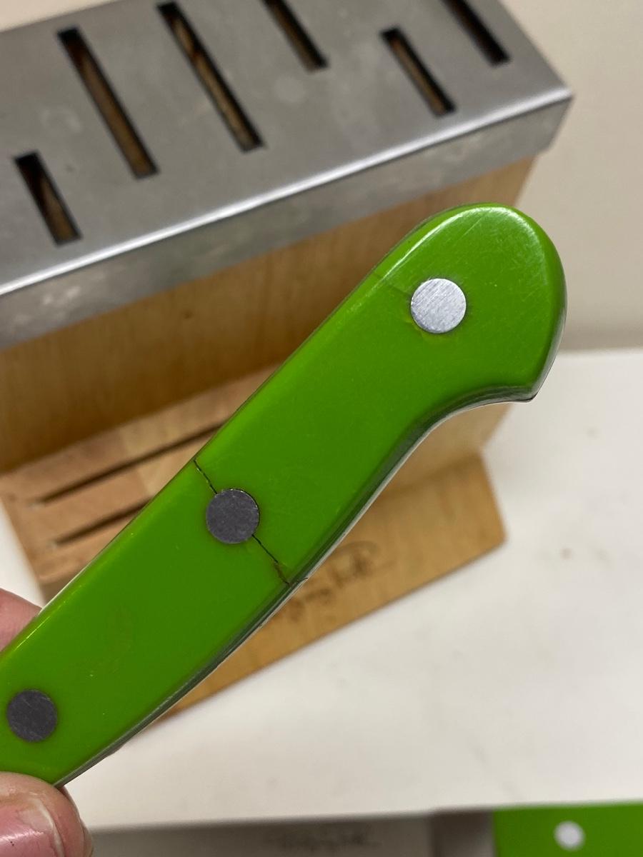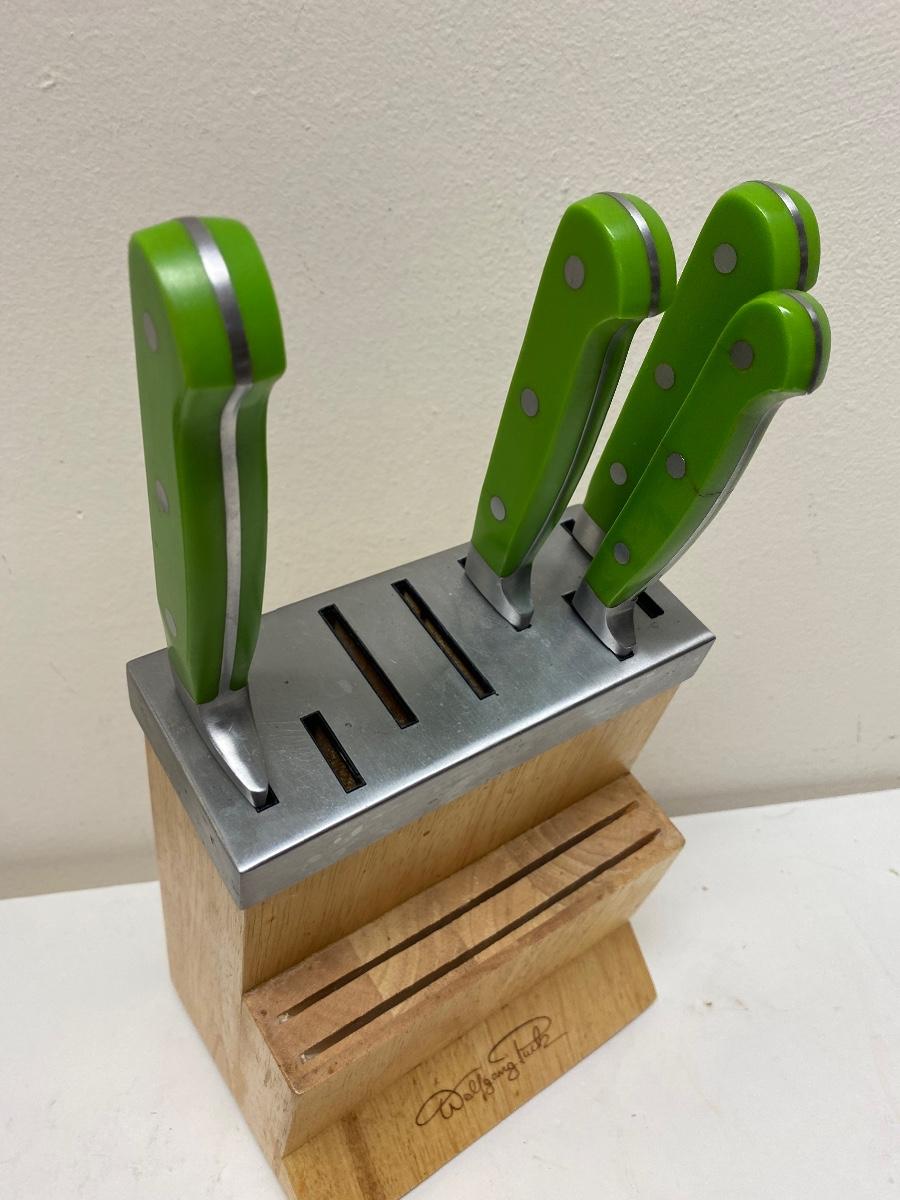 Retro Wolfgang Puck Green Handle Kitchen Knives Set, there is some light wear to the knives, check pictures for more details and for what kind of knives are included in the set. The set is missing three of its knives.