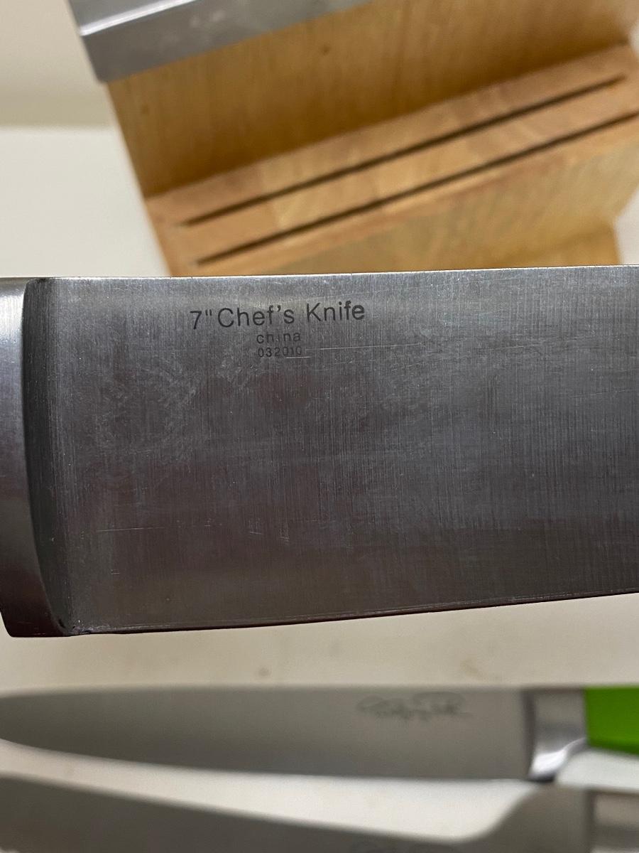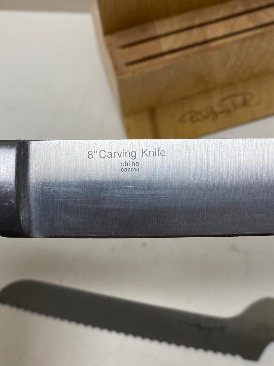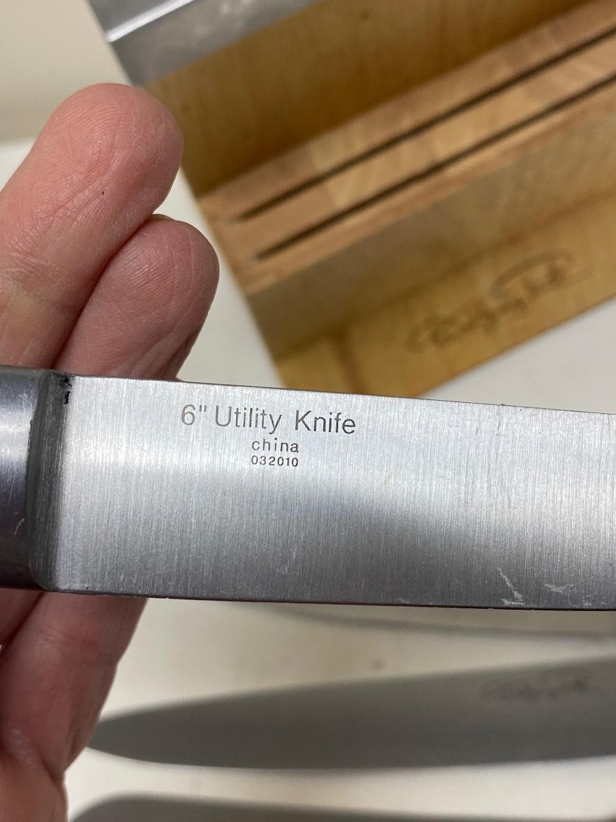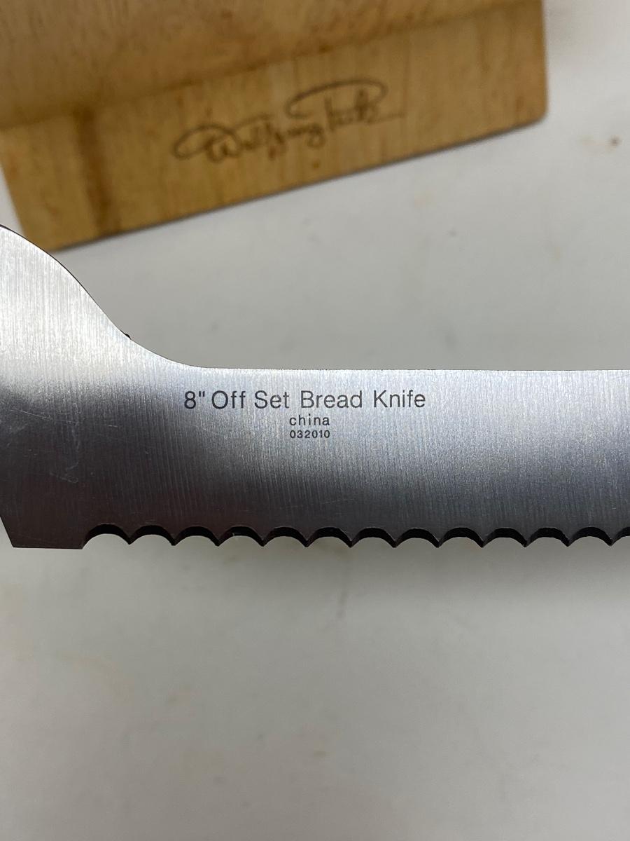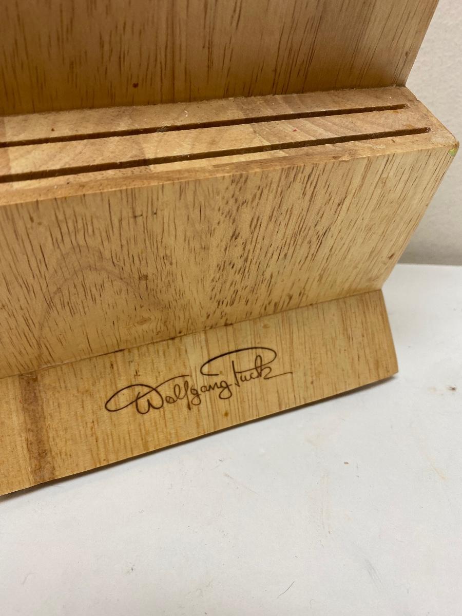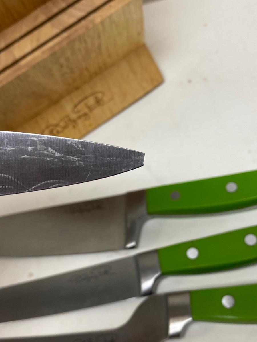 Retro Wolfgang Puck Green Handle Kitchen Knives Set, there is some light wear to the knives, check pictures for more details and for what kind of knives are included in the set. The set is missing three of its knives.