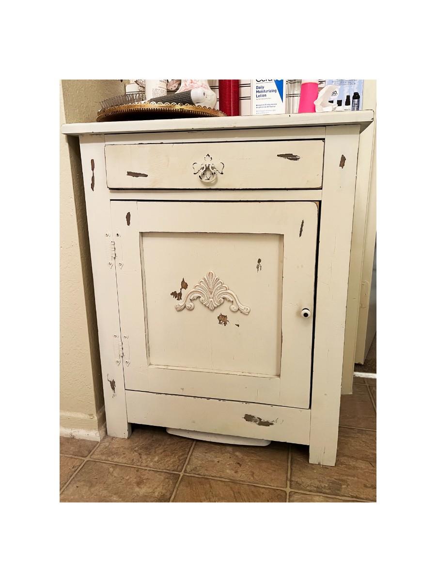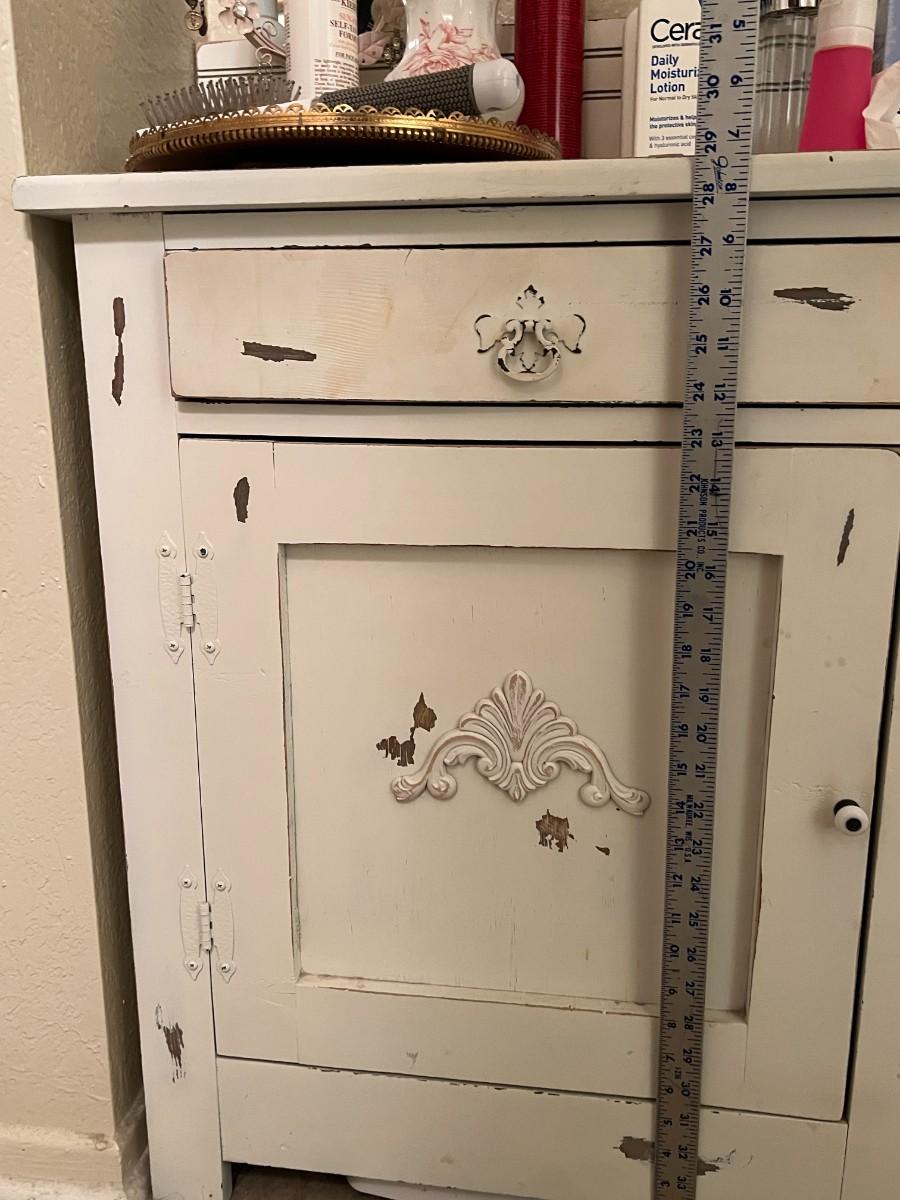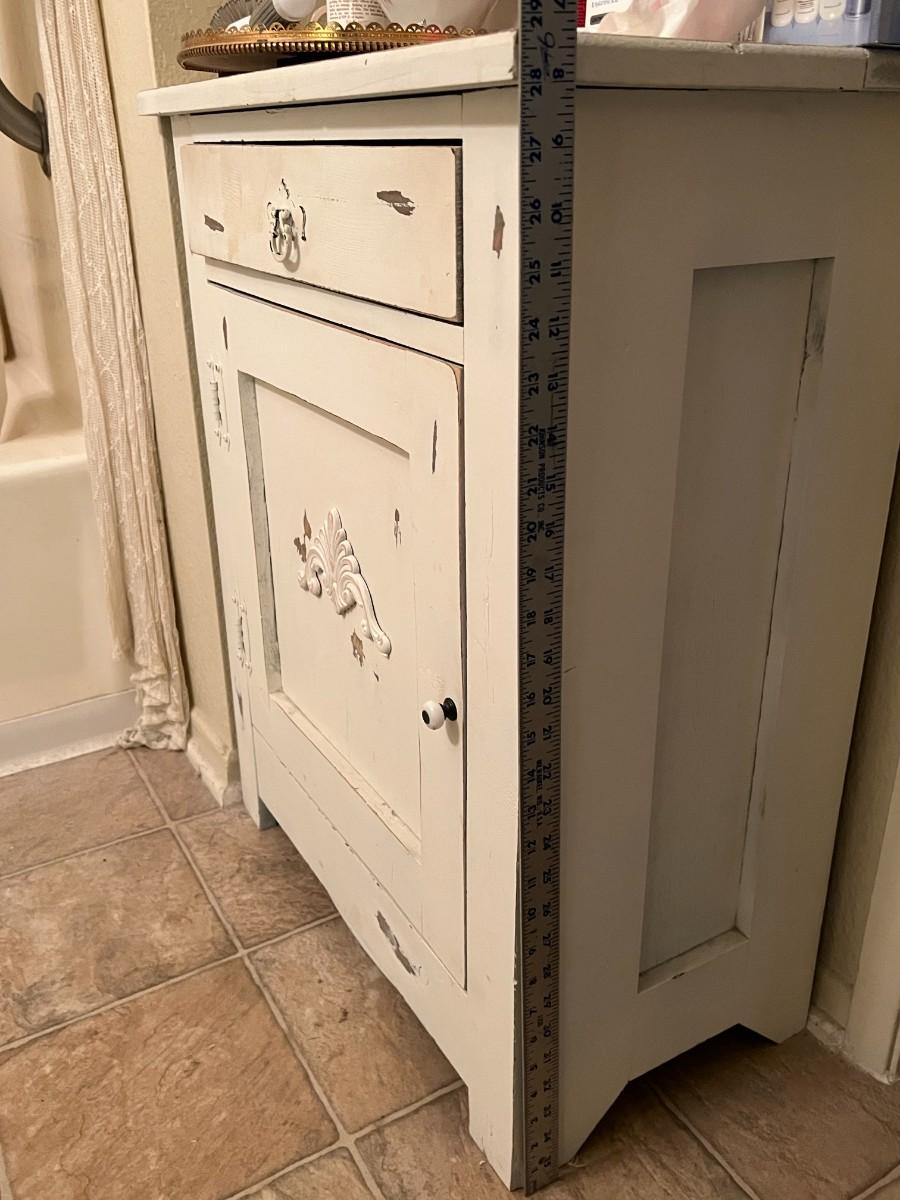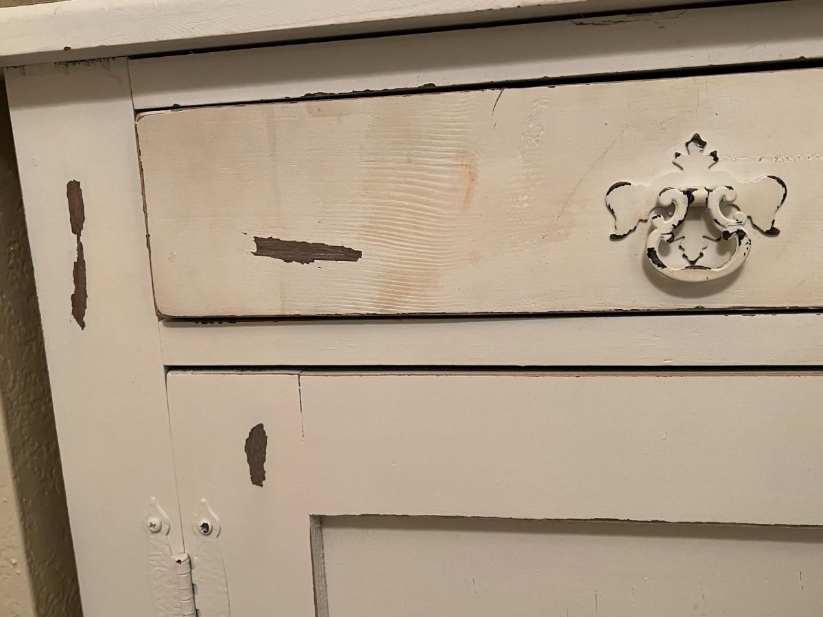 There are some signs of use and wear, check pictures for more details and for sizing. Items inside the cabinet are not included.