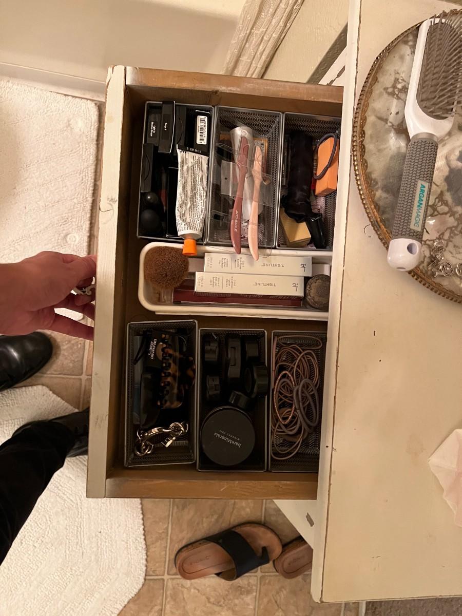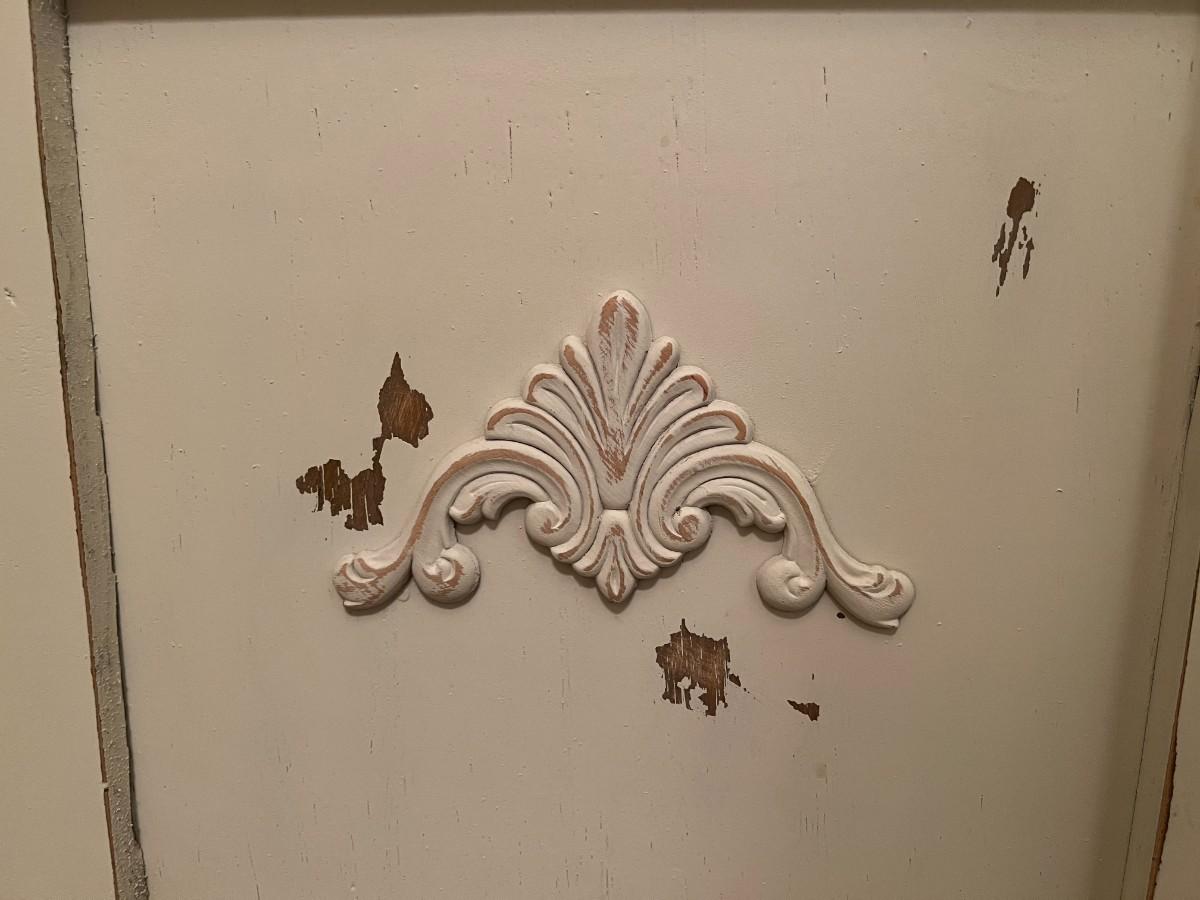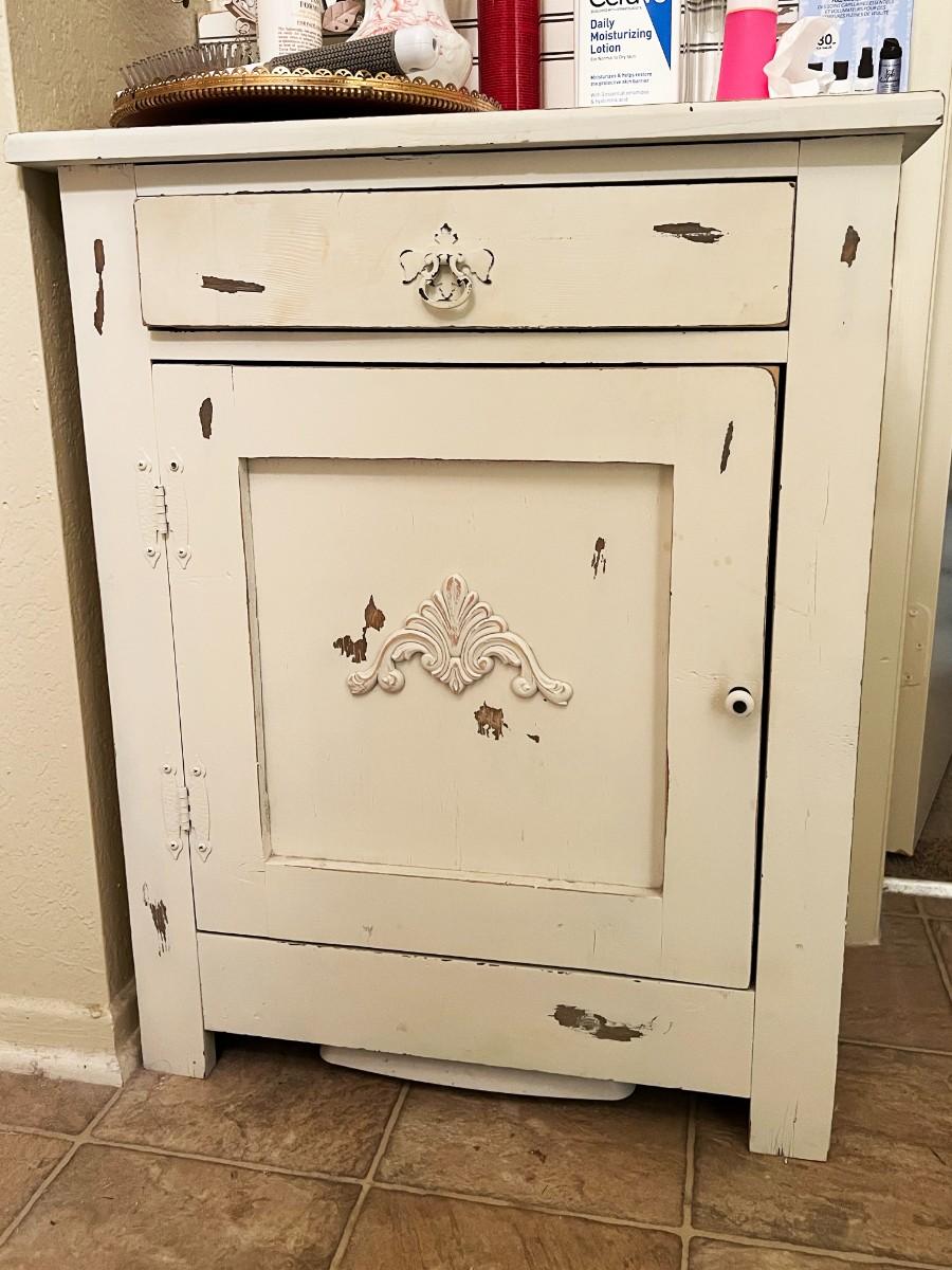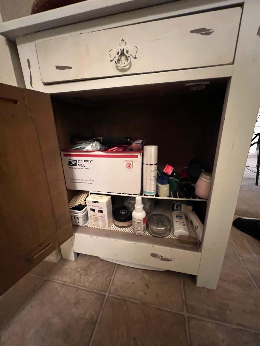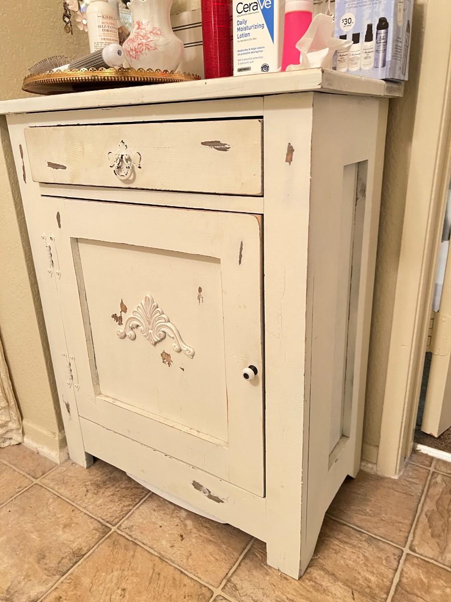 There are some signs of use and wear, check pictures for more details and for sizing. Items inside the cabinet are not included.