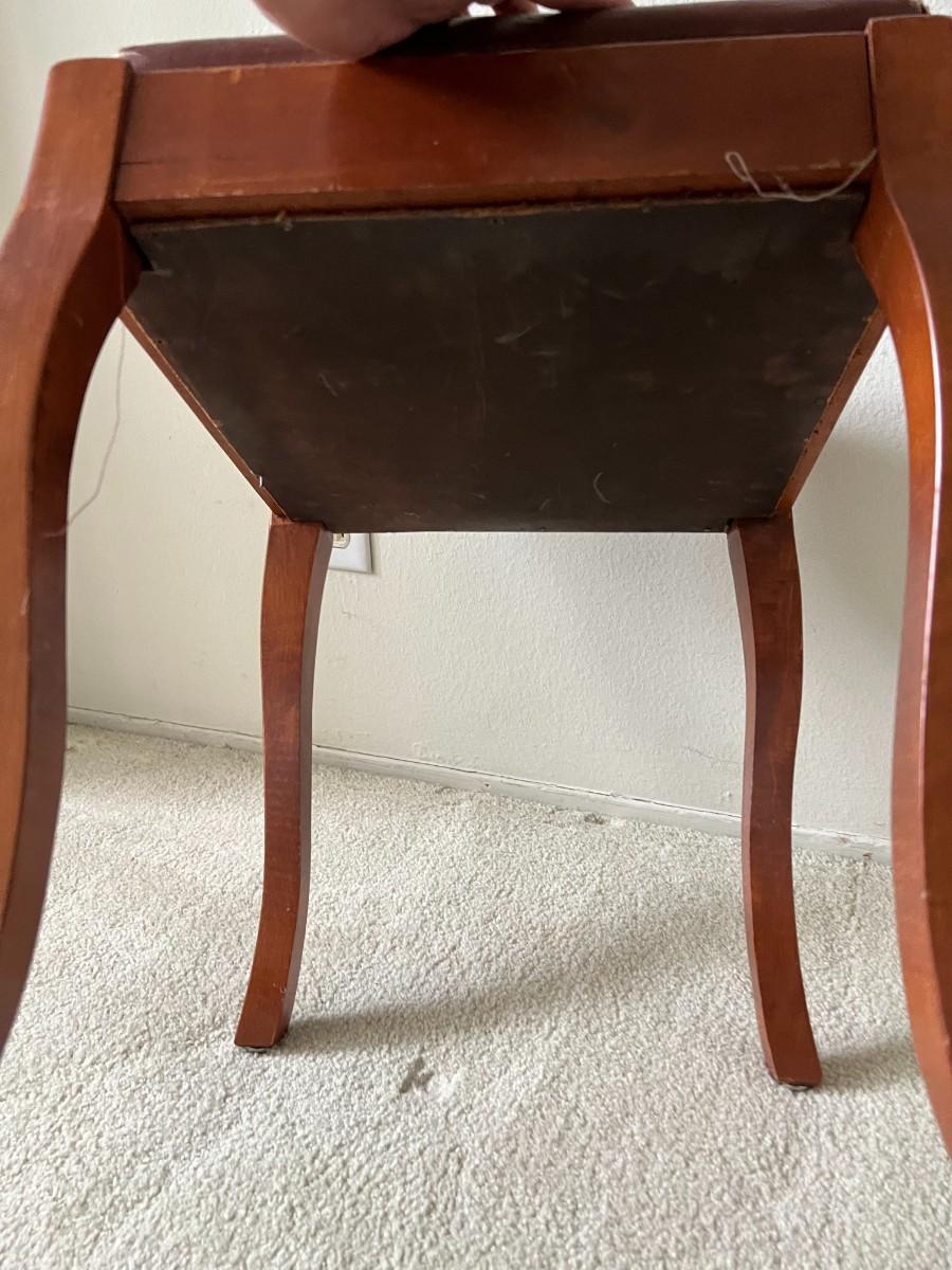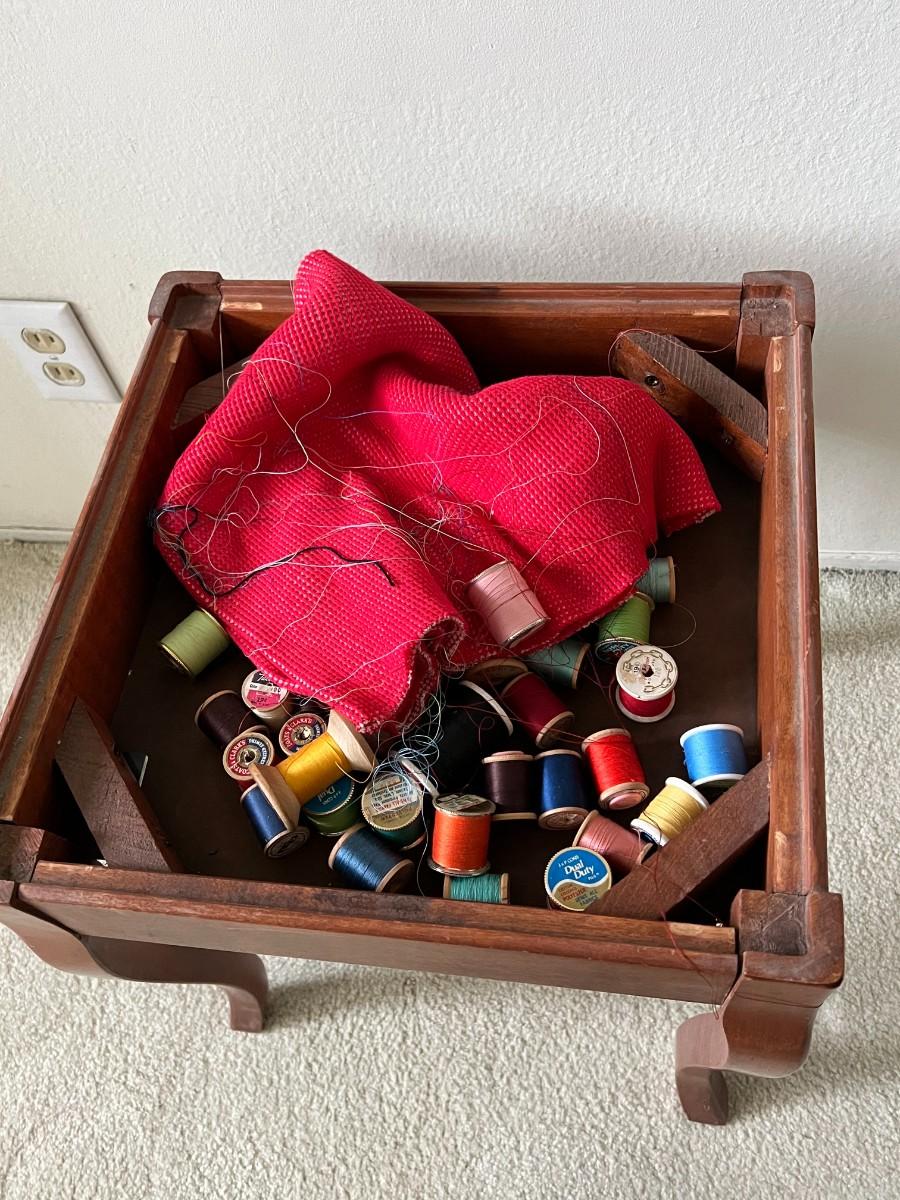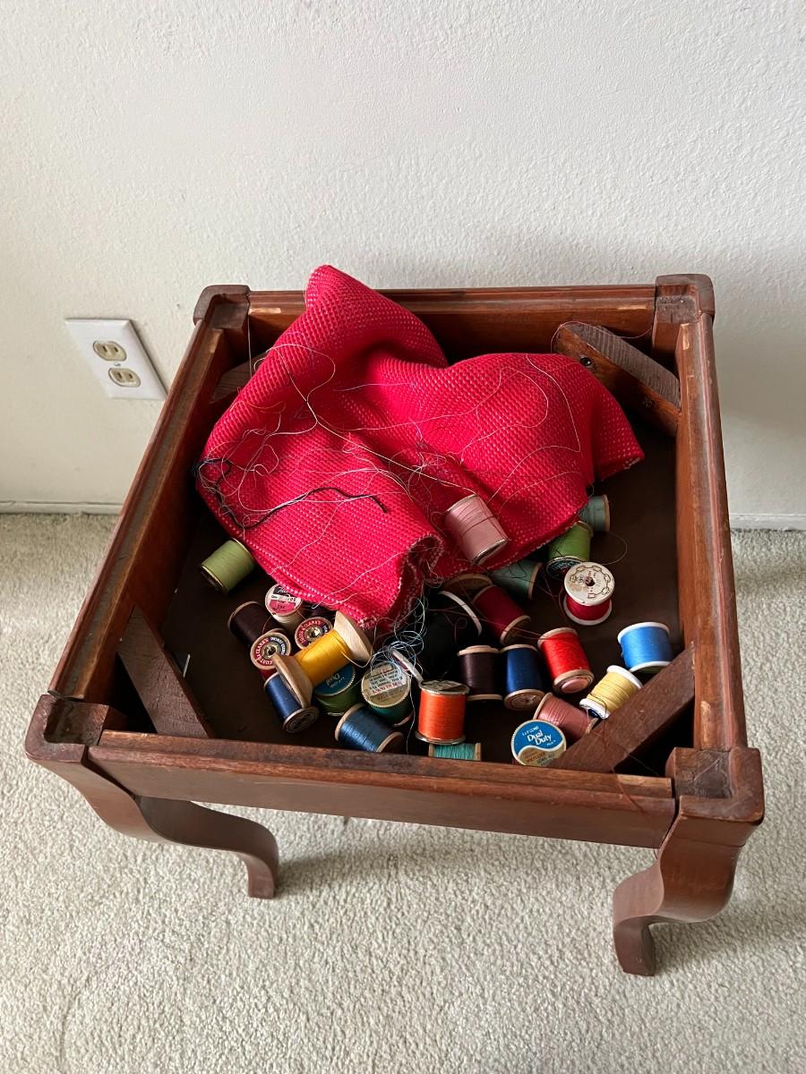 Retro Wood Upholstered Seat Sewing Crafting Storage Stool with Sewing Supplies