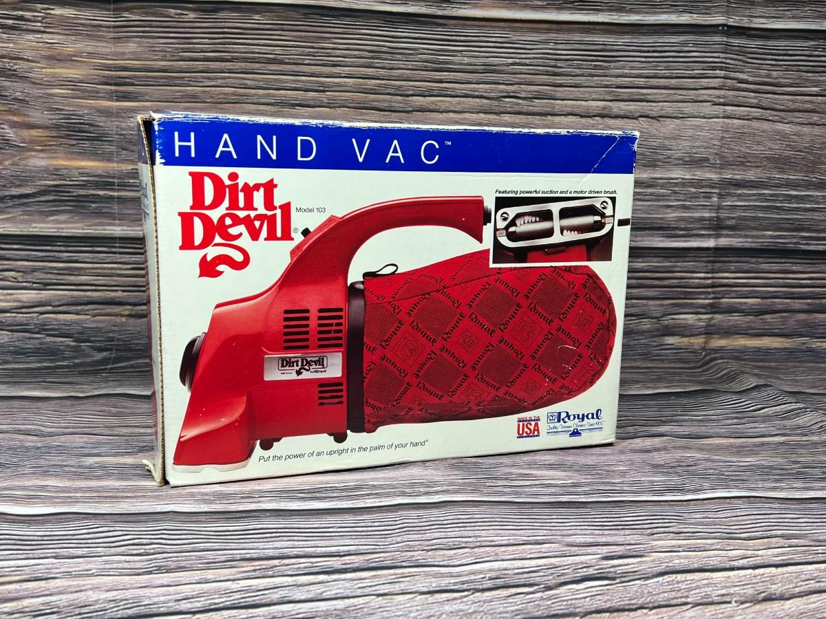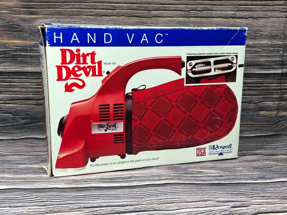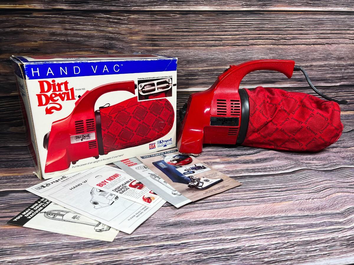 Retro Working Dirt Devil Royal Model 103 Hand Vacuum Cleaner, there is some wear, but there is no significant damage to the vacuum and is in good usable condition. Has been tested and works perfectly, check pictures for more details and for sizing.