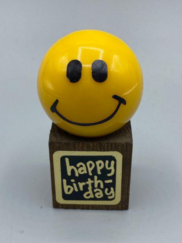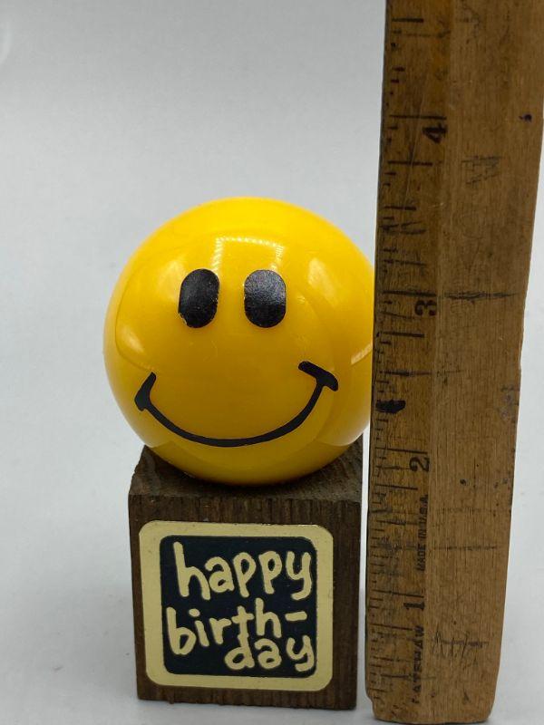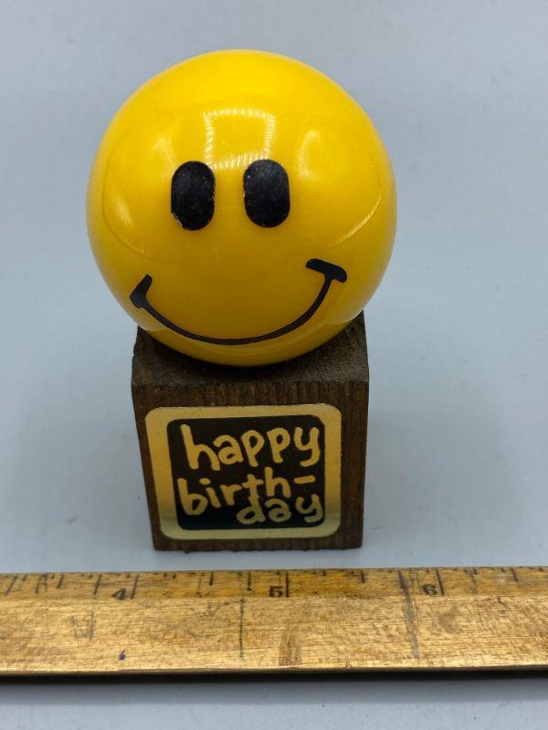 Brighten someone's birthday with this retro yellow smiley face paper weight. Sunshine yellow face on wood block. Only 1.5" wide and about 3.5" tall, light signs of wear.