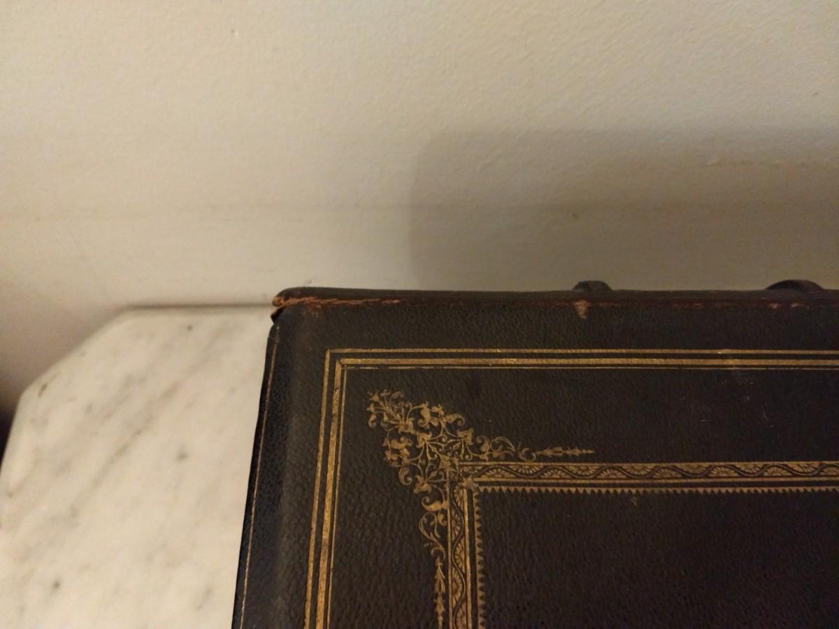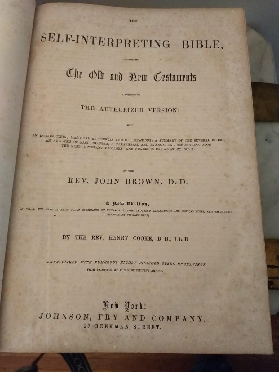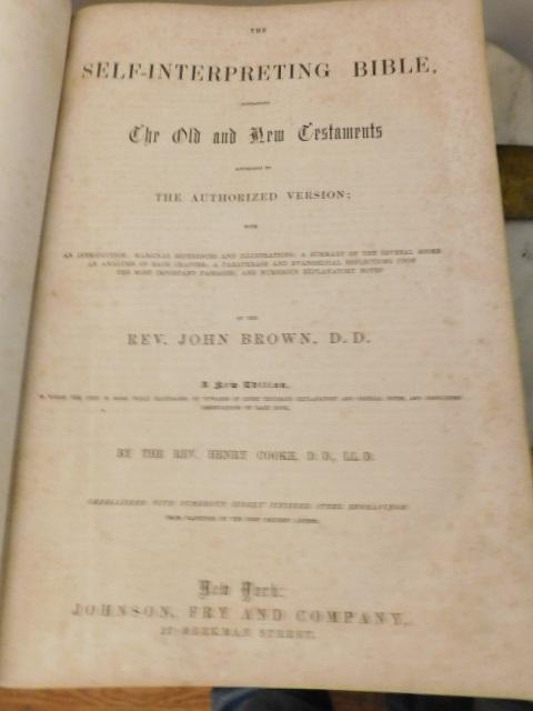Rev. John Brown's Self-Interpreting Bible Published by Johnson, Fry and Co. with Brass Cover Clips cover has some wear and pages have evidence of climate issues and there is personal inscription present