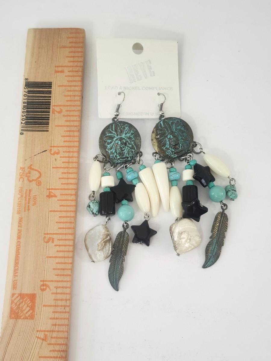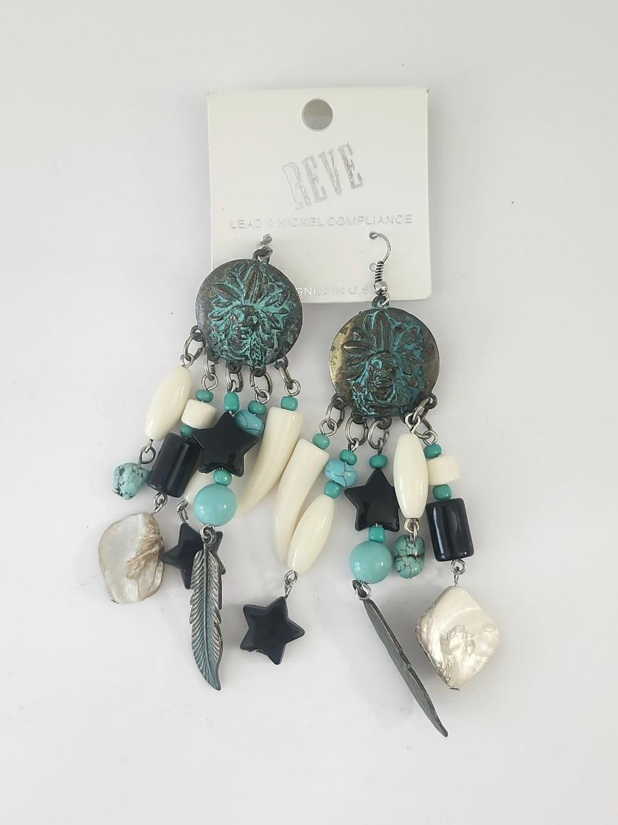 Statement drop earrings on original REVE display card marked lead and nickel compliance. Each earring features a round metal medallion with raised face motif and turquoise toned patina finish. Multiple dangling elements include turquoise tone beads, black star shaped beads, ivory tone elongated beads, black cylindrical beads, and irregular shell like accents, along with feather and spike shaped metal charms. Silver tone hooks with mixed metal and bead fringe creating a layered western boho look. All materials and details described strictly from visible characteristics only.