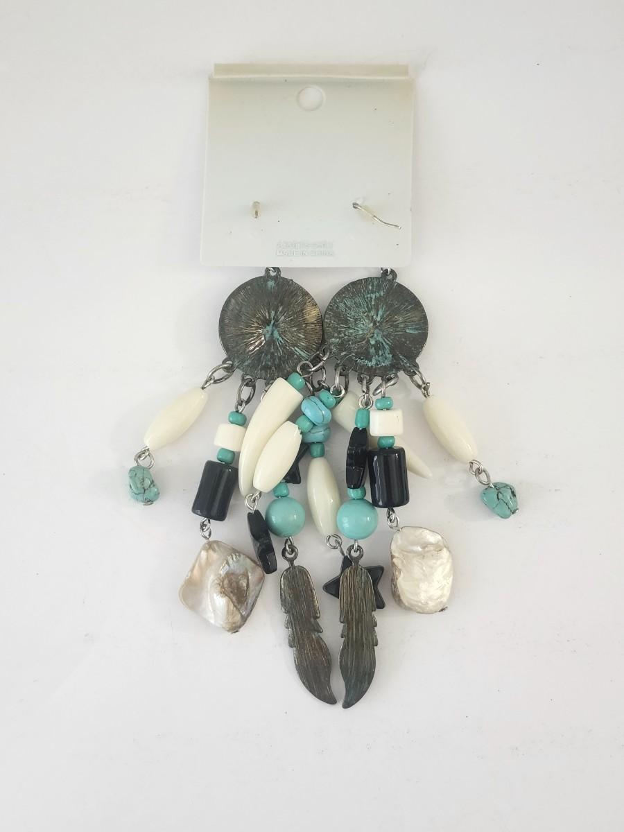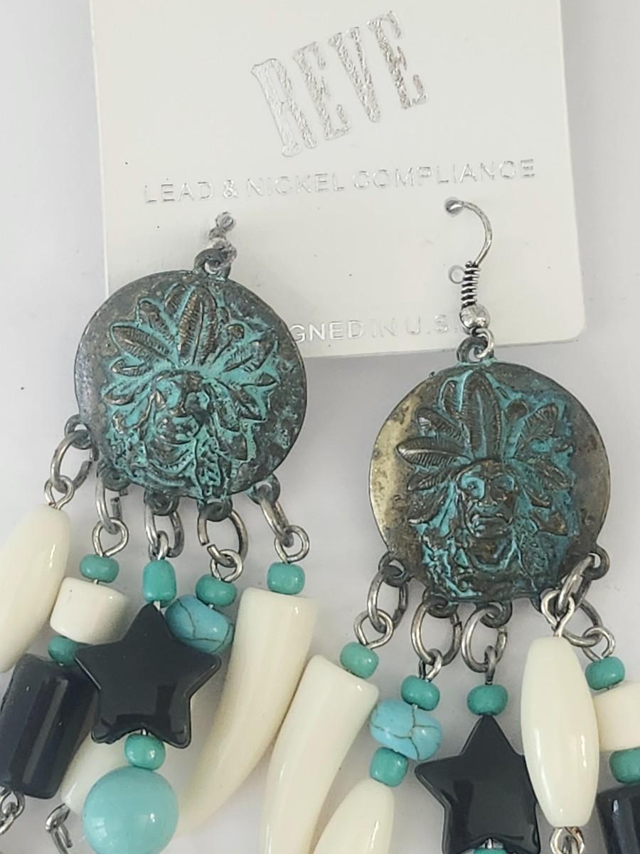 REVE Western Style Dangling Bead Earrings Patina Medallion Turquoise Tone Black Ivory Accents