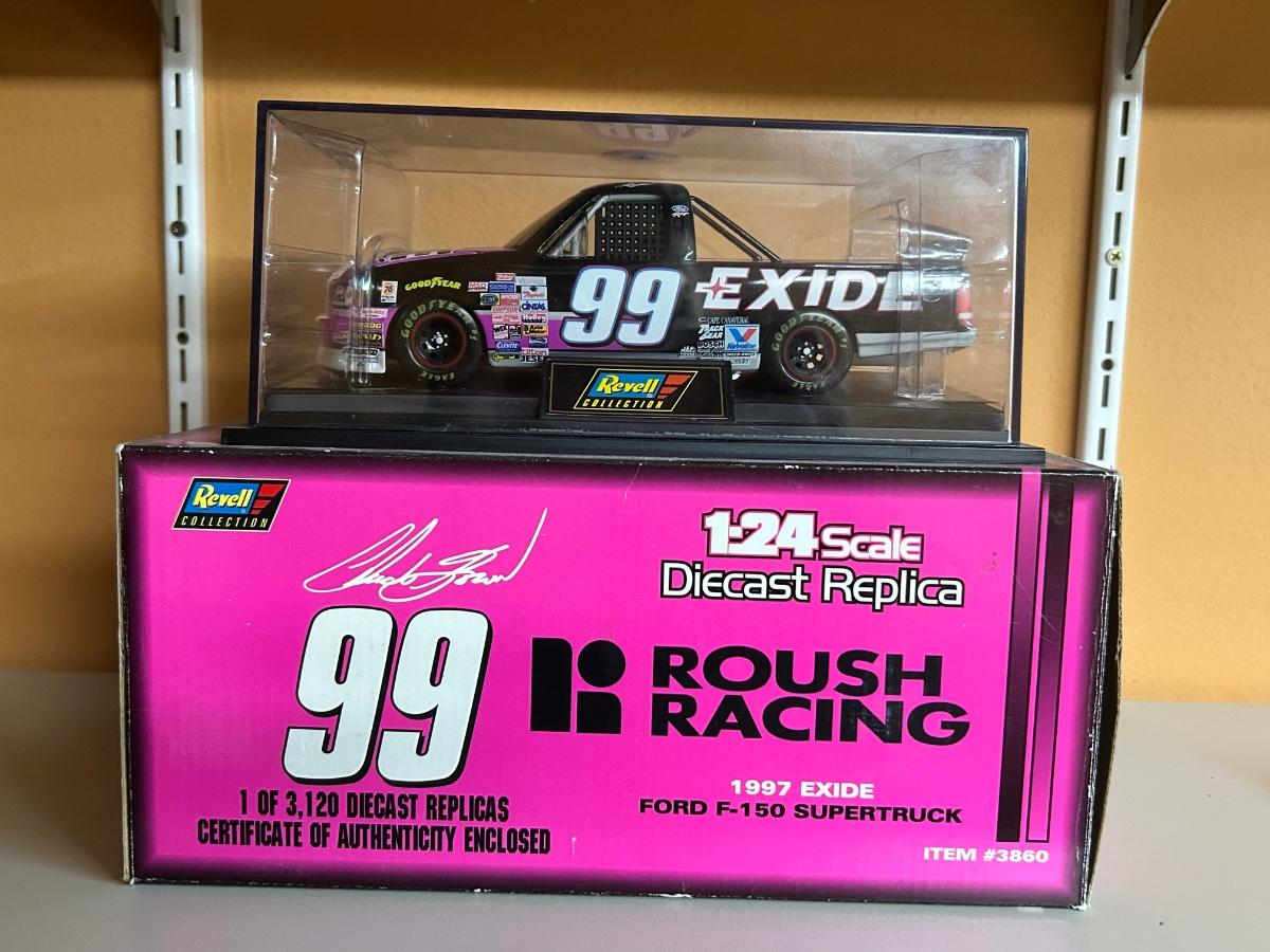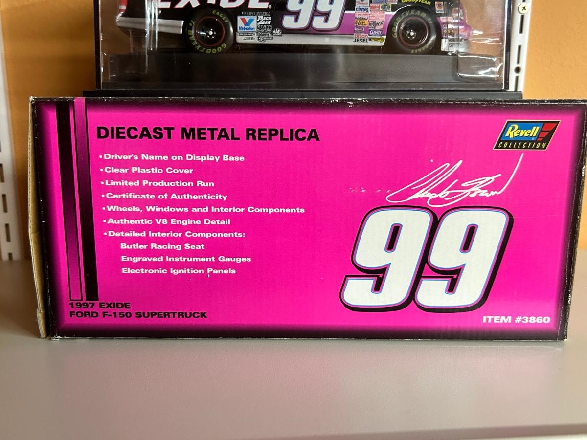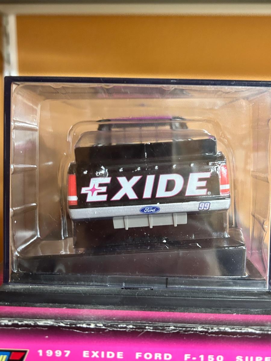 The item is a 1:24 scale diecast replica of the #99 EXIDE Ford F-150 Supertruck driven by Chuck Bown in the 1997 NASCAR season.