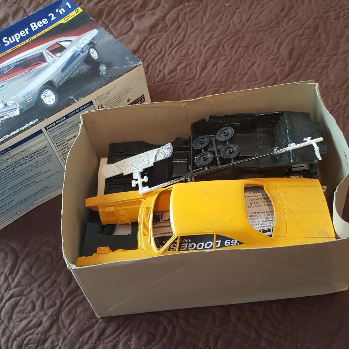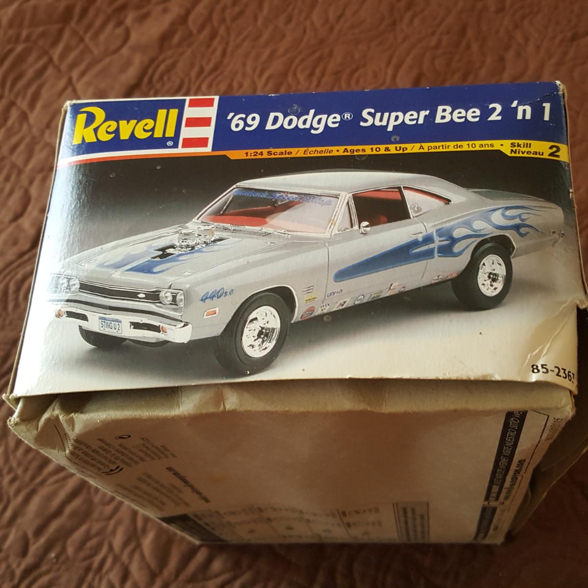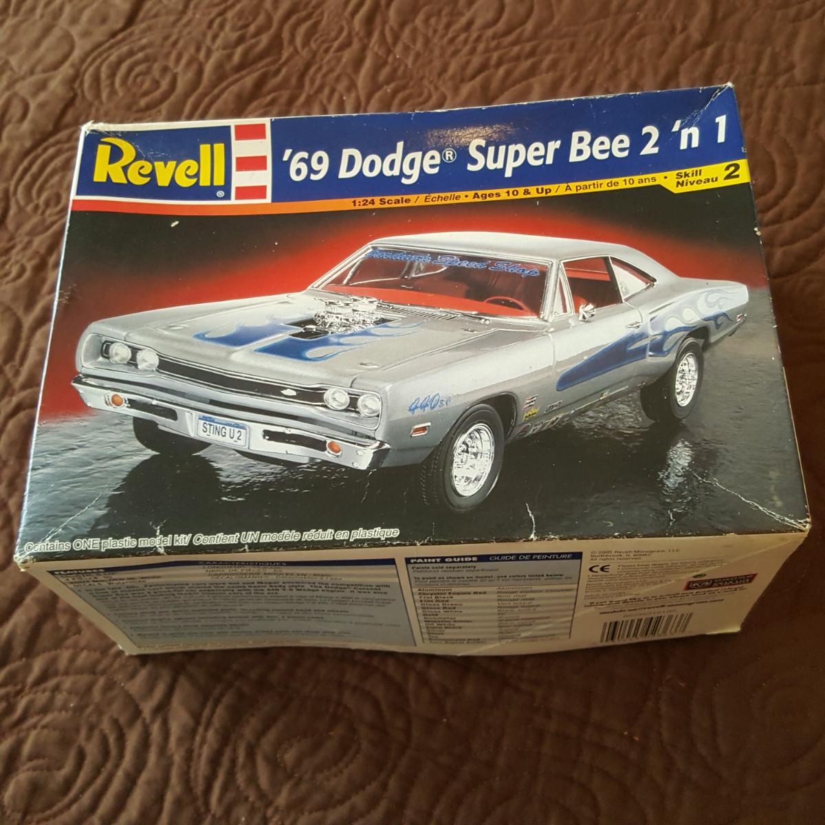 This auction lot is for a Revell '69 Dodge Super Bee Model Kit. This kit has a copyright date of 2005. It has been partially constructed with some levels of painting on some parts. Most parts are still attached to the molding stems. We have not verified that all parts are included in the kit. This kit does have several tubes of glue and marking paint sticks. The box was stored in an outdoor shed and has some weathering and watering marks and dusty residue.