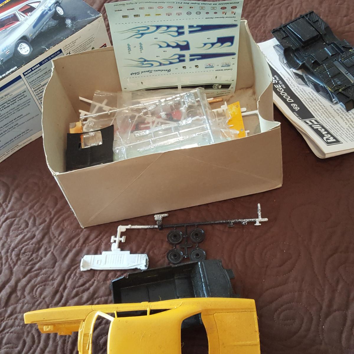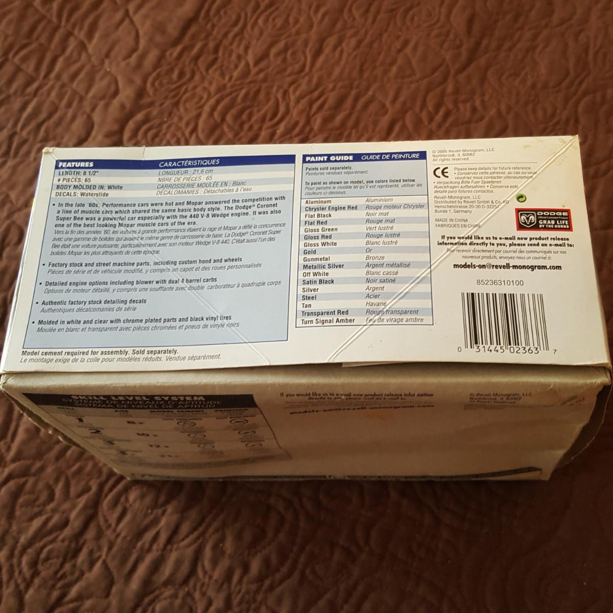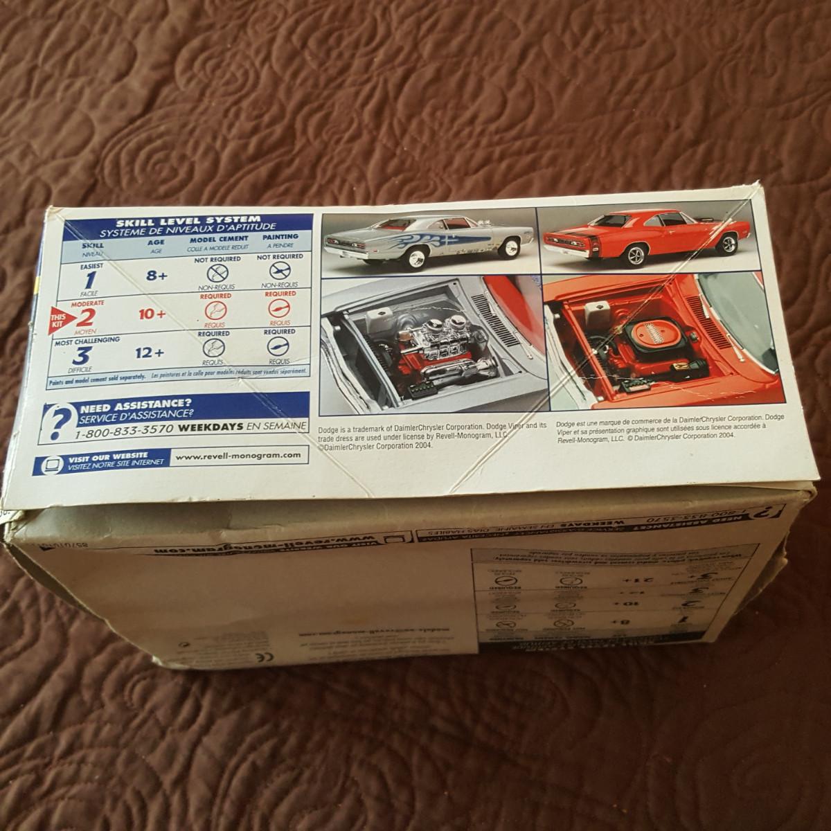 This auction lot is for a Revell '69 Dodge Super Bee Model Kit. This kit has a copyright date of 2005. It has been partially constructed with some levels of painting on some parts. Most parts are still attached to the molding stems. We have not verified that all parts are included in the kit. This kit does have several tubes of glue and marking paint sticks. The box was stored in an outdoor shed and has some weathering and watering marks and dusty residue.