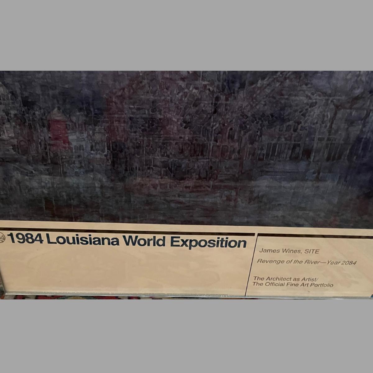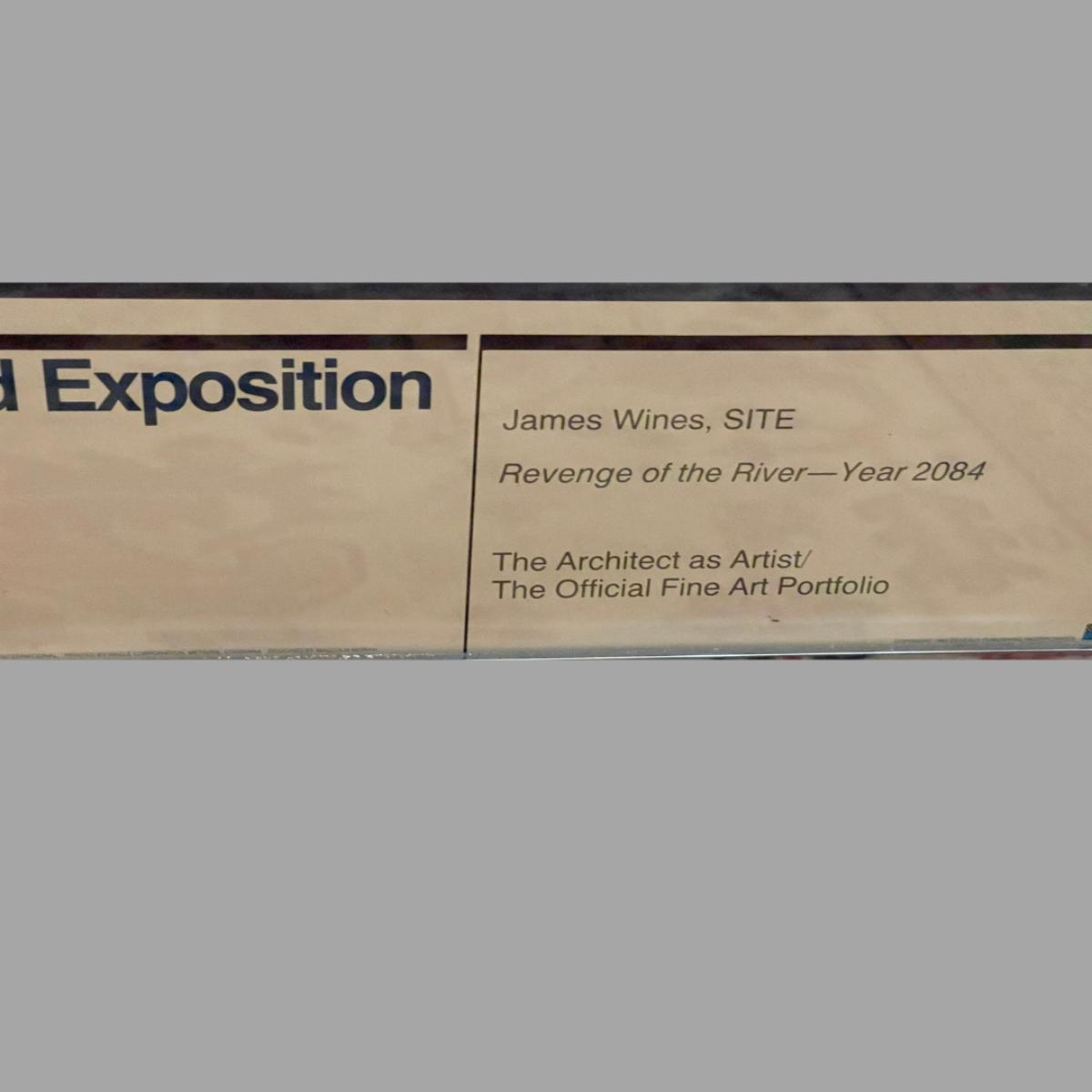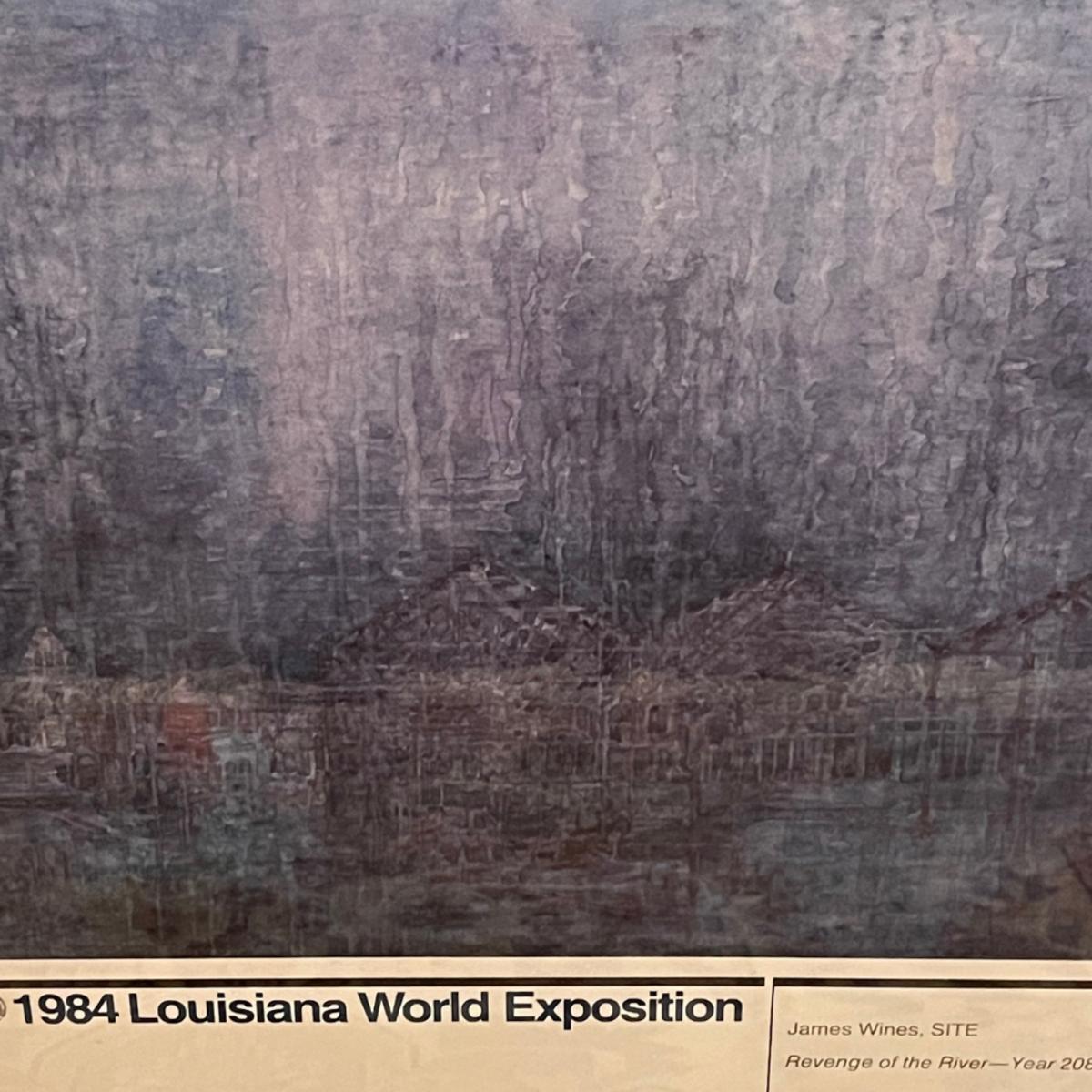 This is one of the most spectacular prints I have ever seen. This comes from the book SITE: IDENTITY IN DENSITY by James Wines. It is his glimpse into the year 2084 where the river has consumed everything including the 1984 World Expo in NOLA. If you look at the enlarged pictures, you can see the 1984 worlds fair hidden under the water. Wines had many theories on density and used NOLA as an example. This piece is priceless. It is framed and measures 35 x 25.
