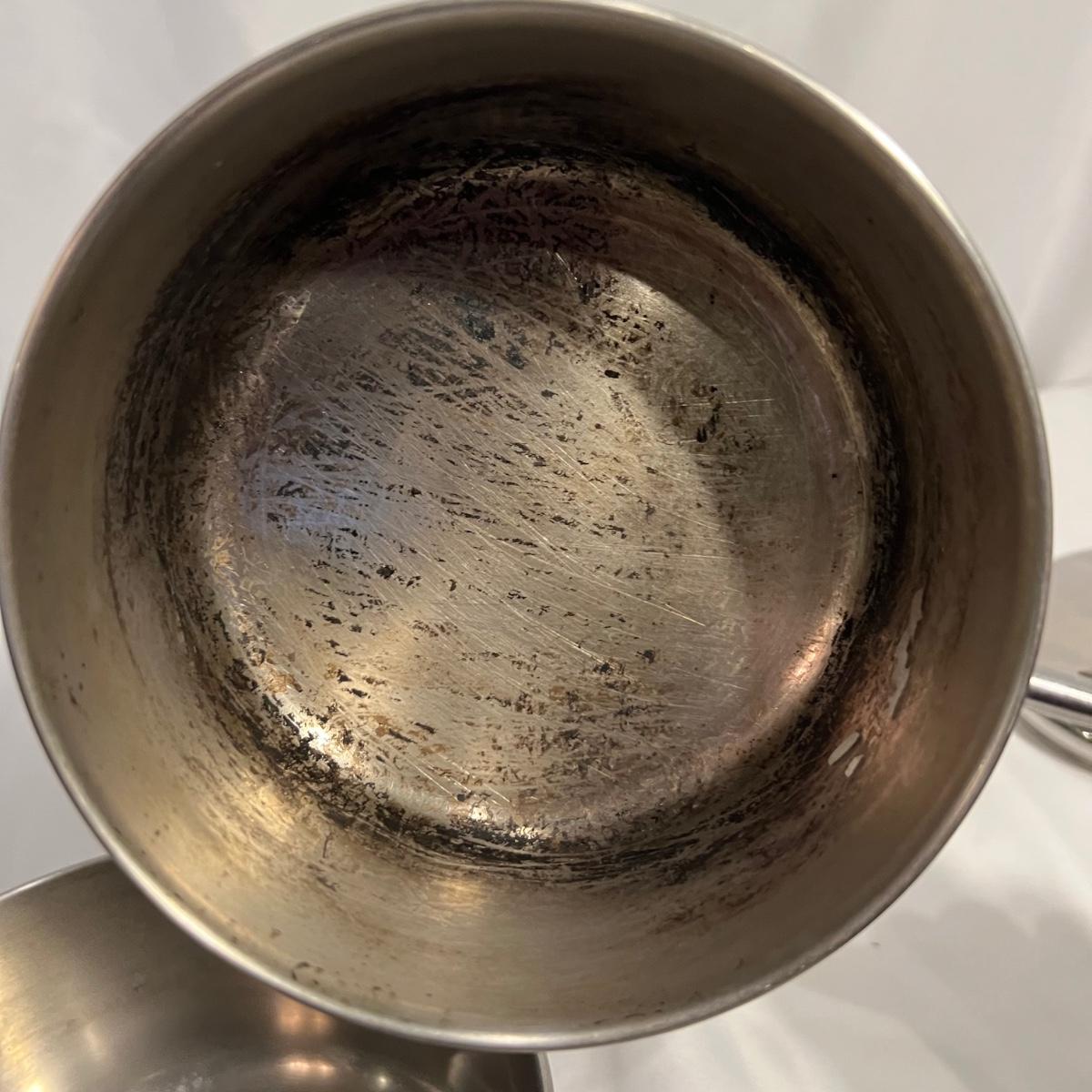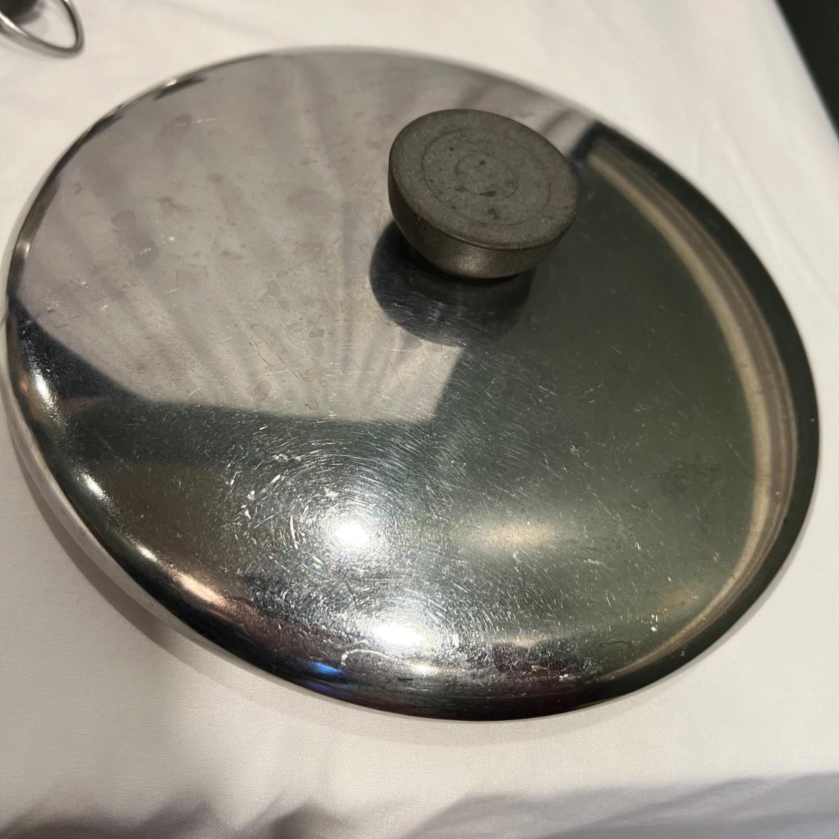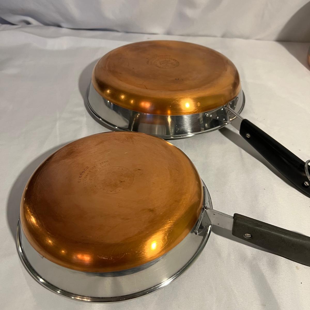 Three pots and two skillets in this copper clad Revere Ware. Two of three pots have lids and lot comes with an extra lid that does not fit any of these pans. Skillets do not have lids. The smallest pot has black marks inside that may not come clean, all the rest are clean.