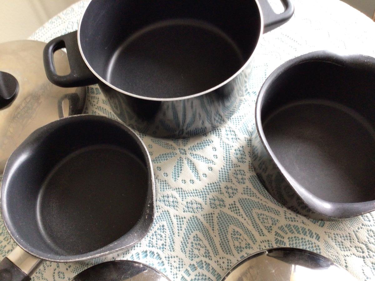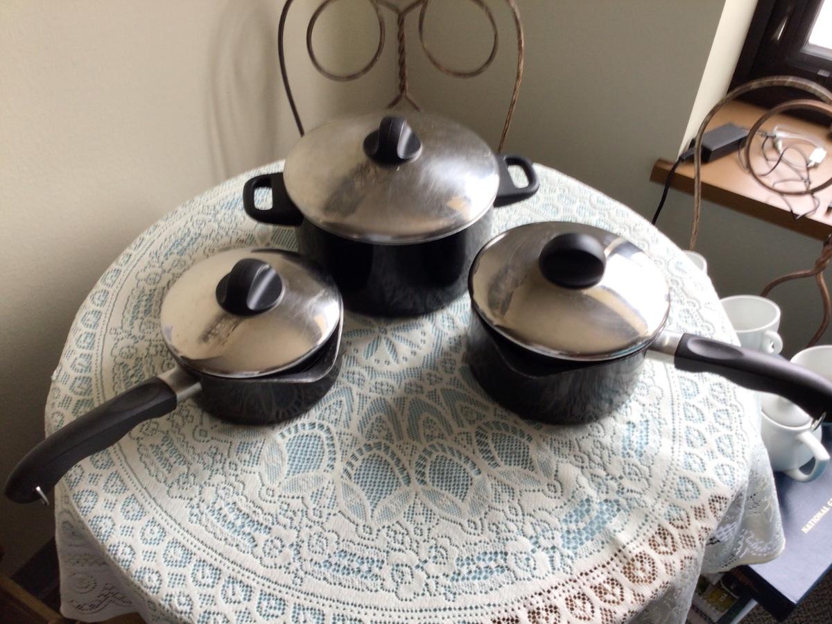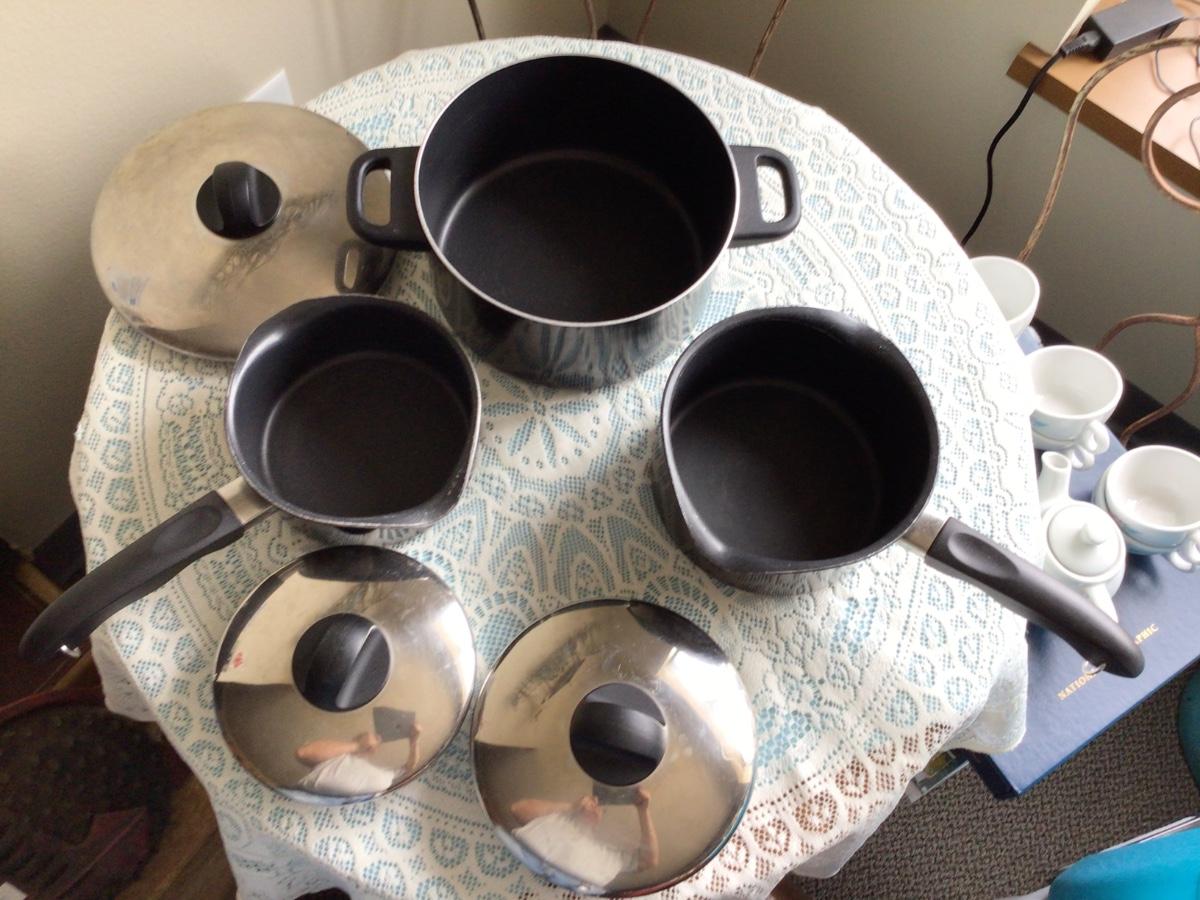 You get three pots and pans with lids from Revere Ware. All used condition.