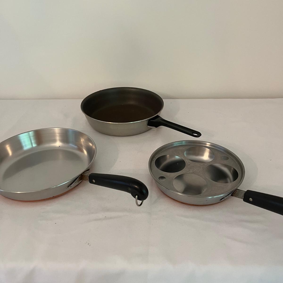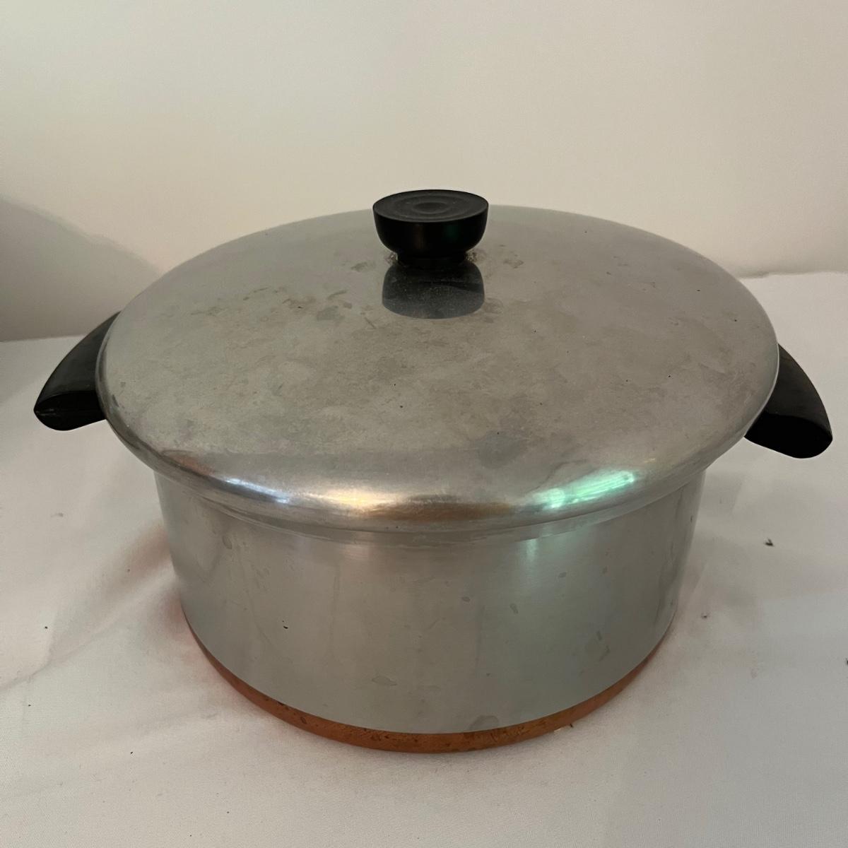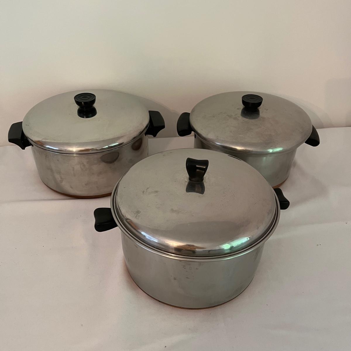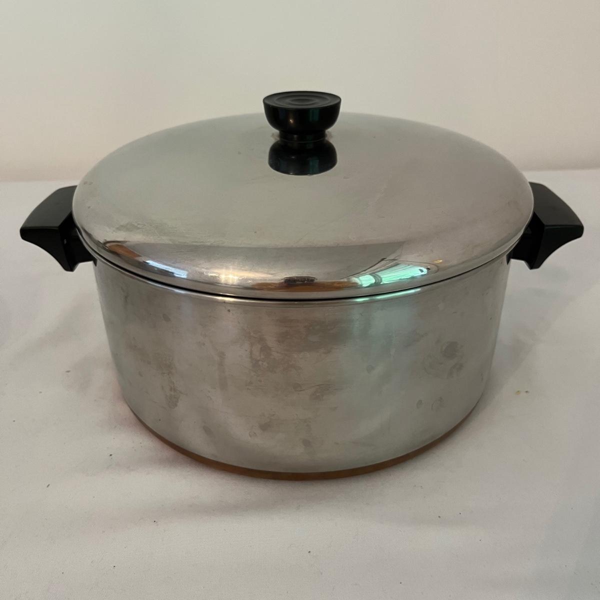 This lot includes 8 Revere Ware pots, 2 Revere Ware pans, lids, and more. The Revere kitchenware is stainless steel with a copper bottom. The pots all have small signs of wear on the bottom (see photos). The largest pot measures about 13” x 10” x 7”H. Look out for four Williams-Sonoma egg cup set to go with a pan elswhere in the sale. Shipping available. Shipping can be costly. We suggest contacting our preferred local shipping provider, Postage Express, with dimensions and getting an estimate before bidding: (828) 670-5501.