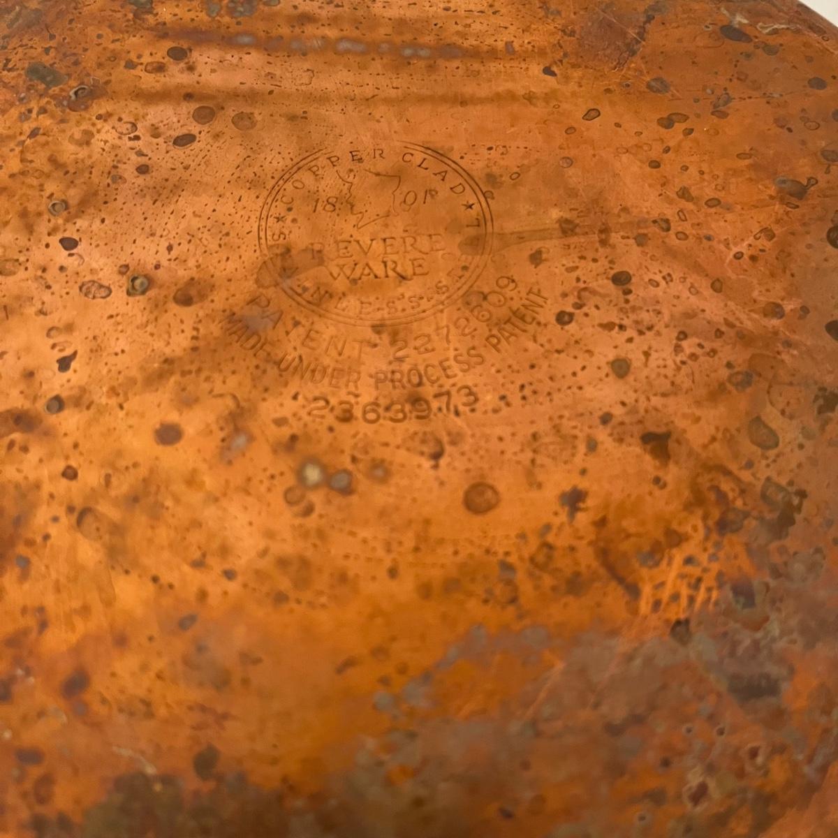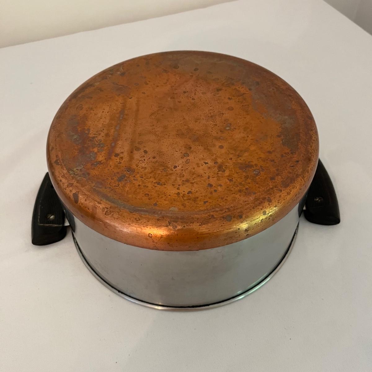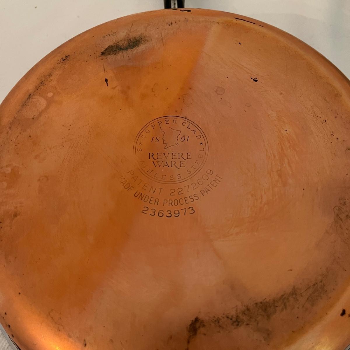 This lot includes 8 Revere Ware pots, 2 Revere Ware pans, lids, and more. The Revere kitchenware is stainless steel with a copper bottom. The pots all have small signs of wear on the bottom (see photos). The largest pot measures about 13” x 10” x 7”H. Look out for four Williams-Sonoma egg cup set to go with a pan elswhere in the sale. Shipping available. Shipping can be costly. We suggest contacting our preferred local shipping provider, Postage Express, with dimensions and getting an estimate before bidding: (828) 670-5501.