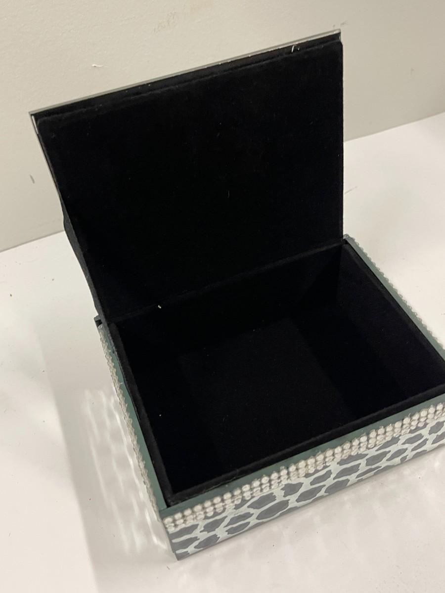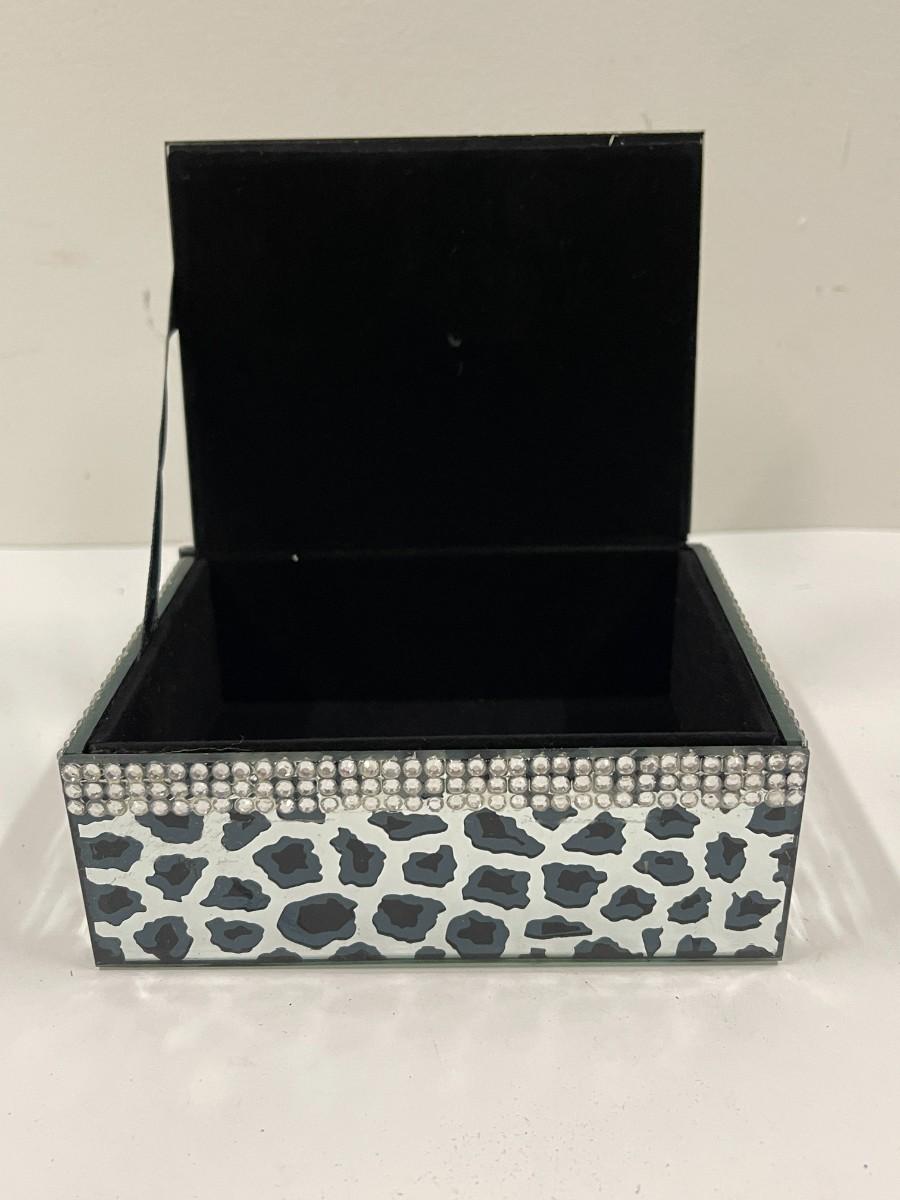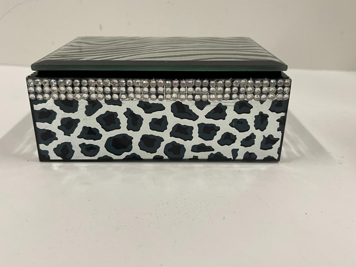 Reverse painted, hinged, mirrored jewelry/trinket box with animal print. 4" x 5" x 2". # 1228