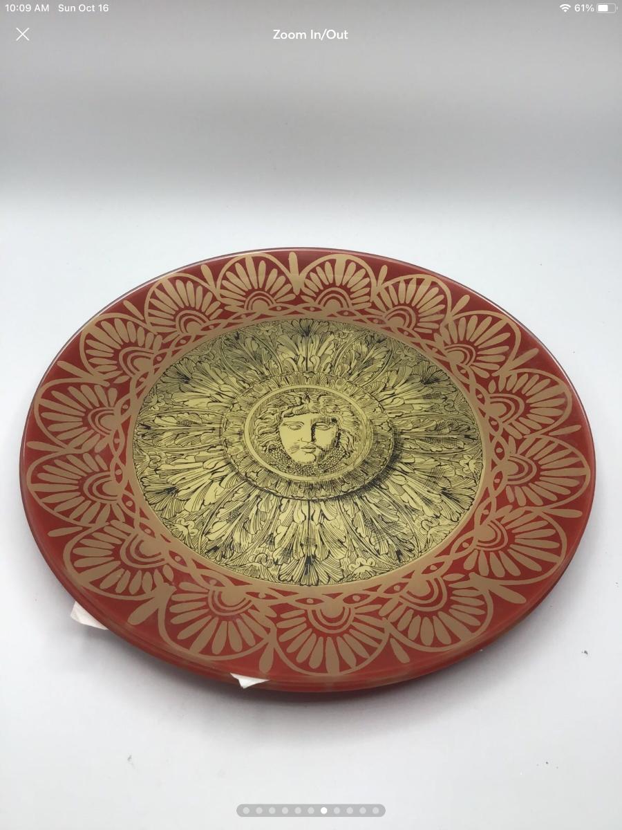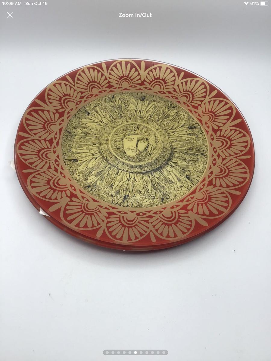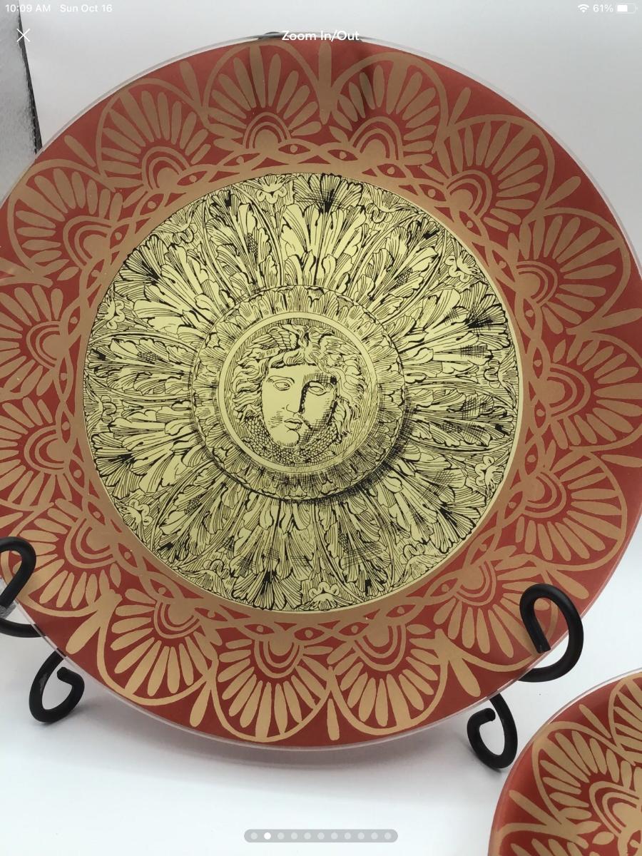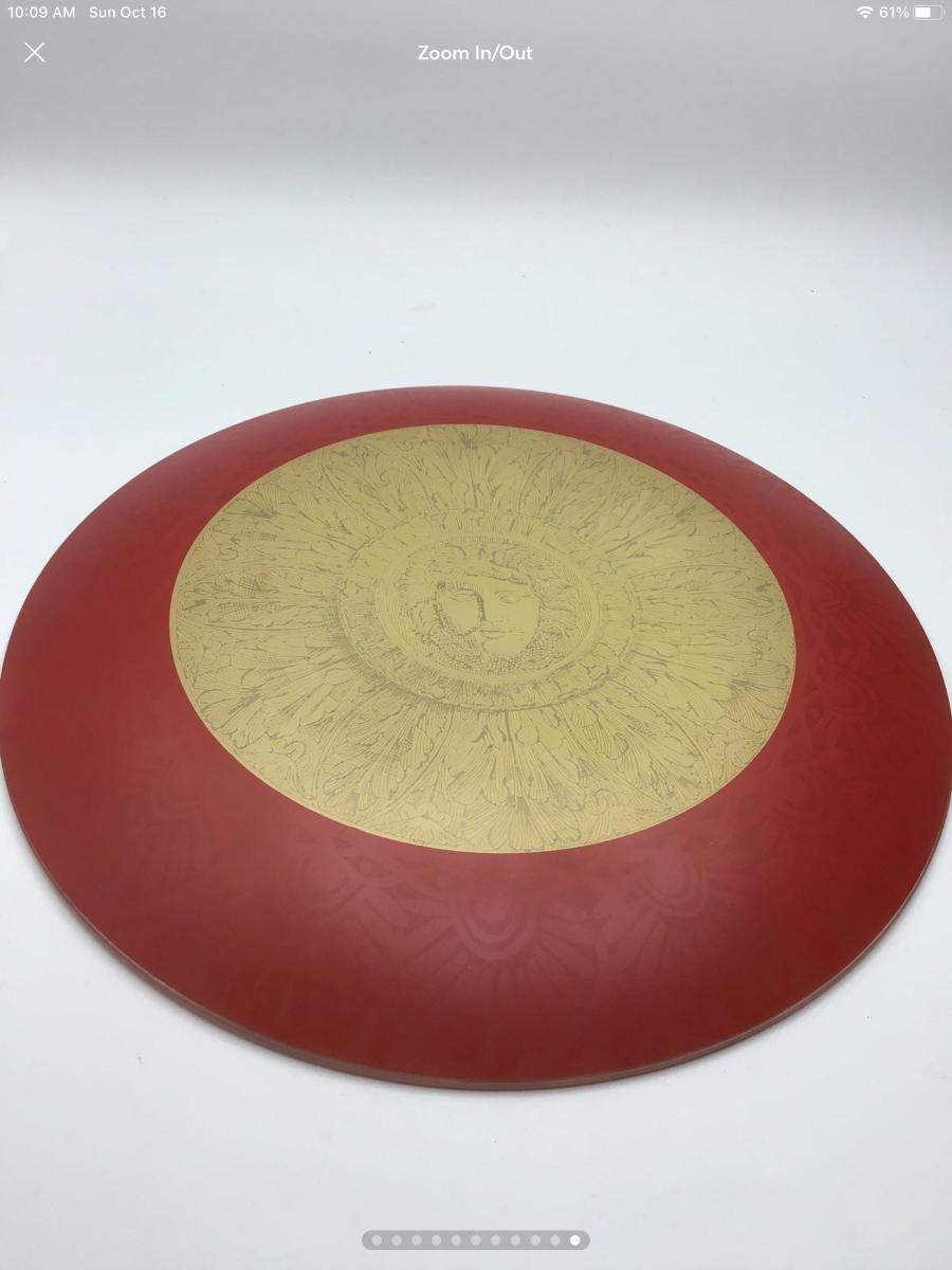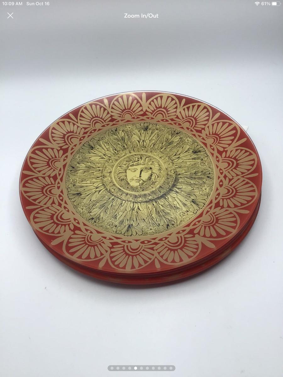 Reverse Painted Round Glass Plates Red Gold Sun Design