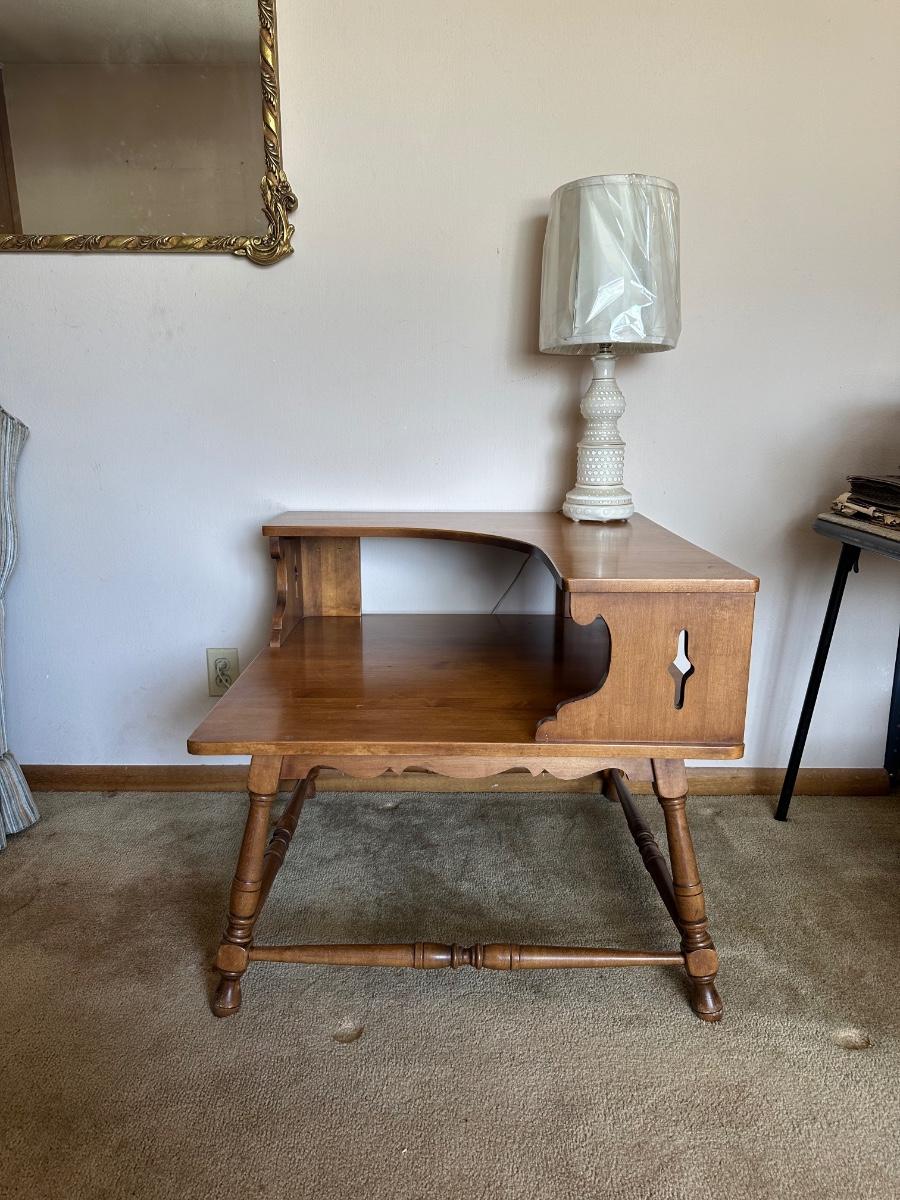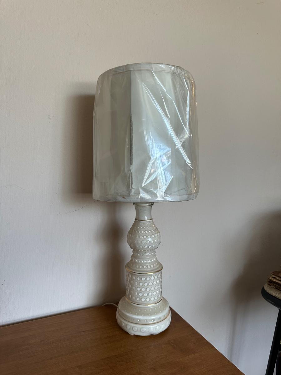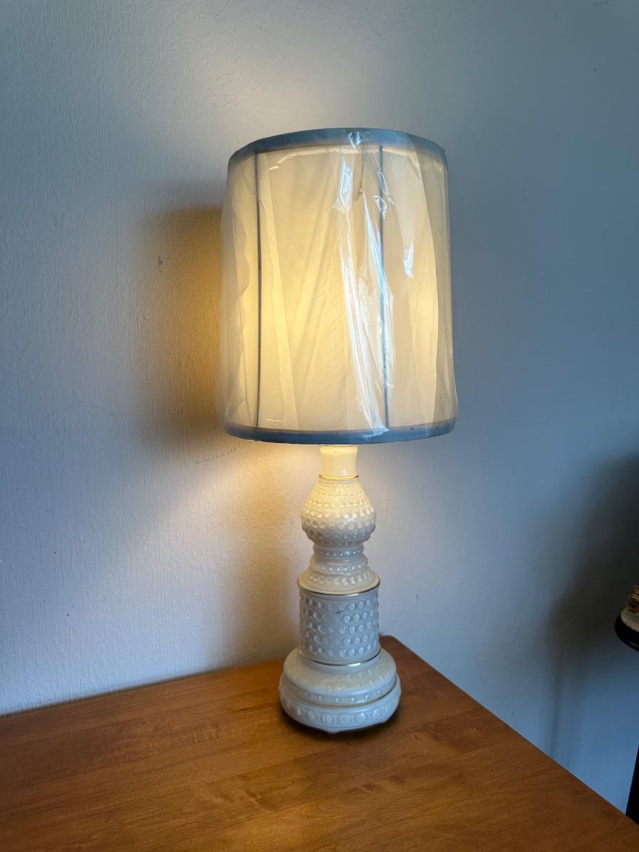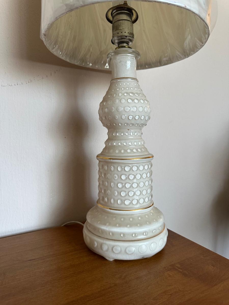 REVERSED HOBNAIL GLASS LAMP AND A MID-CENTURY 2 TIER END TABLE