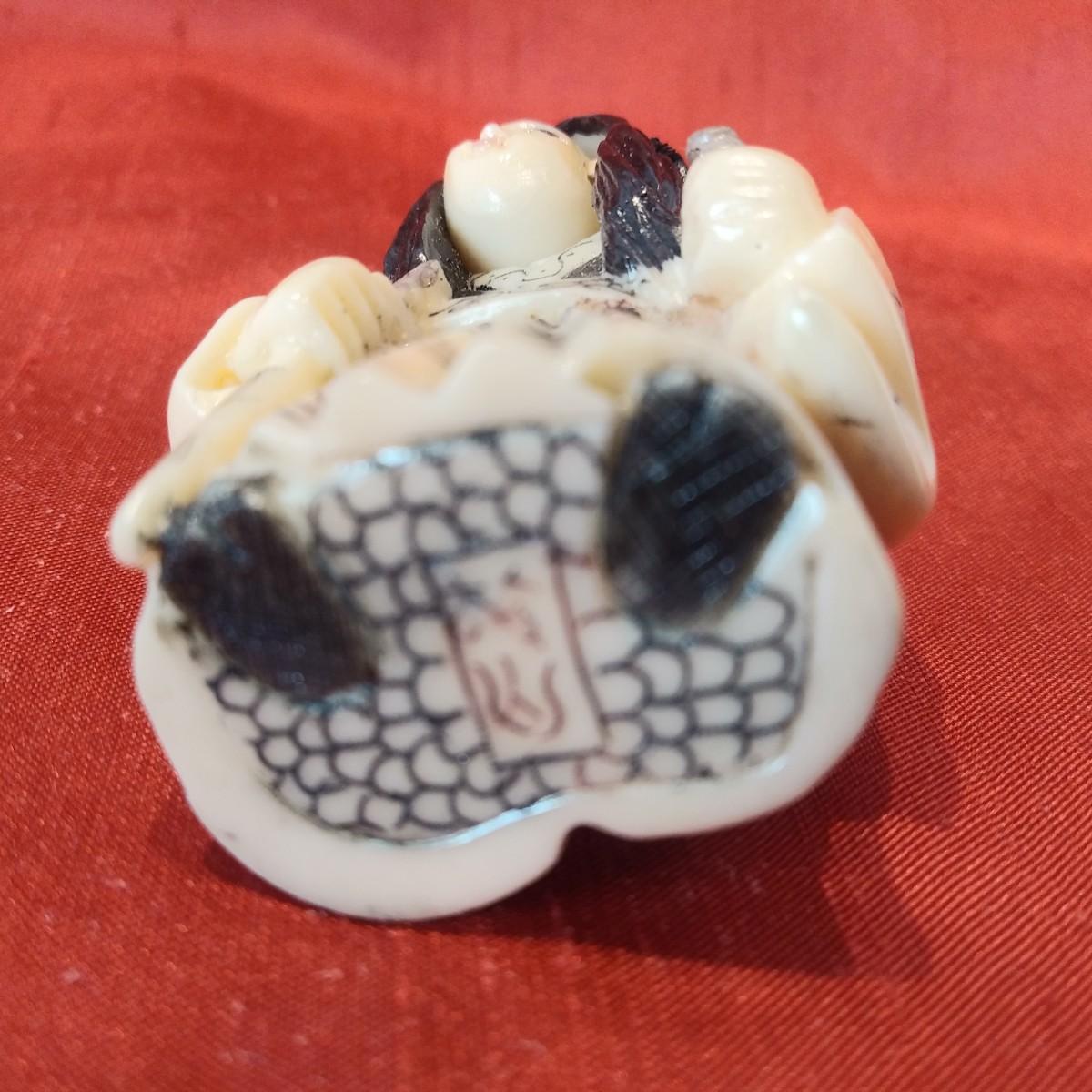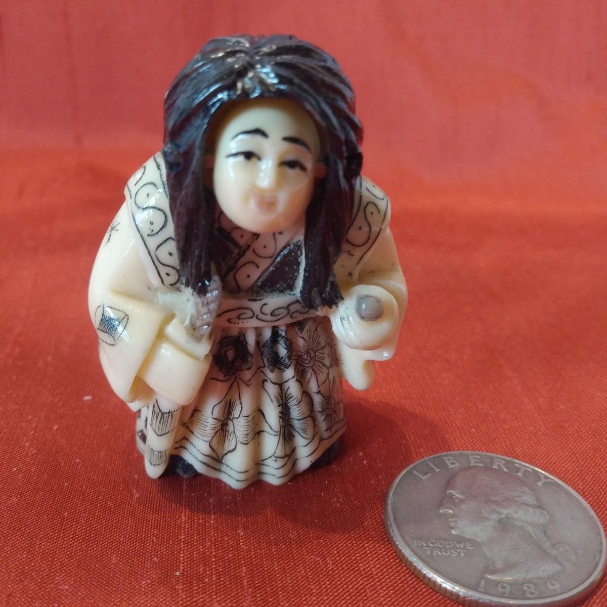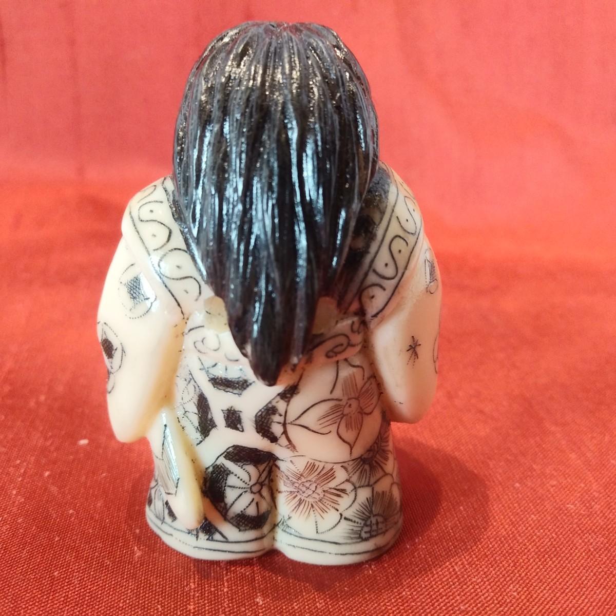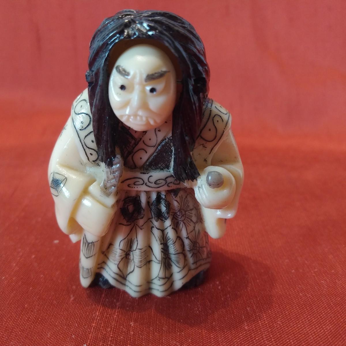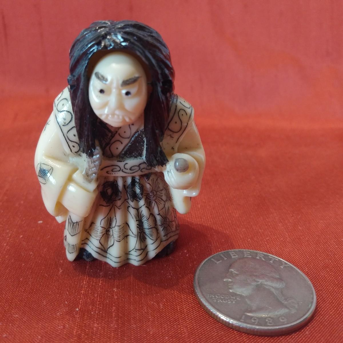 This auction lot is for a Revolving Face Netsuke. The face on this Netsuke revolves between a male as shown in the header picture to woman in the next picture. It is hand-carved and hand-painted - signed on the bottom. It is made of Ivoryite. A true conversation piece. A Netsuke is a small carved ornament, especially noted to have been made from ivory in the past but now constructed of large animal bone, resin or wood, worn as part of Japanese traditional dress as a toggle by which an article may be attached to the sash of a kimono. Many larger examples are used as display, especially those of good vintage.