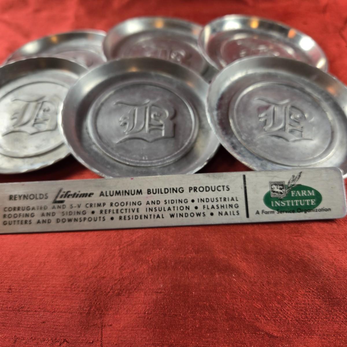 This auction lot is for Reynolds Aluminum Coasters & Ruler. This is a set of 6 Reynold's Aluminum Coasters with a B monogram. They are used but in good shape - measuring about 3.25-inches in diameter. This lot also include an Advertising Ruler - 6 inch,