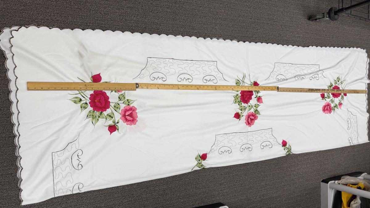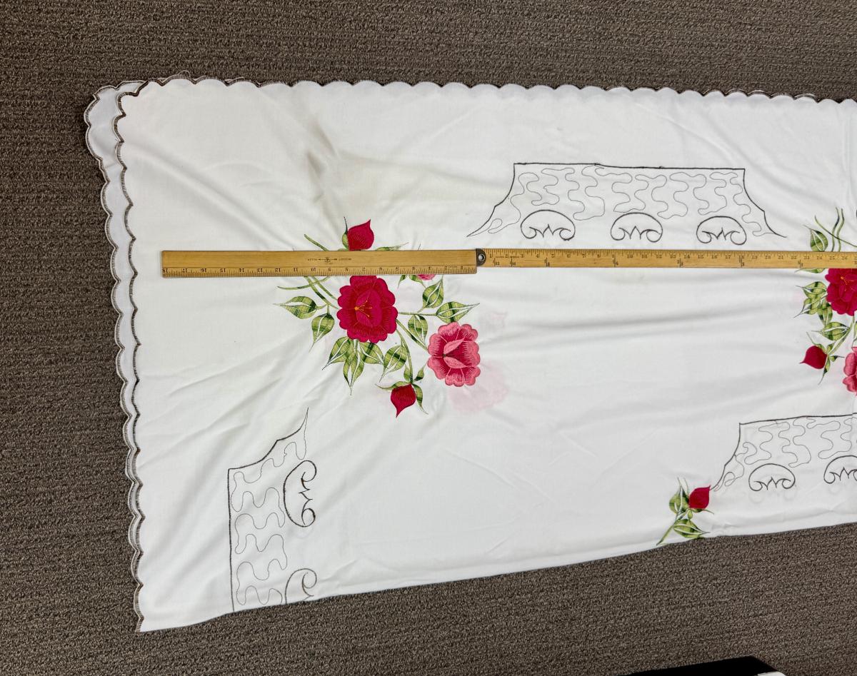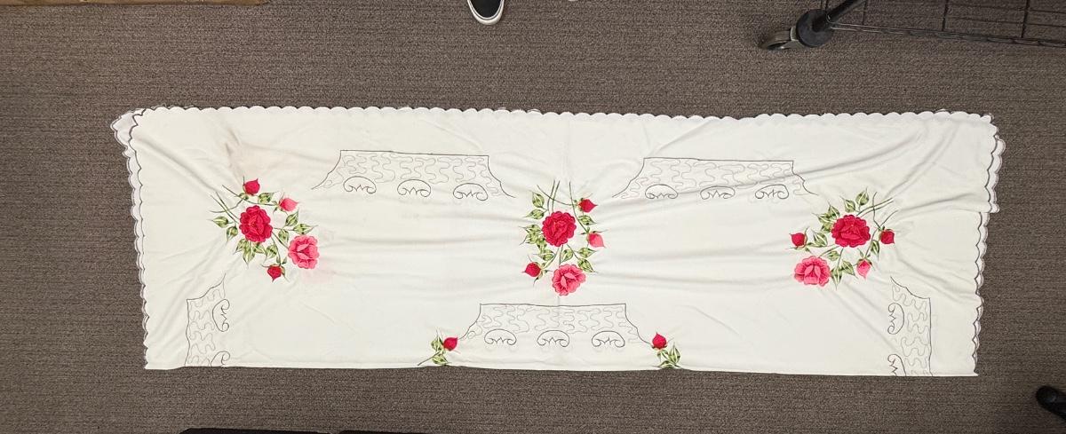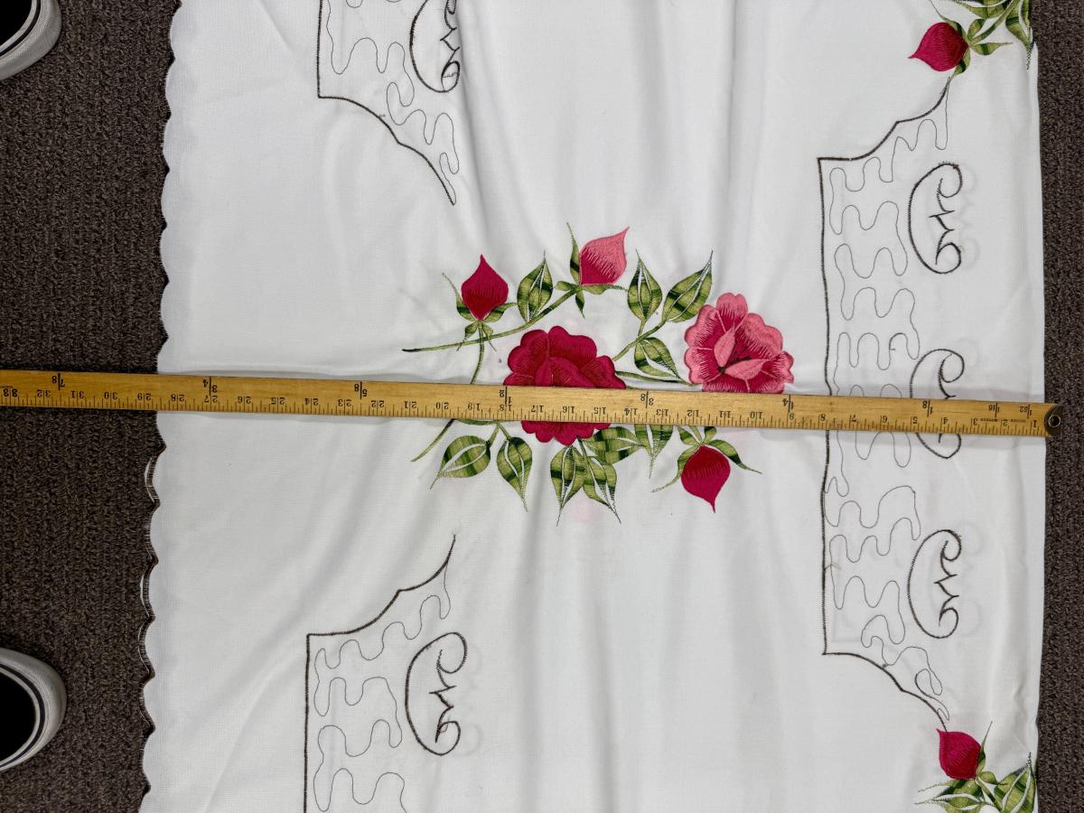 Vintage Tablecloth with Floral Design of pink roses and green leaves