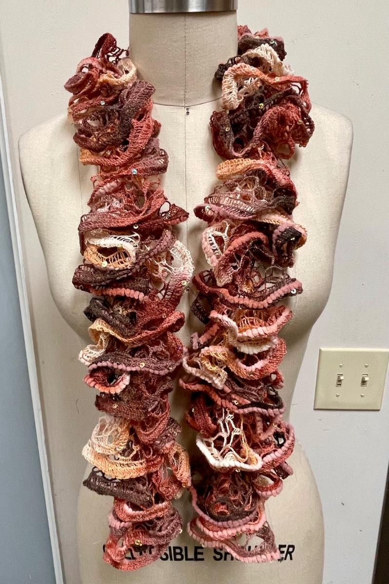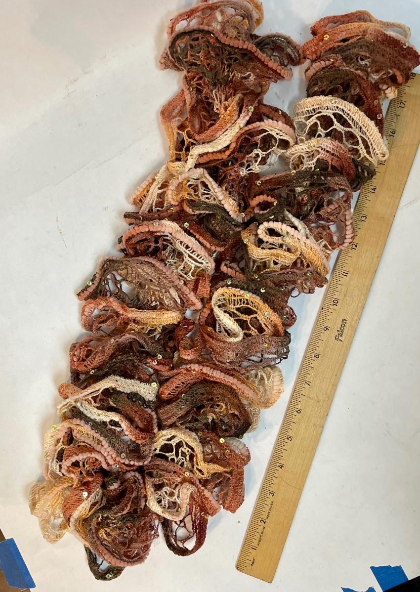 Craft project Lei. Ruffled yarn used is of many colors: pink, brown, off-white, lavender, etc.