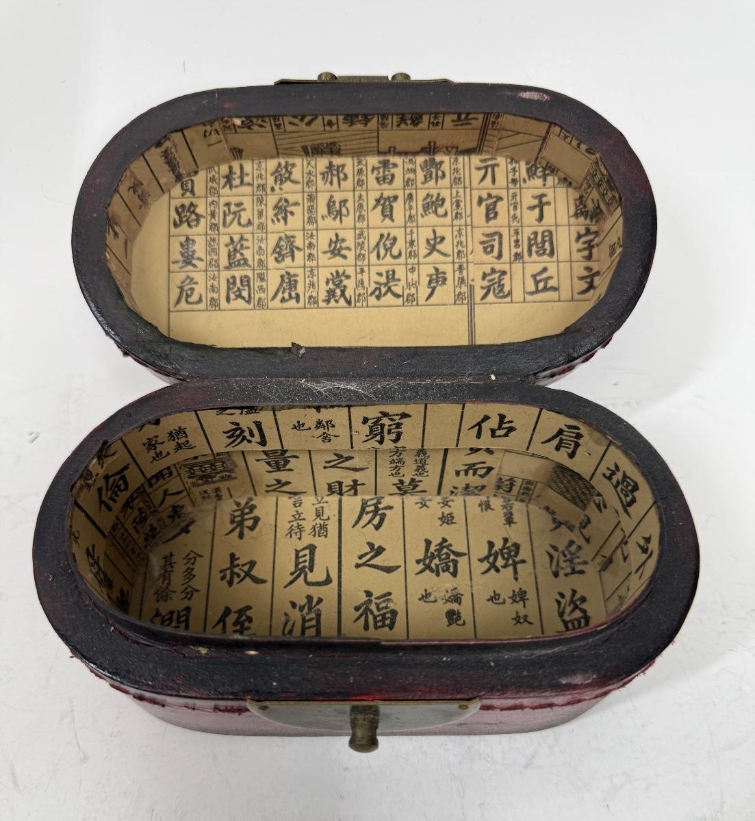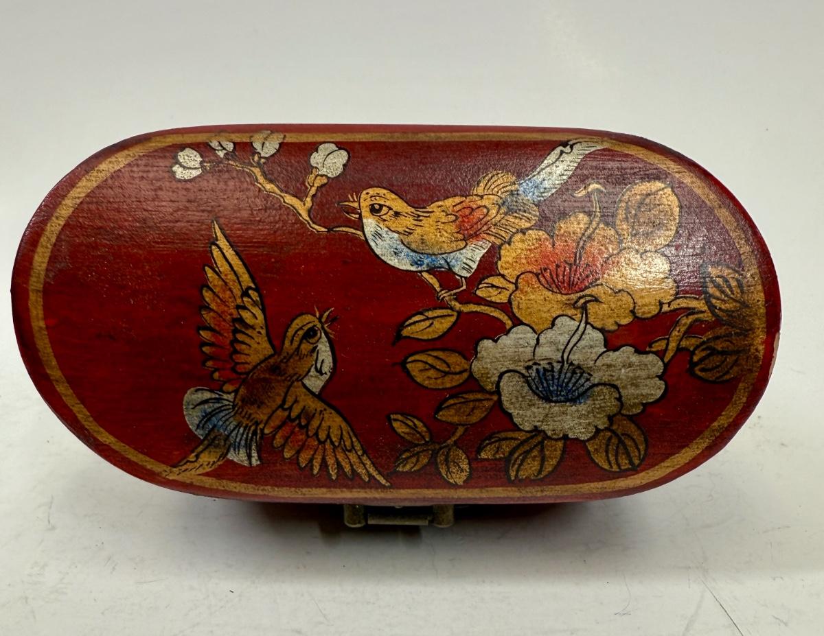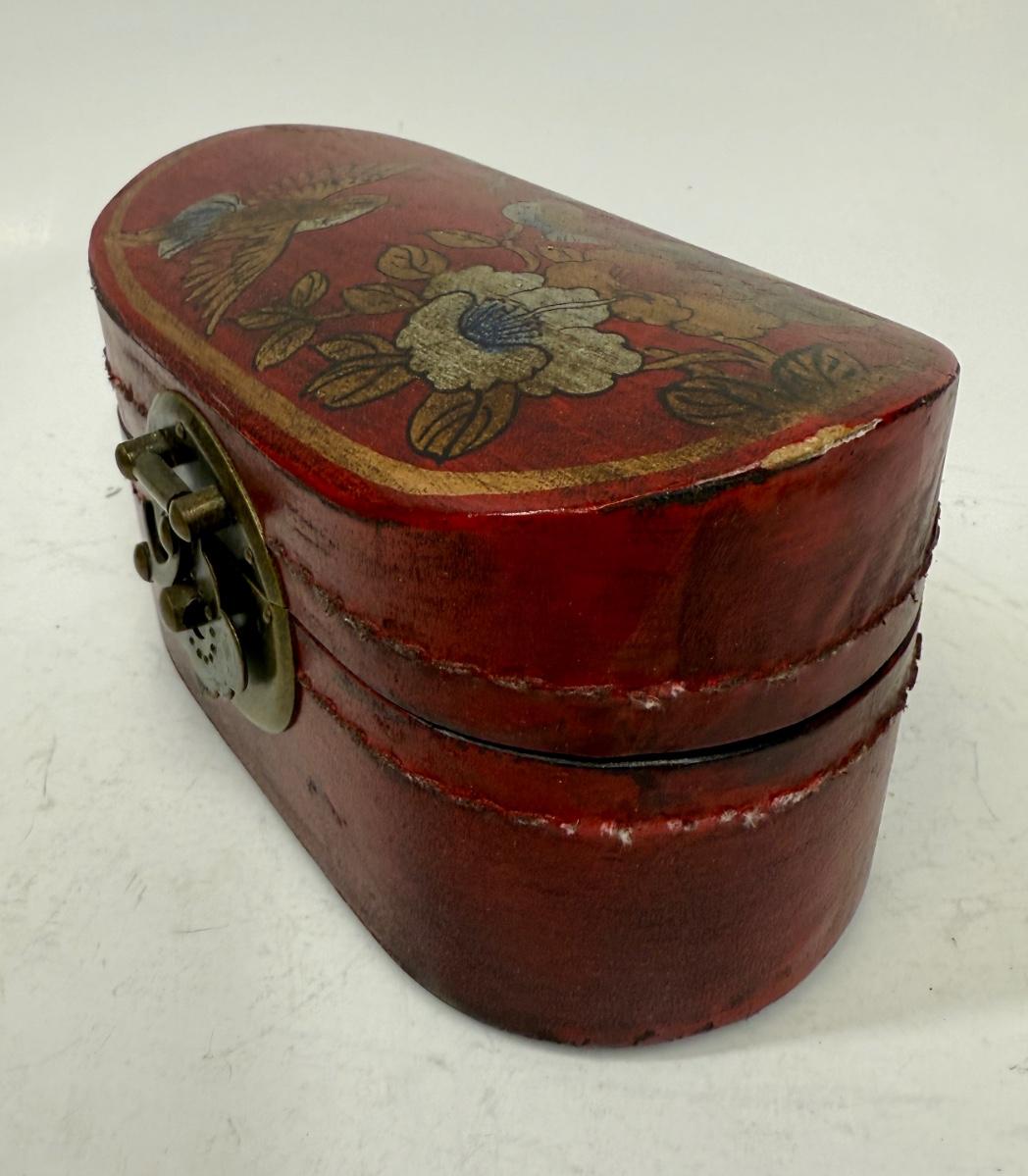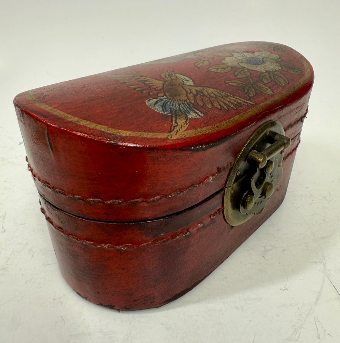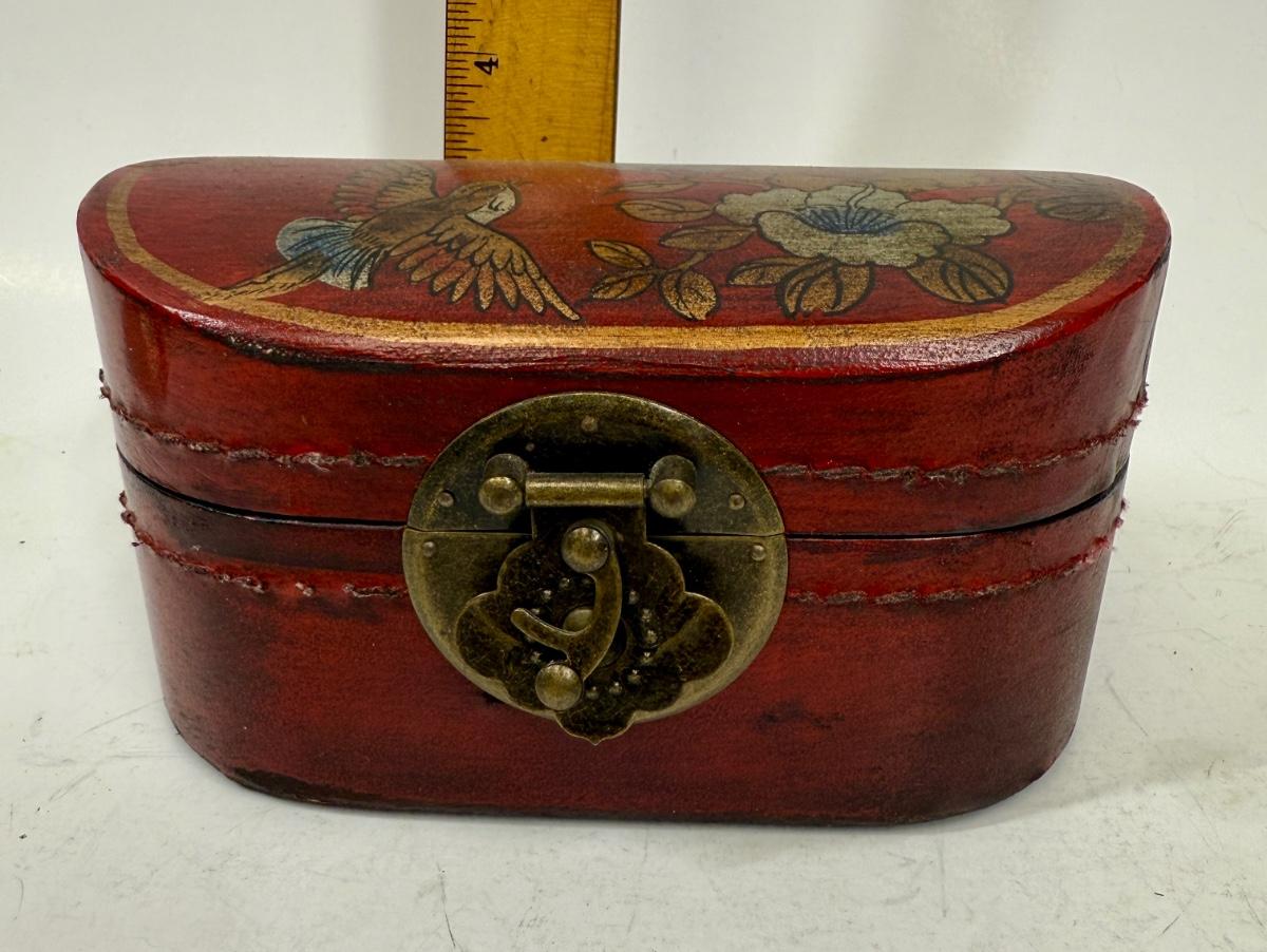 Antique Leather Bound Small Wooden Mahjong Tile Box with Bird & Flowers - no tiles