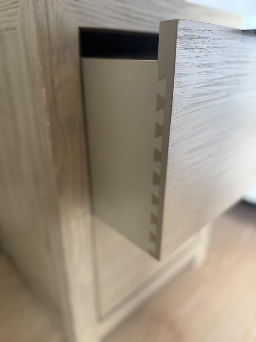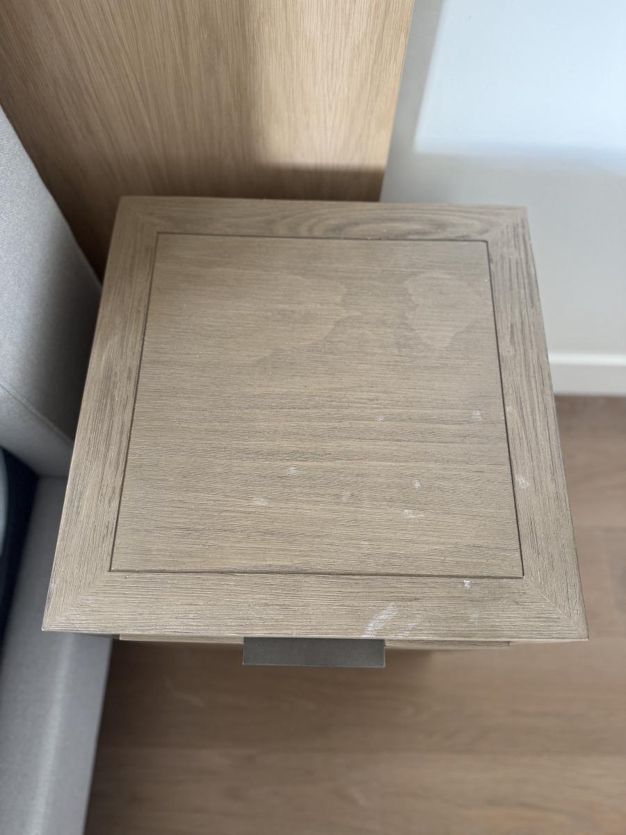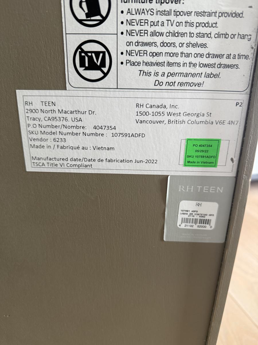The RH TEEN nightstand is a modern, minimalist piece designed for the bedroom. It features two drawers for storage and is crafted from light wood, offering a sleek finish. This fully assembled nightstand is suitable for indoor use and is part of the original collection manufactured in the 21st century. It is pre-owned.