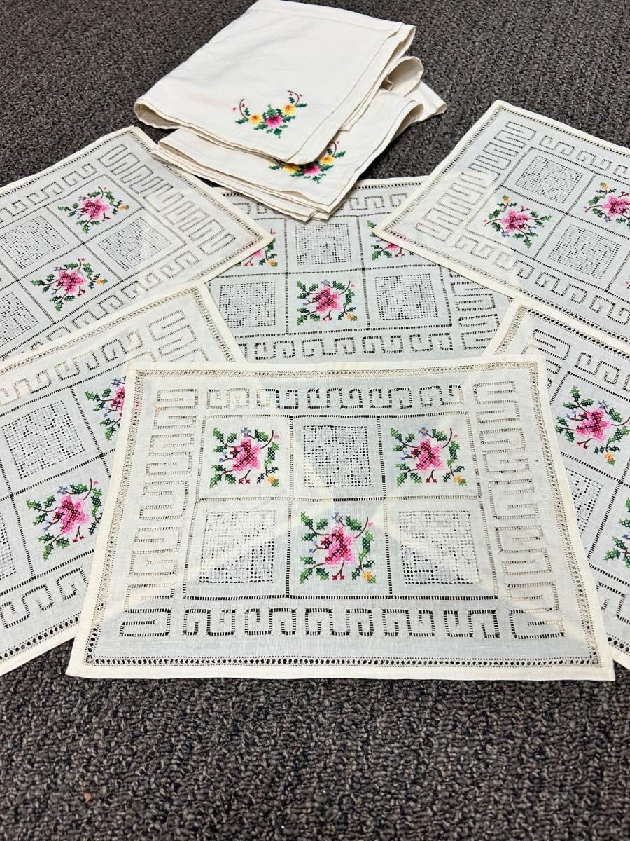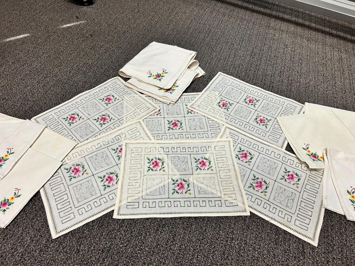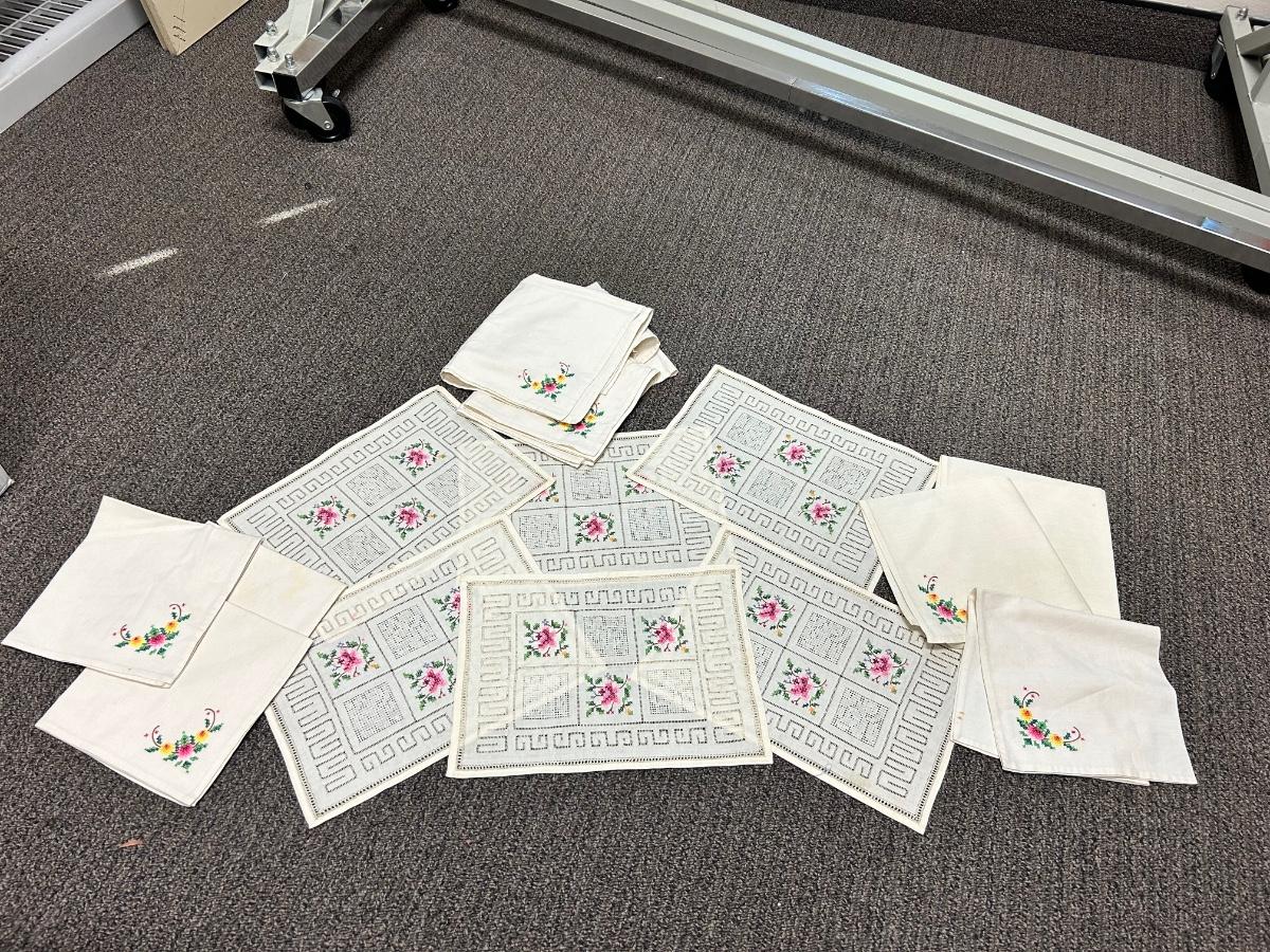 Vintage Set of 6 Pink Floral Embroidered Placemats and Colorful Flower Embroidered Napkins