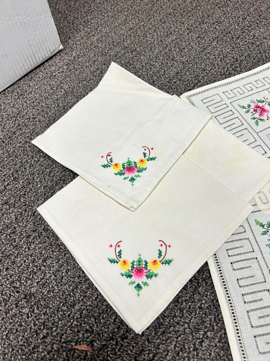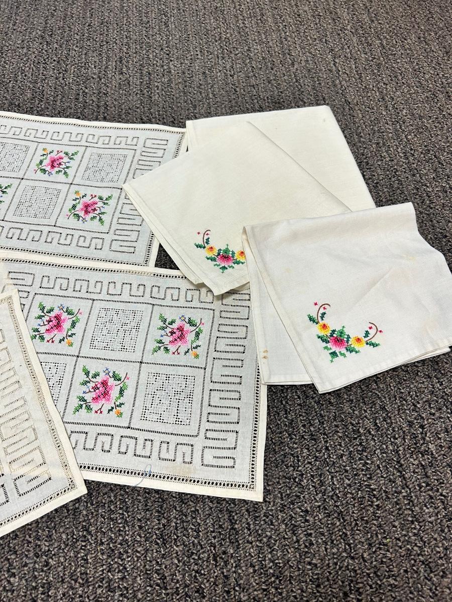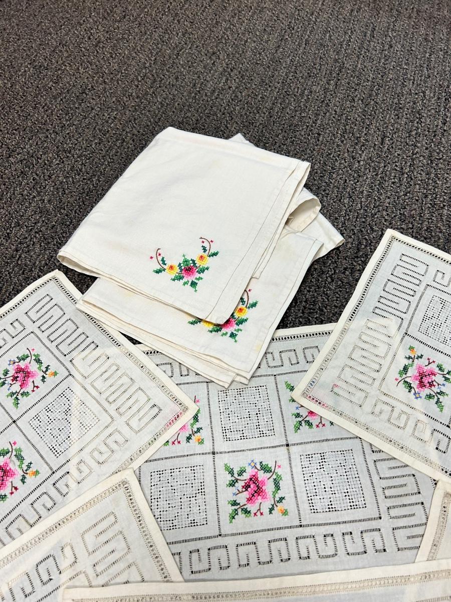 Vintage Set of 6 Pink Floral Embroidered Placemats and Colorful Flower Embroidered Napkins