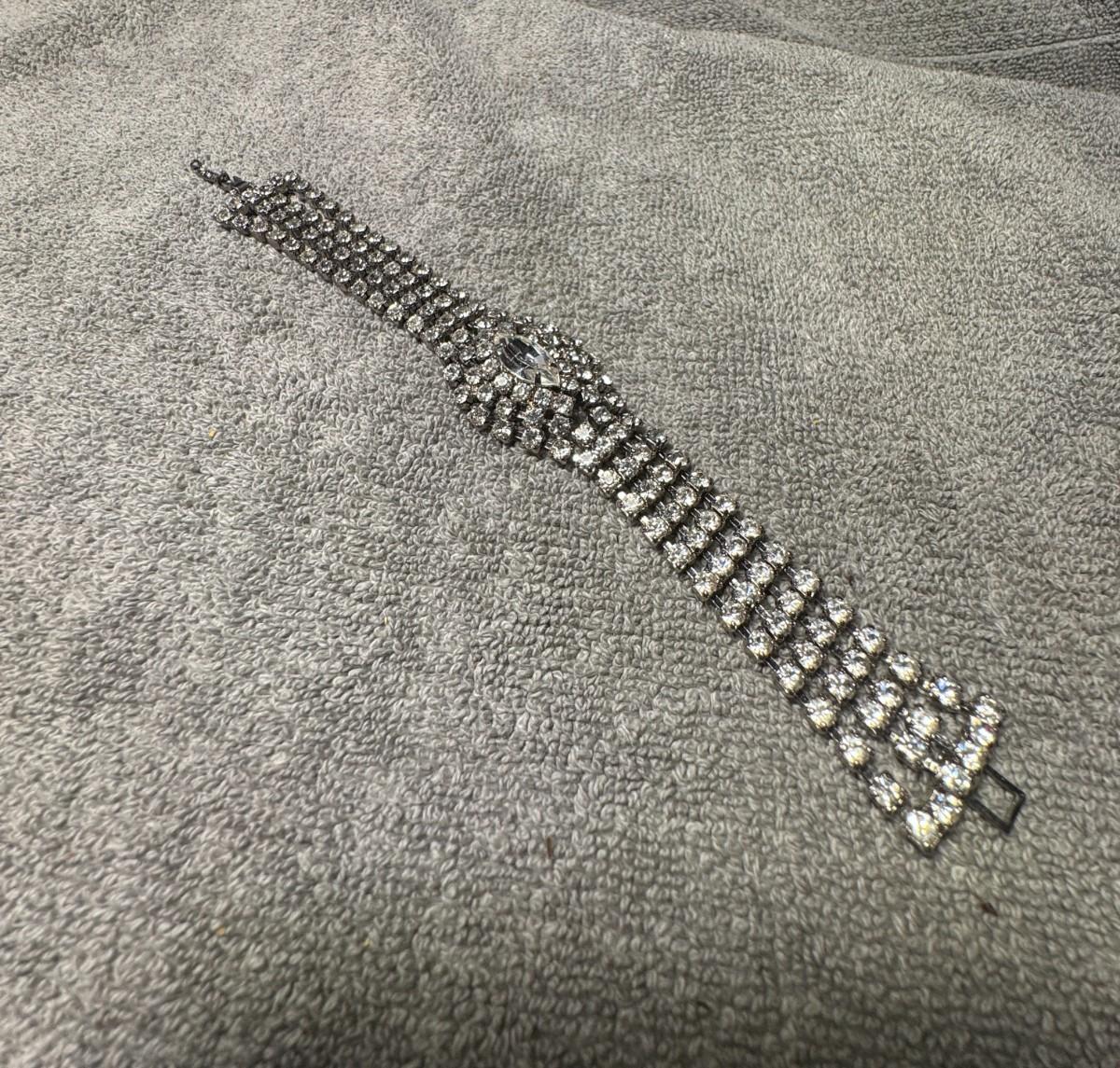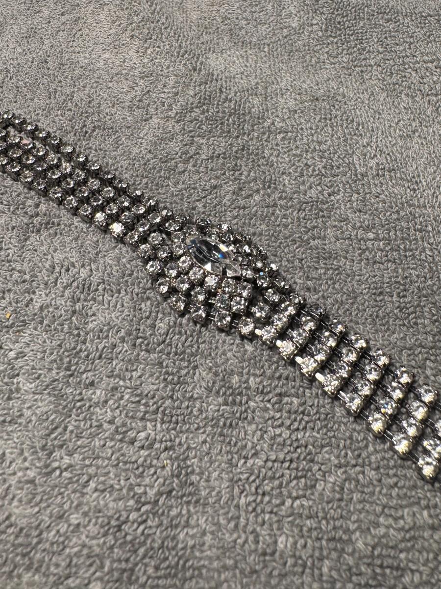 rhinestone bracelet, featuring multiple rows of clear, sparkling rhinestones and a central embellishment with a larger, possibly emerald-cut, stone.