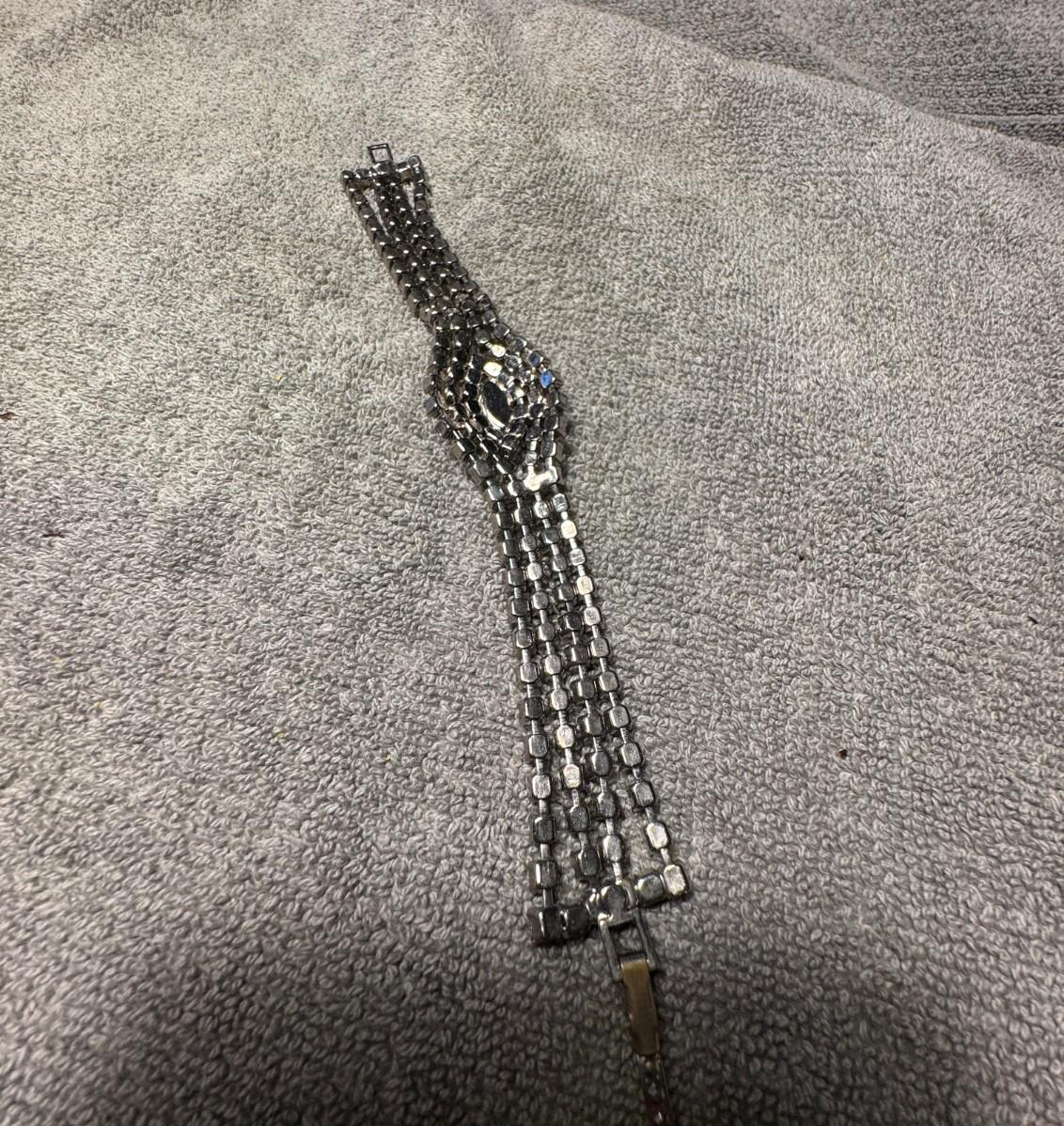 Design: The bracelet prominently displays multiple rows of prong-set rhinestones, giving it a wide and elaborate appearance, characteristic of vintage or statement jewelry.