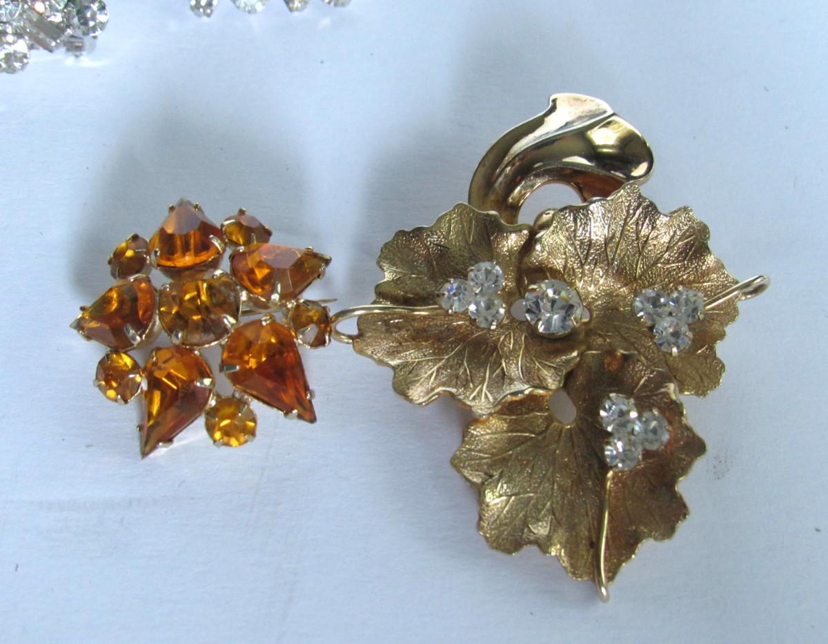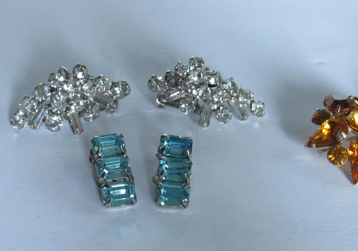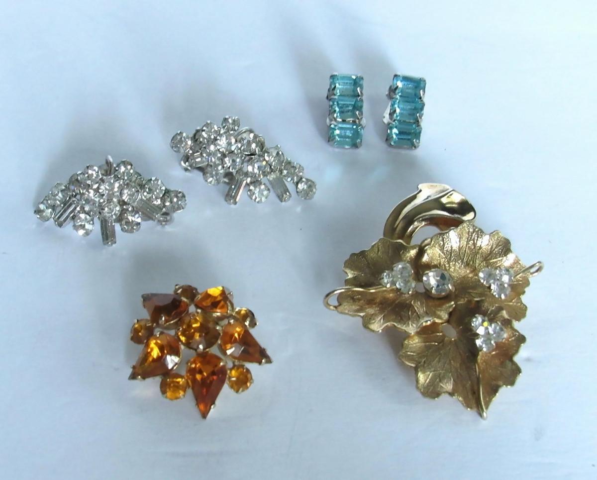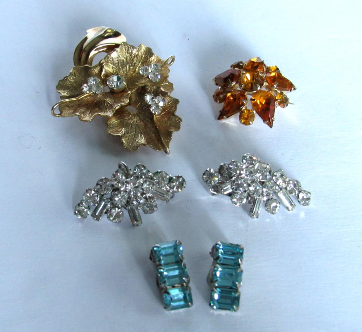 Both brooches very nice but unmarked. Clear earrings very nice and bright but unmarked. The blue earrings are nice and are marked Weiss.