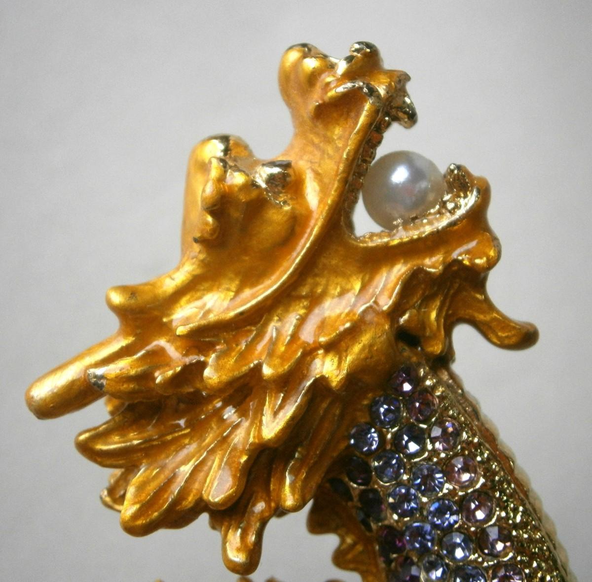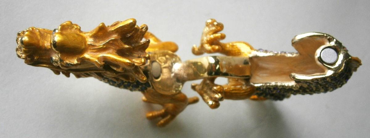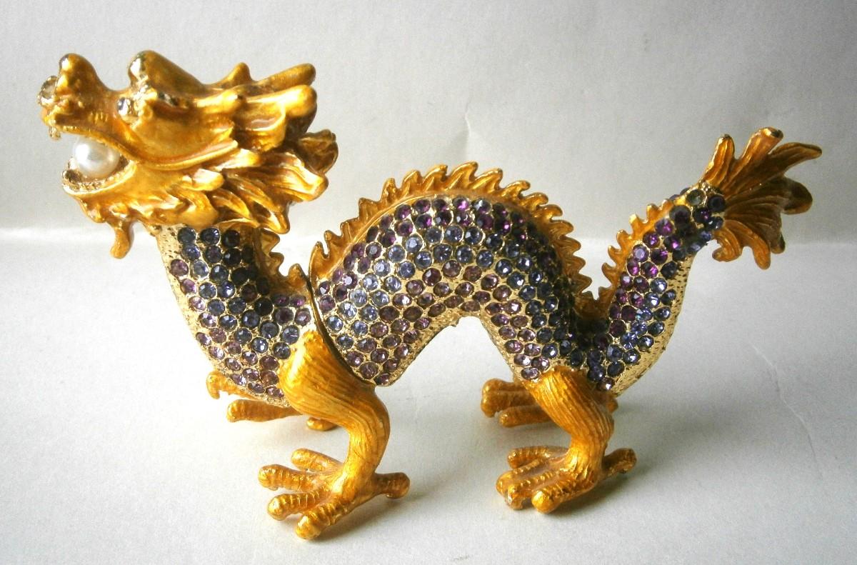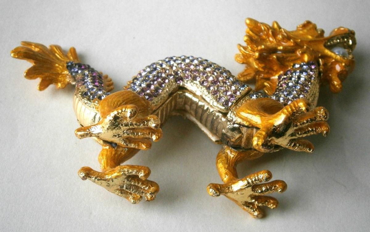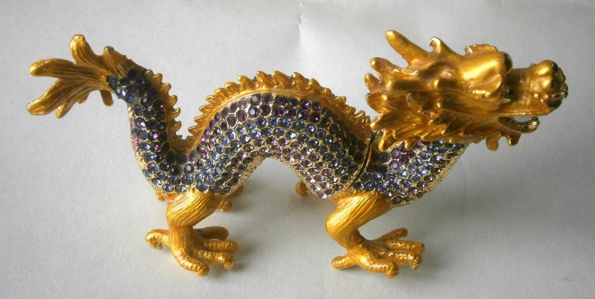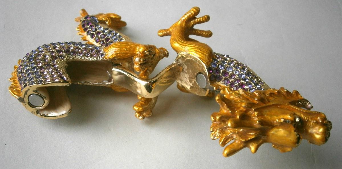 Rhinestone Dragon with Pearl in mouth (Box ?), 4 3/4 in. long, die cast metal with rhinestones and faux pearl, held shut by magnets. Dragon with pearl is a lucky Chinese symbol. No markings.
